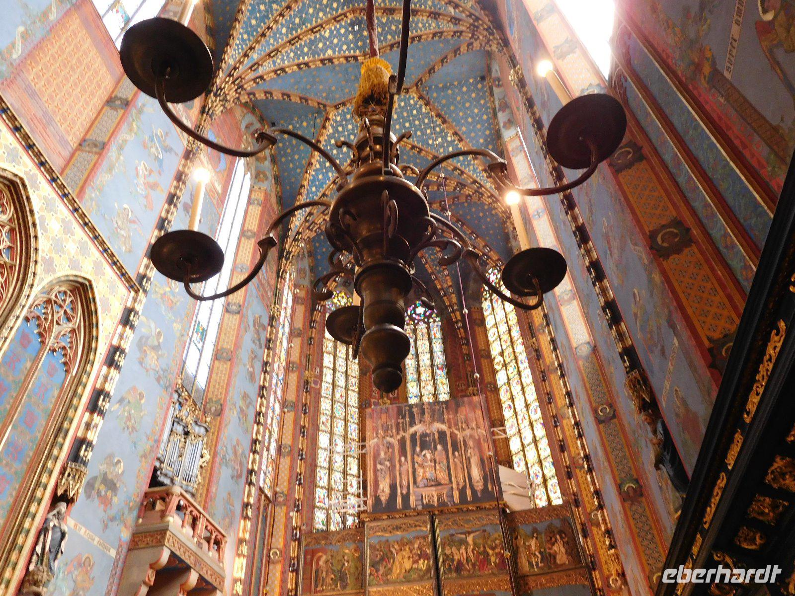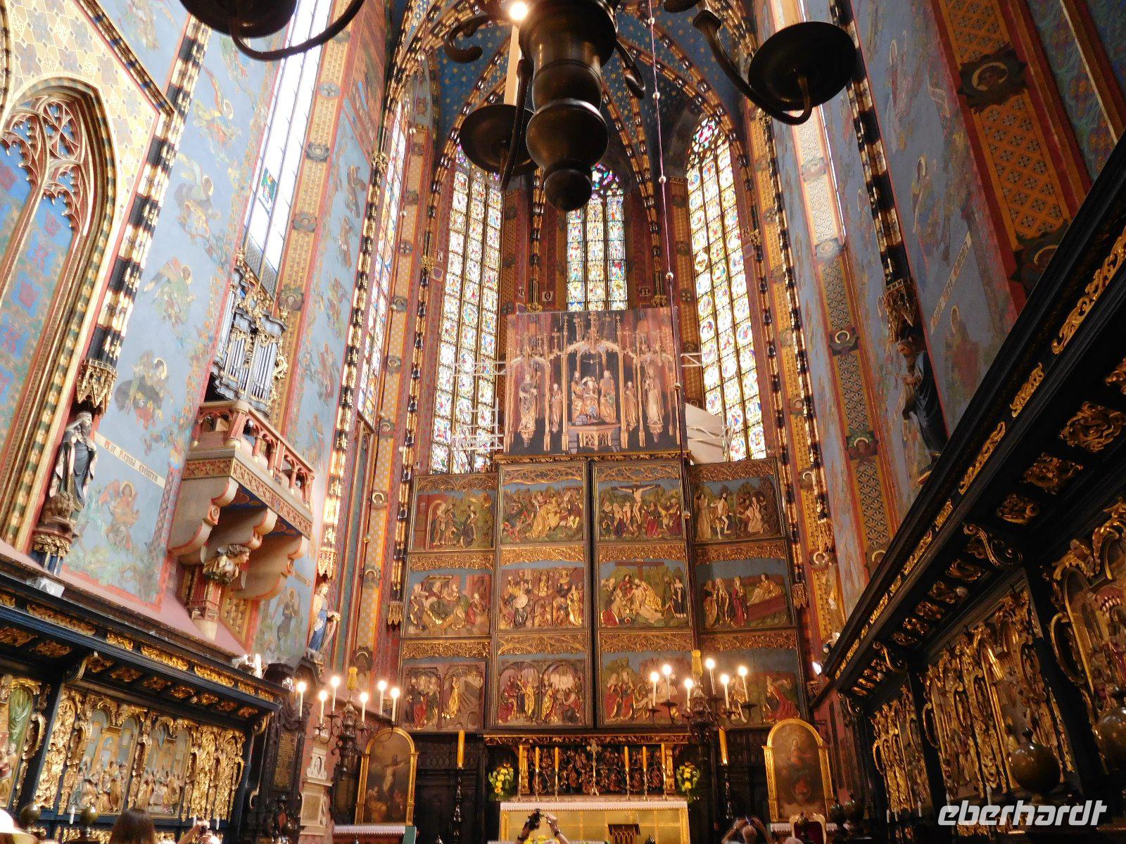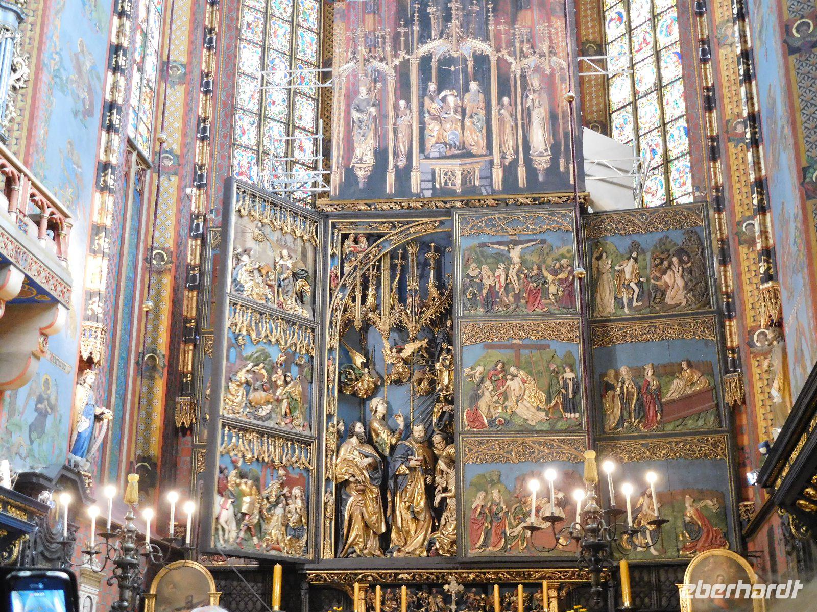 Nun spazierten wir weiter zur Universität zu Krakau, genauer dem Collegium Maius, wo wir das Spiel des Uhrwerkes mit beweglichen Figuren beobachten konnten. Der Weg führte uns weiter zum Papstfenster und Franziskanerkloster zurück bis zur Marienkirche, wo wir der Öffnung des kostbaren Veit Stoß Altares beiwohnten.