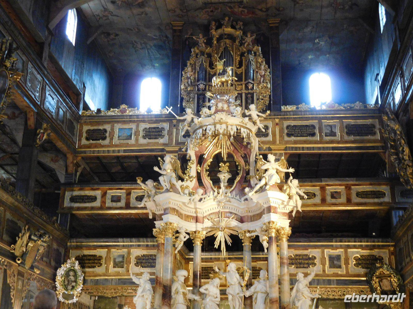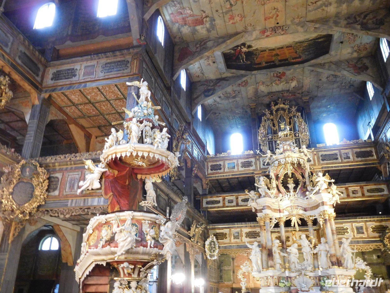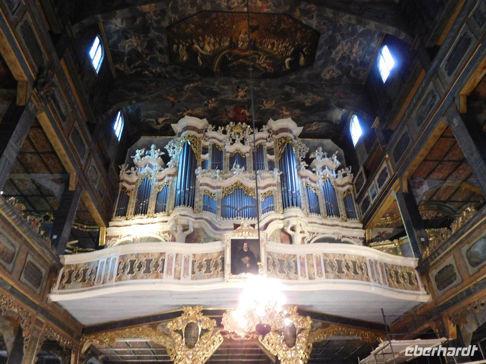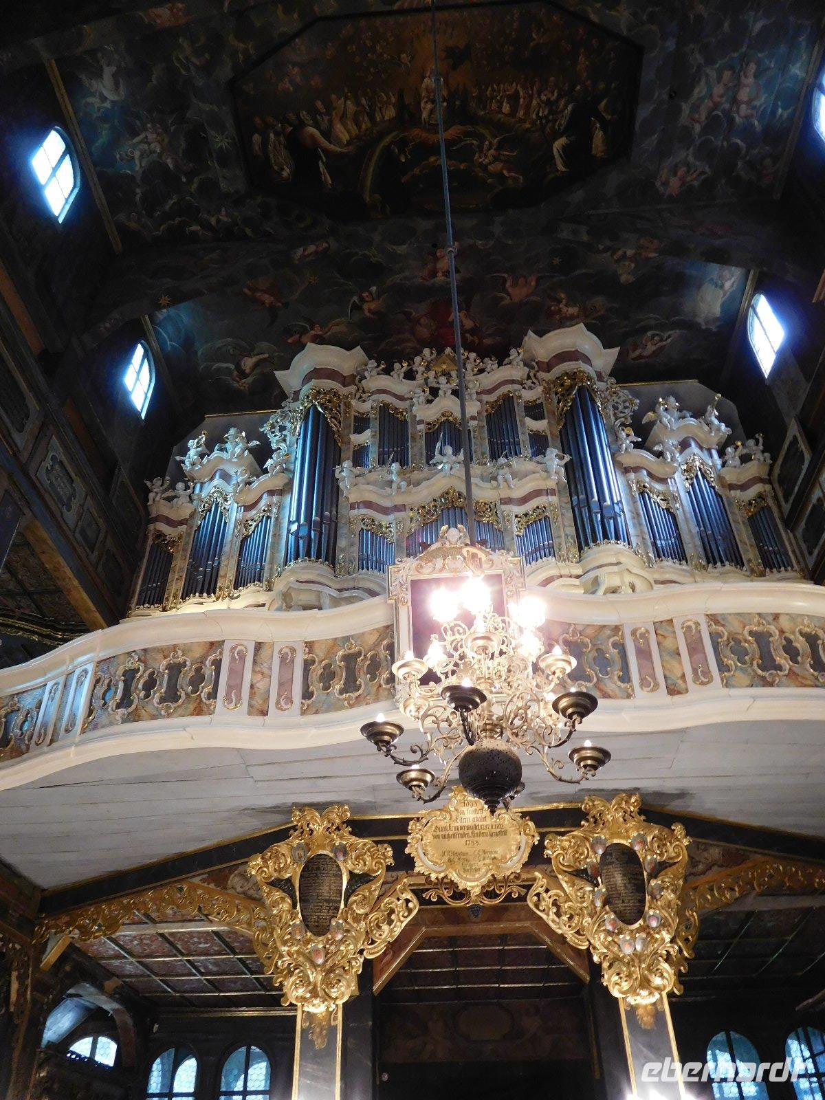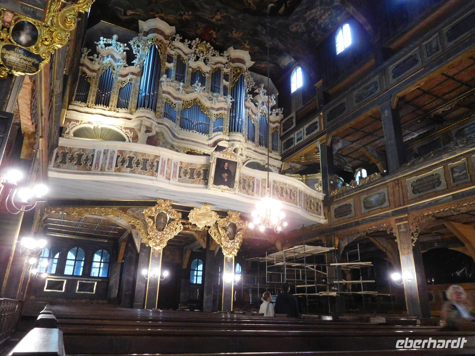 Bevor unsere Reise zu Ende ging, besuchten wir die imposante Friedenskirche von Schweidnitz und erlebten endlich Regen in Hirschberg. Die Kirche in Schweidnitz durfte nach dem Dreißigjährigen Krieg erbaut, in einer Zeit, als die Gegenreformation sehr stark die protestantischen Kirchen zurückzudrängen versuchten. Nur hier und zwei anderen Orten in Schlesien durften diese Kirchen unter strengsten Bauauflagen gebaut werden - kein Stein durfte verbaut werden. Also wurde eine opulente Fachwerkkirche erbaut mit einem barocken Altar und einer Orgel, die in ihren Details das Auge der Besucher für Stunden einfangen konnte.