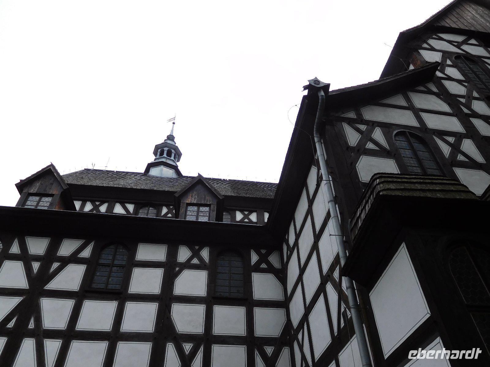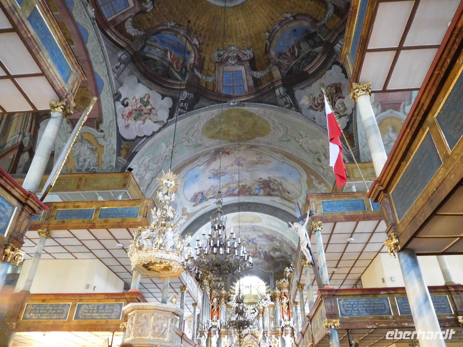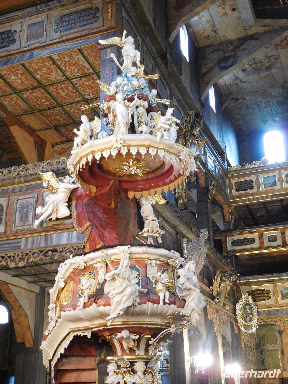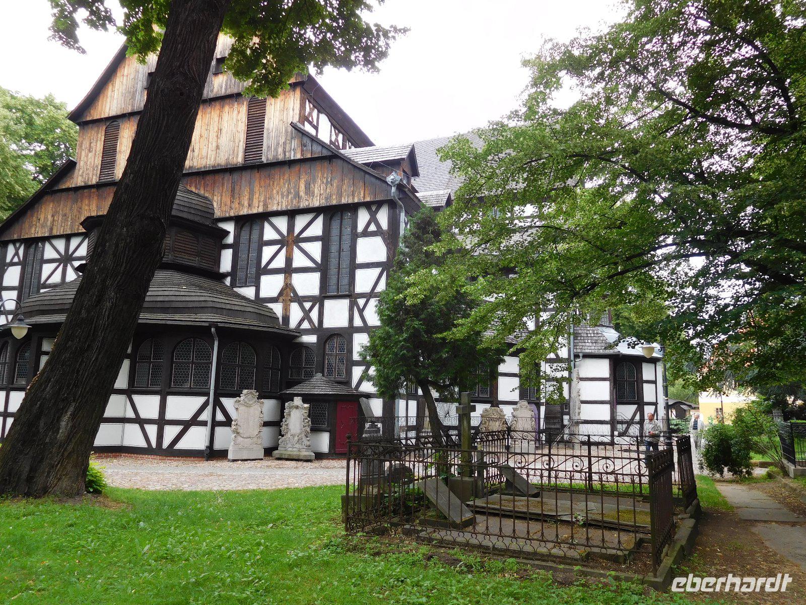 Bevor unsere Reise zu Ende ging, besuchten wir die imposante Friedenskirche von Schweidnitz und erlebten endlich Regen in Hirschberg. Die Kirche in Schweidnitz durfte nach dem Dreißigjährigen Krieg erbaut, in einer Zeit, als die Gegenreformation sehr stark die protestantischen Kirchen zurückzudrängen versuchten. Nur hier und zwei anderen Orten in Schlesien durften diese Kirchen unter strengsten Bauauflagen gebaut werden - kein Stein durfte verbaut werden. Also wurde eine opulente Fachwerkkirche erbaut mit einem barocken Altar und einer Orgel, die in ihren Details das Auge der Besucher für Stunden einfangen konnte.
