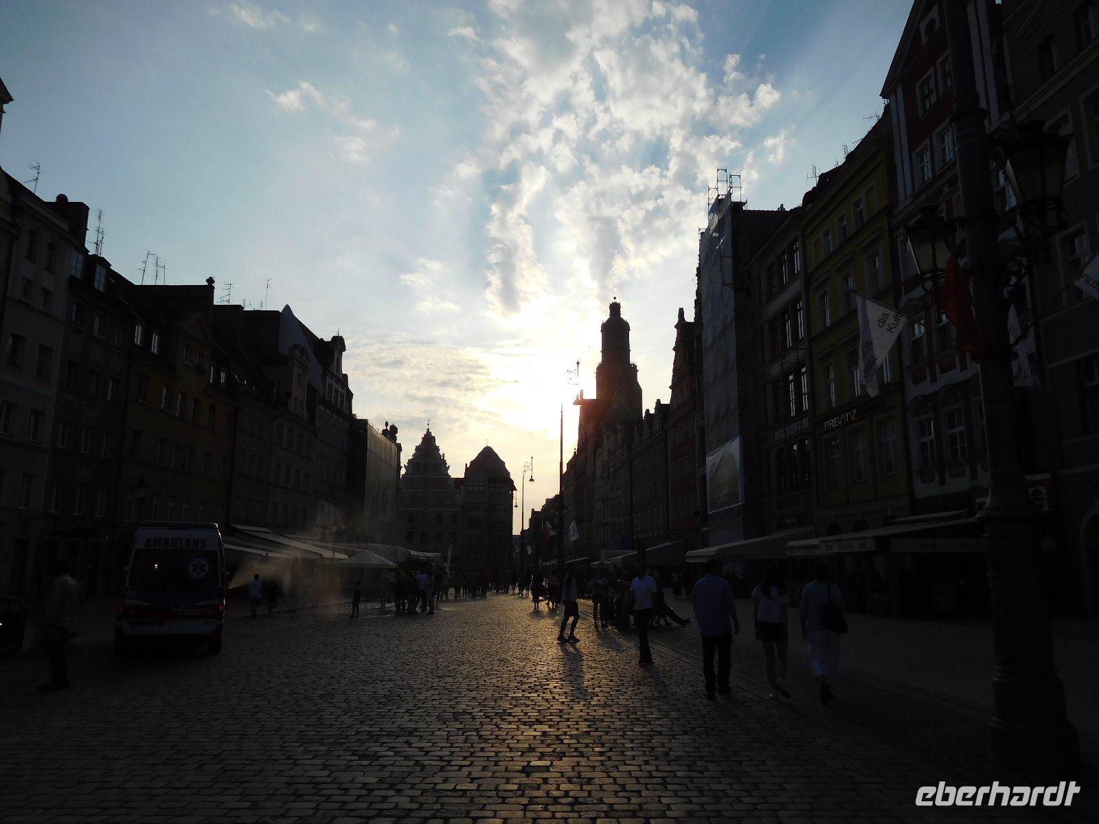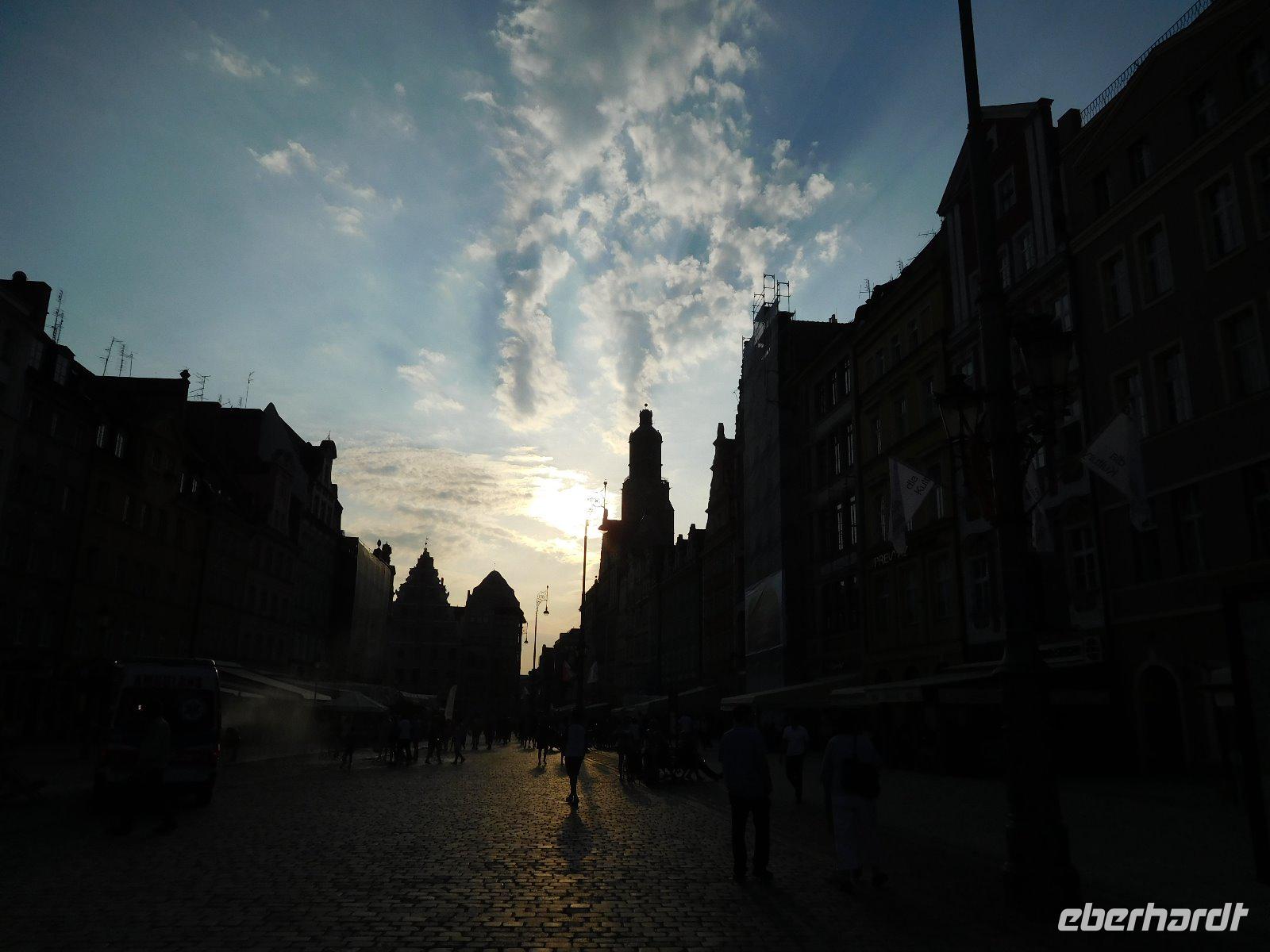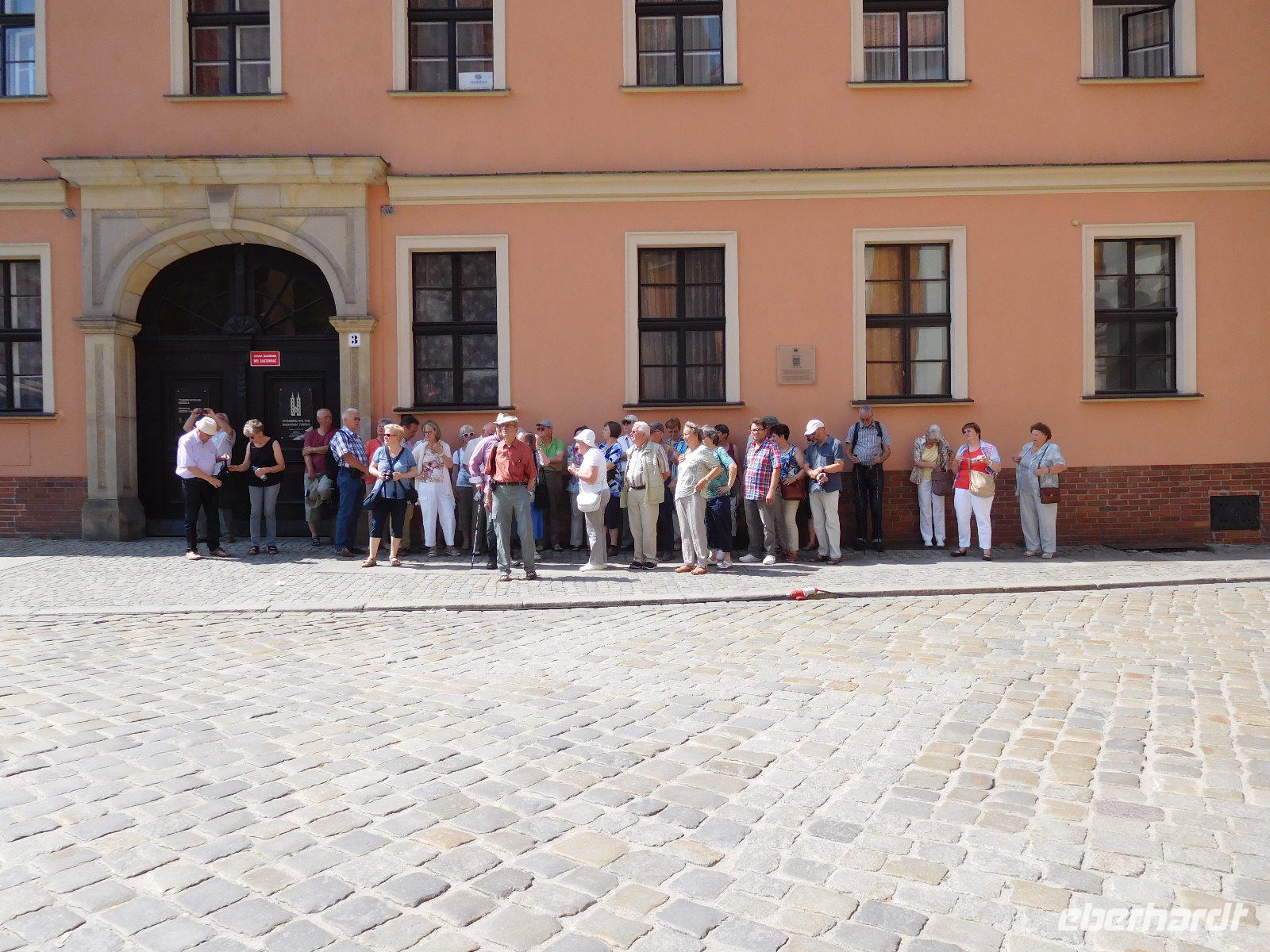 Schon war es Zeit für die Fahrt nach Breslau, wo wir am Abend ankamen. Wer wollte, konnte einen Stadtspaziergang über Rynek und Plac Solny entlang der so bunt wie reich verzierten Fassaden unternehmen. Beim Jahrmarkt auf dem Rynek trennten sich viele Wege zu einer der zahlreichen Gaststätten. Auch Abends war es warm genug für einen ausgiebigen Spaziergang entlang der Oder und über die Sandinsel, auf der sich viele Breslauer für einen geselligen Abend getroffen hatten. Hier bot sich der perfekte Blick auf das Universitätshauptgebäude und das Ossolineum am Abend. Über die Sandbrücke und an der Hala Targowa vorbei führte der Weg wieder durch die Breslauer Altstadt bis zum Hotel zurück.