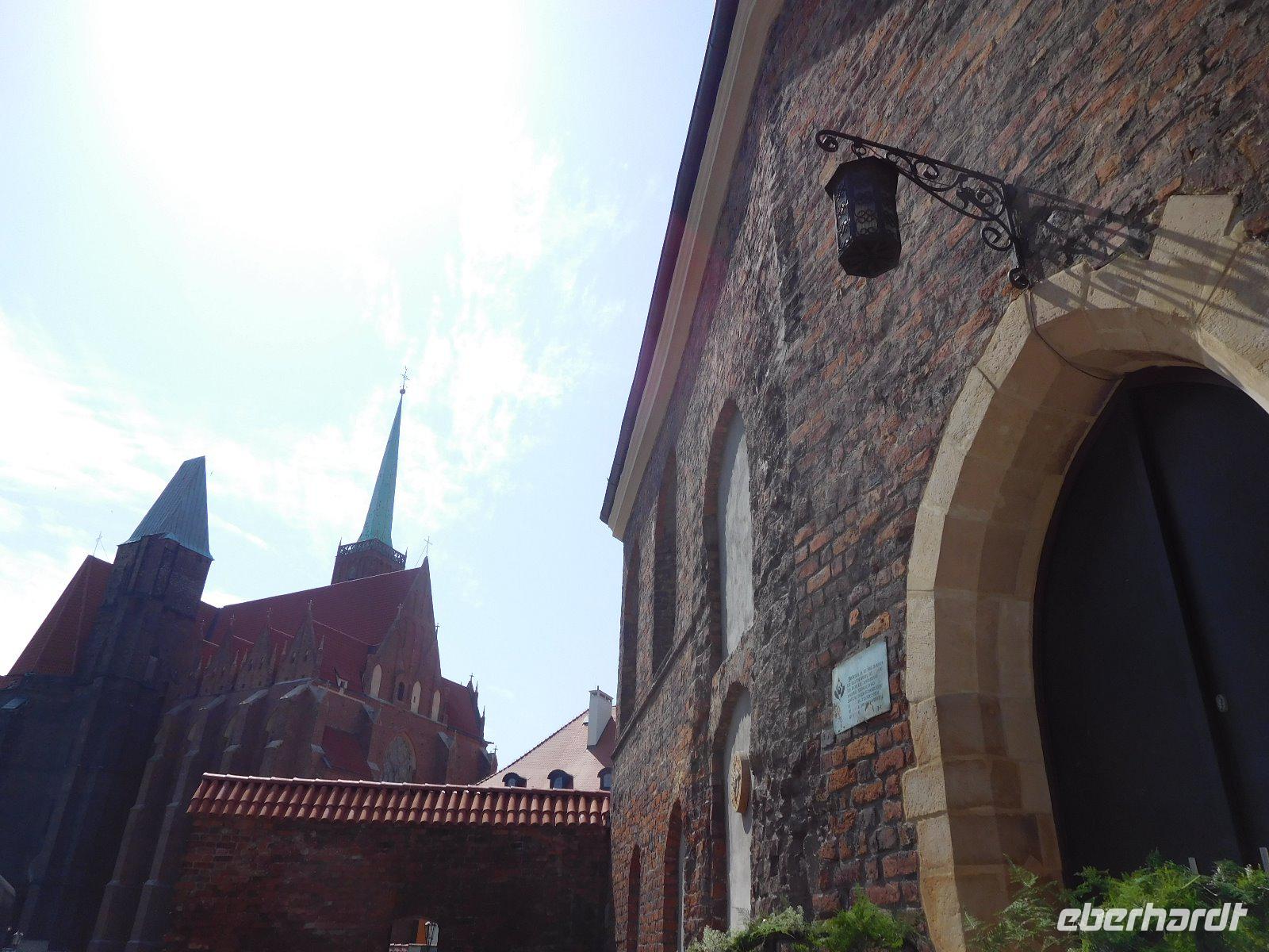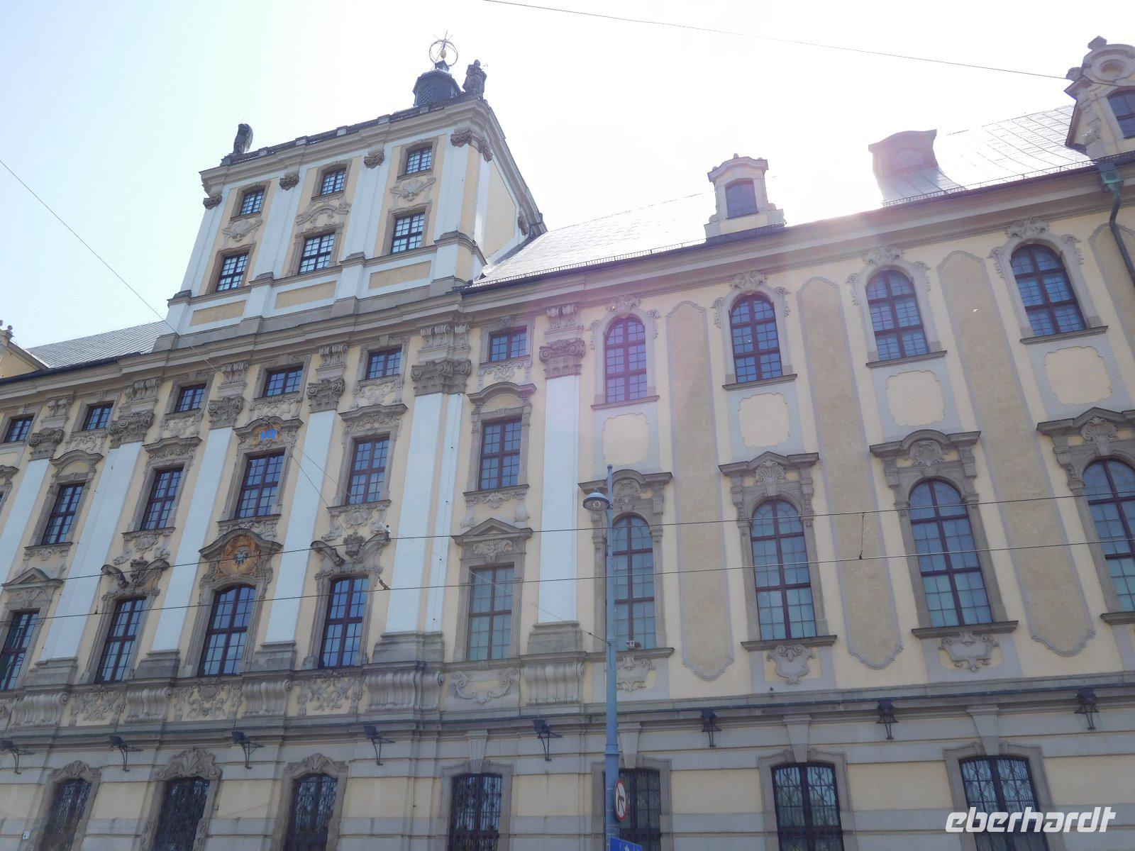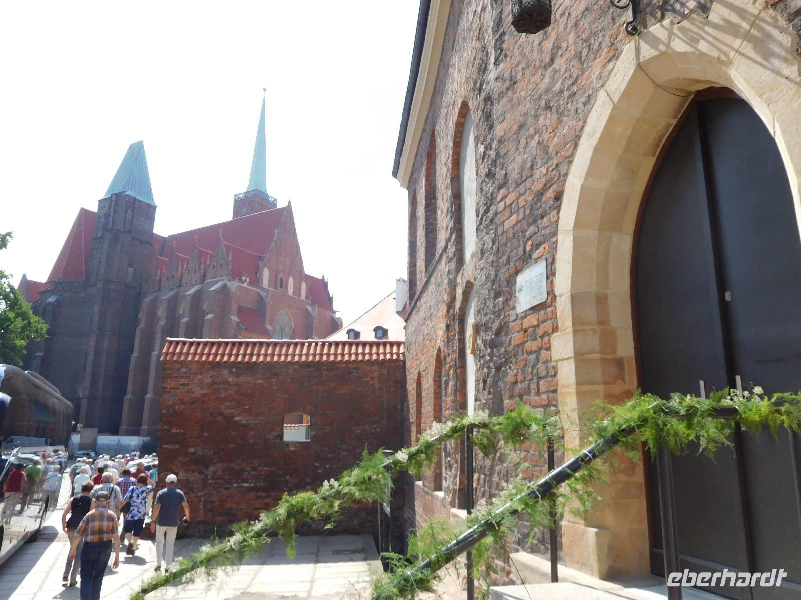 Heute führte uns Guide Maria erst bei einer Stadtrundfahrt, dann zu Fuß zu den Höhepunkten Breslaus. Im Bus ging es erst um den Rynek herum bis zur Hala Stulecia, der Jahrhunderthalle, mit der Pergola und der Fontana, dem Springbrunnen, an dem abends regelmäßig eine beeindruckende Lichtershow stattfindet. Nahebei sind Zoo und Japanischer Garten, die ein lohnenswerter Tipp für einen individuellen Besuch in Breslau sind. Weiter ging die Führung zur Dominsel, wo wir die Kreuzkirche, Bischofssitz und den Breslauer Dom erleben durften. In den drei Kapellen des Breslauer Doms konnten wir kunstvolle Ausarbeitungen des Barocks bewundern. Einmalig, wie lebendig die Figuren und Skulpturen in Auferstehungs- und Erlöserkapelle gestaltet waren! In der Hitze des Tages fuhr uns der Bus weiter zum Universitäts-Hauptgebäude, in dem wir erst das Oratorium Marianum, später am Tag die barocke Aula Leopoldina bestaunen konnten. So viele symbolträchtige Kunstfiguren waren hier untergebracht, man konnte Tage mit der Besichtigung verbringen. Am Abend wartete ein weiterer Höhepunkt auf uns: Das Abendessen in der Karczma Lwowska, nach dem wieder ein optionaler Stadtspaziergang über den Rynek, Plac Solny, durch das Jüdische Viertel in Breslau mit der Weißen Storch Synagoge, Stadtgraben, Musikforum - und der Bühne für den Pink Floyd-Gitarristen David Gilmour, Breslauer Oper bis zur Sicht auf den restaurierten Breslauer Bahnhof und zurück über die Galeria Dominikanska zum Rynek - der perfekte Ausklang eines sommerlichen Tages.