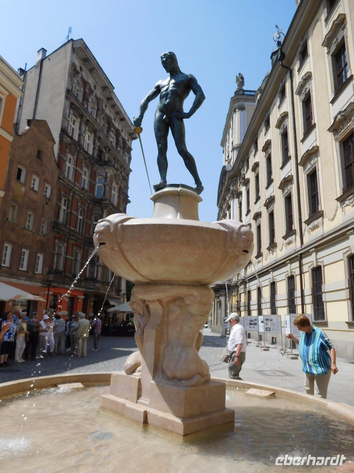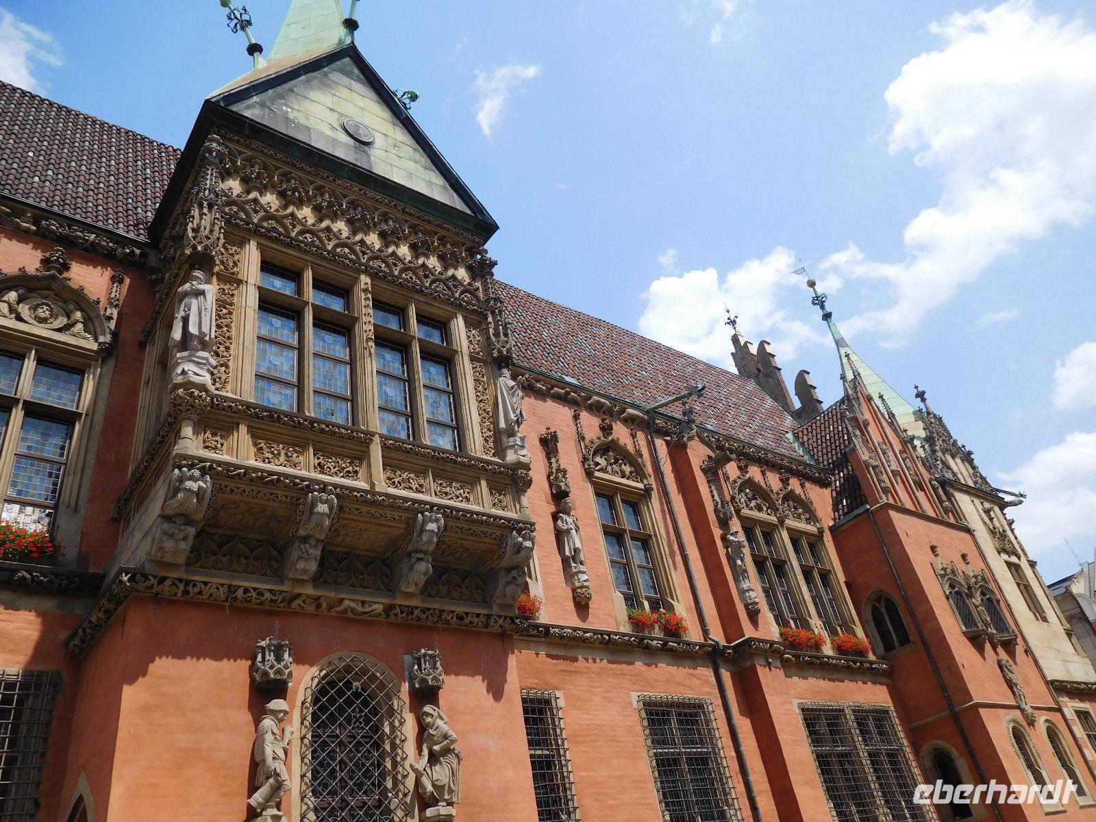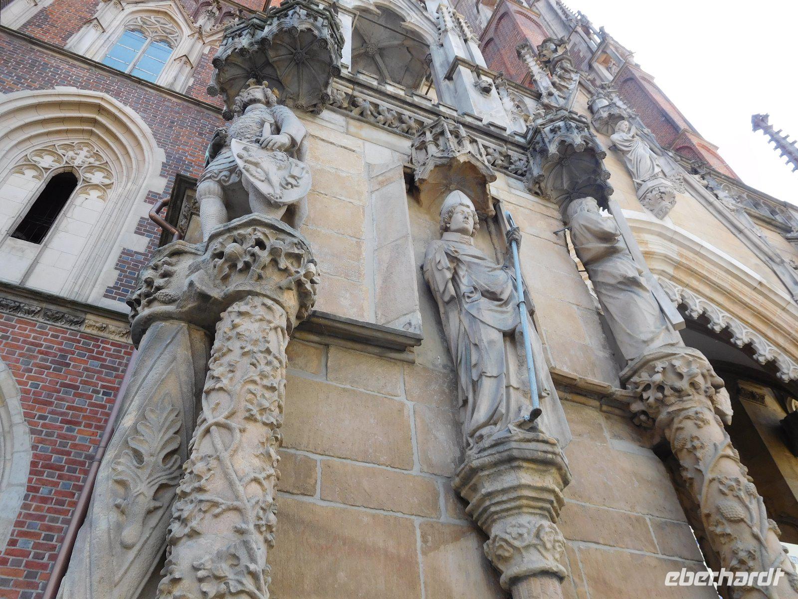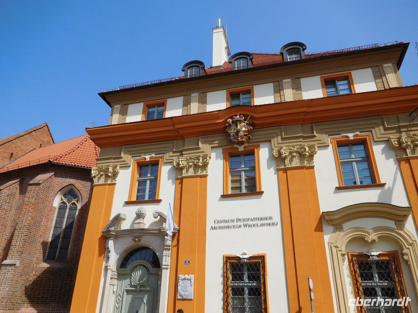 Heute führte uns Guide Maria erst bei einer Stadtrundfahrt, dann zu Fuß zu den Höhepunkten Breslaus. Im Bus ging es erst um den Rynek herum bis zur Hala Stulecia, der Jahrhunderthalle, mit der Pergola und der Fontana, dem Springbrunnen, an dem abends regelmäßig eine beeindruckende Lichtershow stattfindet. Nahebei sind Zoo und Japanischer Garten, die ein lohnenswerter Tipp für einen individuellen Besuch in Breslau sind. Weiter ging die Führung zur Dominsel, wo wir die Kreuzkirche, Bischofssitz und den Breslauer Dom erleben durften. In den drei Kapellen des Breslauer Doms konnten wir kunstvolle Ausarbeitungen des Barocks bewundern. Einmalig, wie lebendig die Figuren und Skulpturen in Auferstehungs- und Erlöserkapelle gestaltet waren! In der Hitze des Tages fuhr uns der Bus weiter zum Universitäts-Hauptgebäude, in dem wir erst das Oratorium Marianum, später am Tag die barocke Aula Leopoldina bestaunen konnten. So viele symbolträchtige Kunstfiguren waren hier untergebracht, man konnte Tage mit der Besichtigung verbringen. Am Abend wartete ein weiterer Höhepunkt auf uns: Das Abendessen in der Karczma Lwowska, nach dem wieder ein optionaler Stadtspaziergang über den Rynek, Plac Solny, durch das Jüdische Viertel in Breslau mit der Weißen Storch Synagoge, Stadtgraben, Musikforum - und der Bühne für den Pink Floyd-Gitarristen David Gilmour, Breslauer Oper bis zur Sicht auf den restaurierten Breslauer Bahnhof und zurück über die Galeria Dominikanska zum Rynek - der perfekte Ausklang eines sommerlichen Tages.