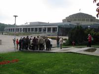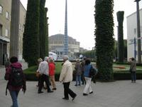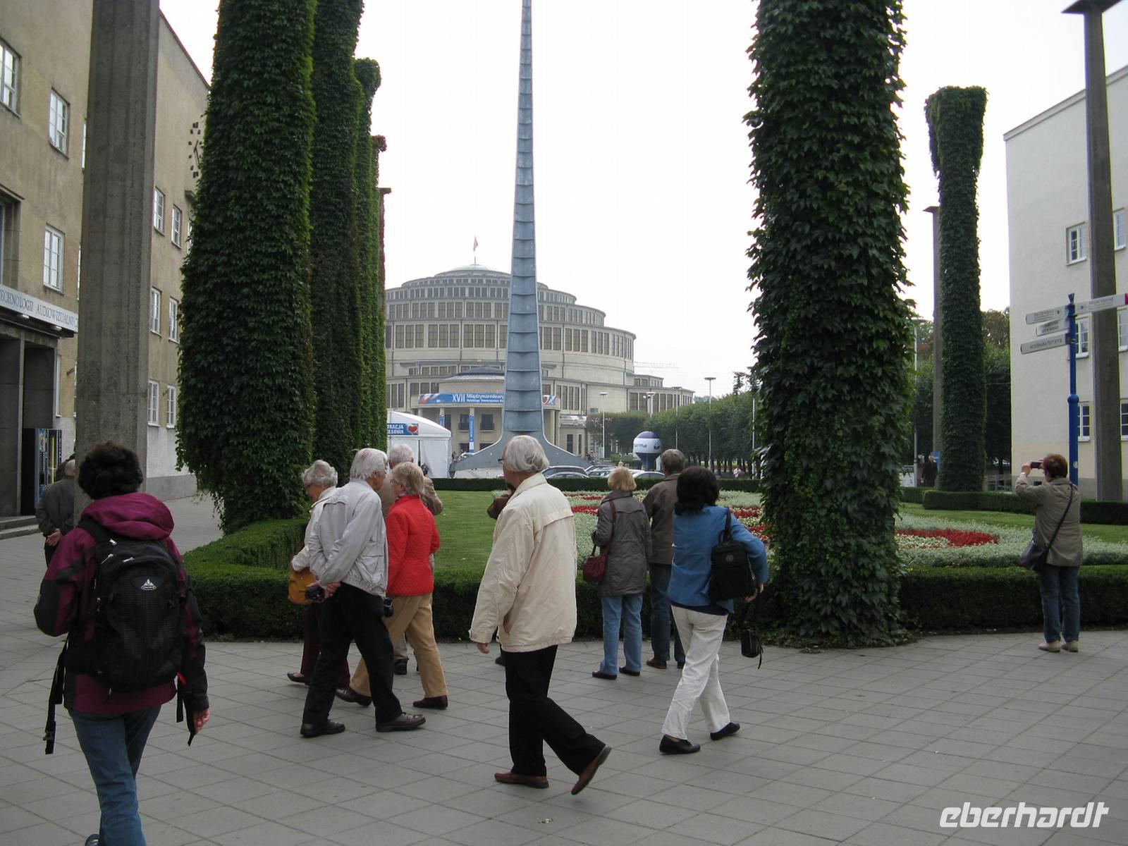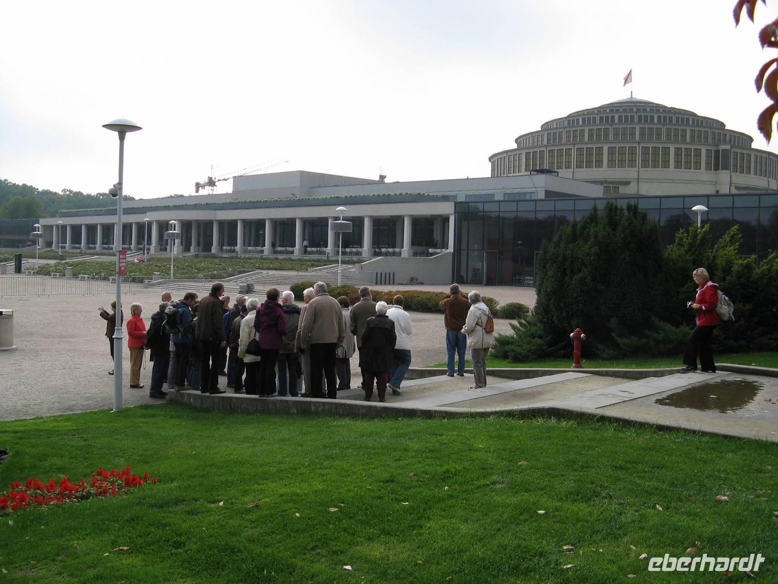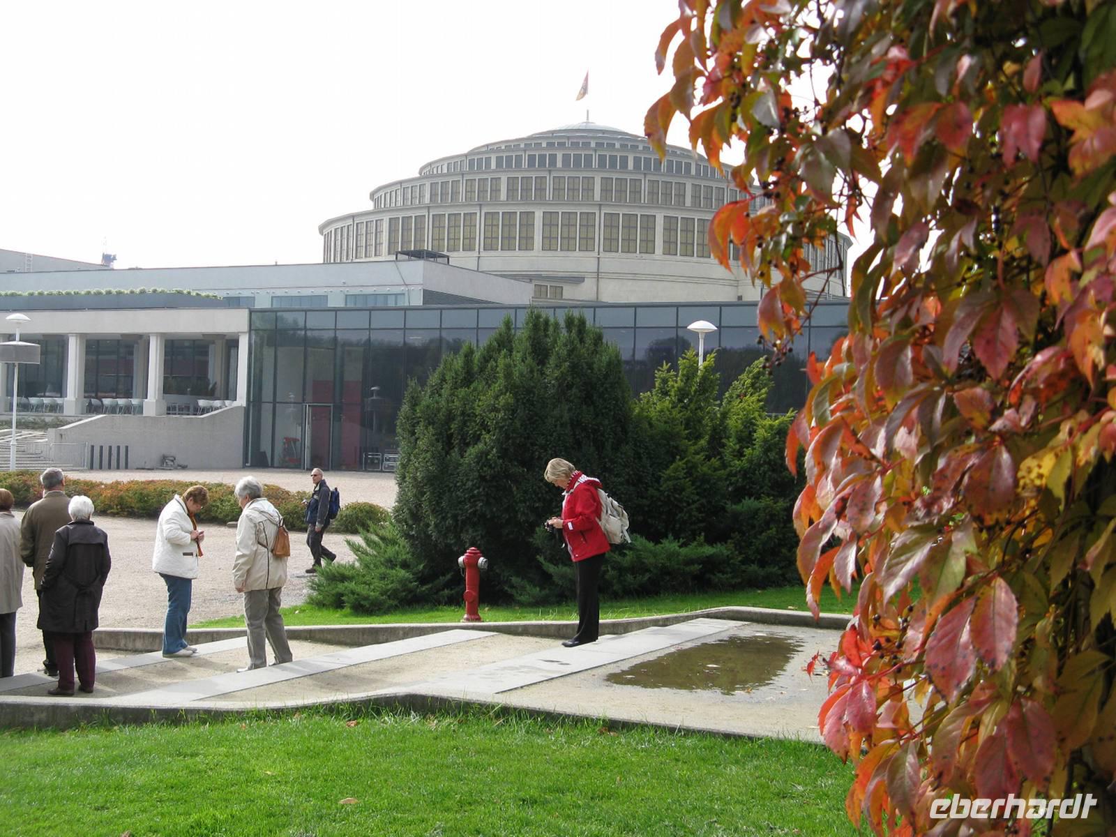 An der Jahrhunderthalle verweilen wir, da ein medizinischer Kongress gerade darinnen stattfindet, können wir die Halle nicht von innen ansehen. Ein Mitglied unserer Gruppe störte das nicht, er mischte sich unauffällig unter die Mediziner und gelangte so zu Fotos der Kuppel.