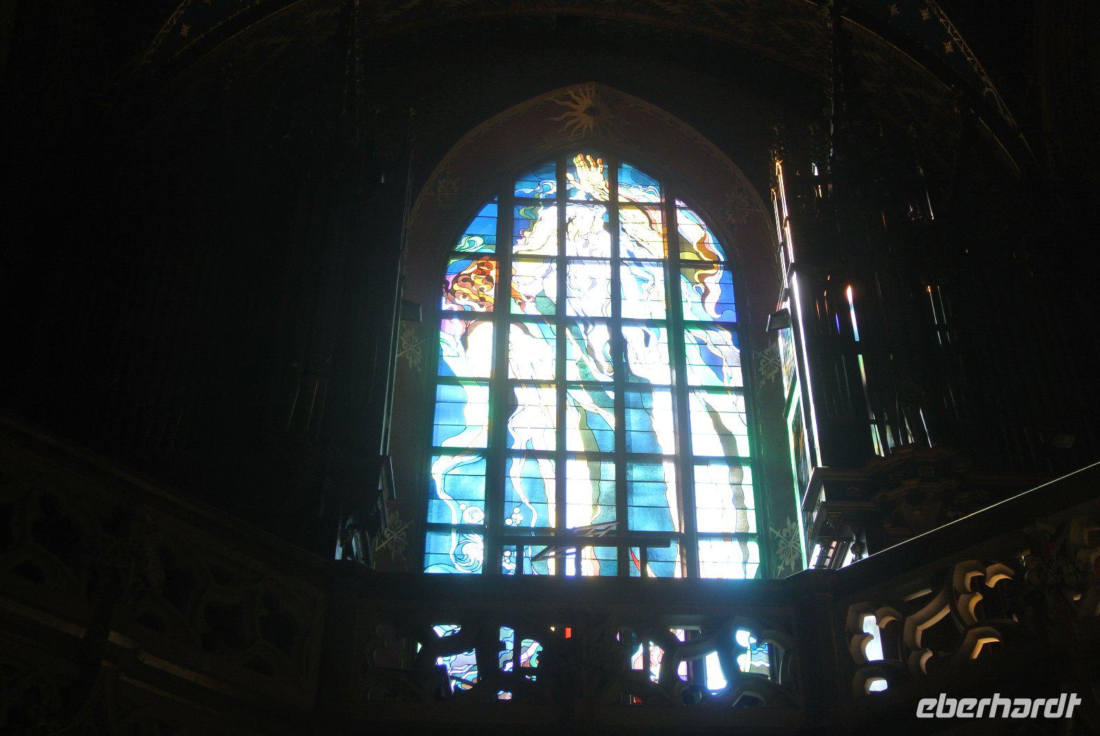 Als musikalische Zugabe hat Gerd das „Ave Maria" aus seiner mobilen Lautsprecheranlage in der einzigartigen Stimmung der wenig beleuchteten Kirche mit seinen farbenfrohen großen Jugendstilfenstern gespielt.