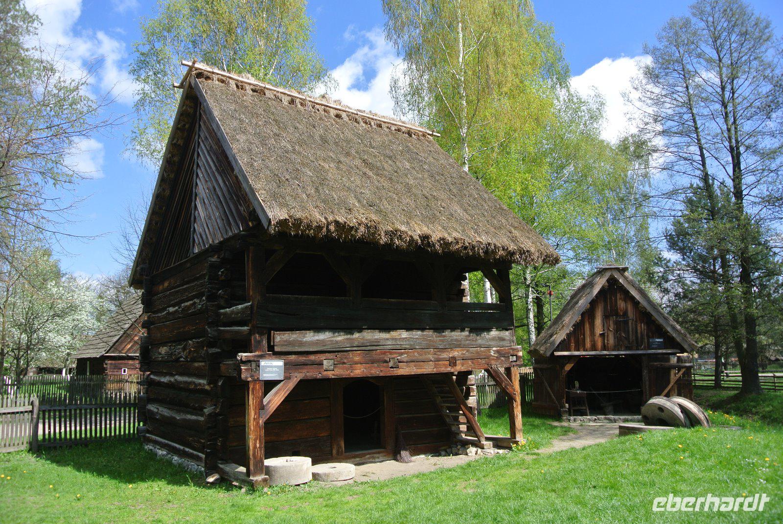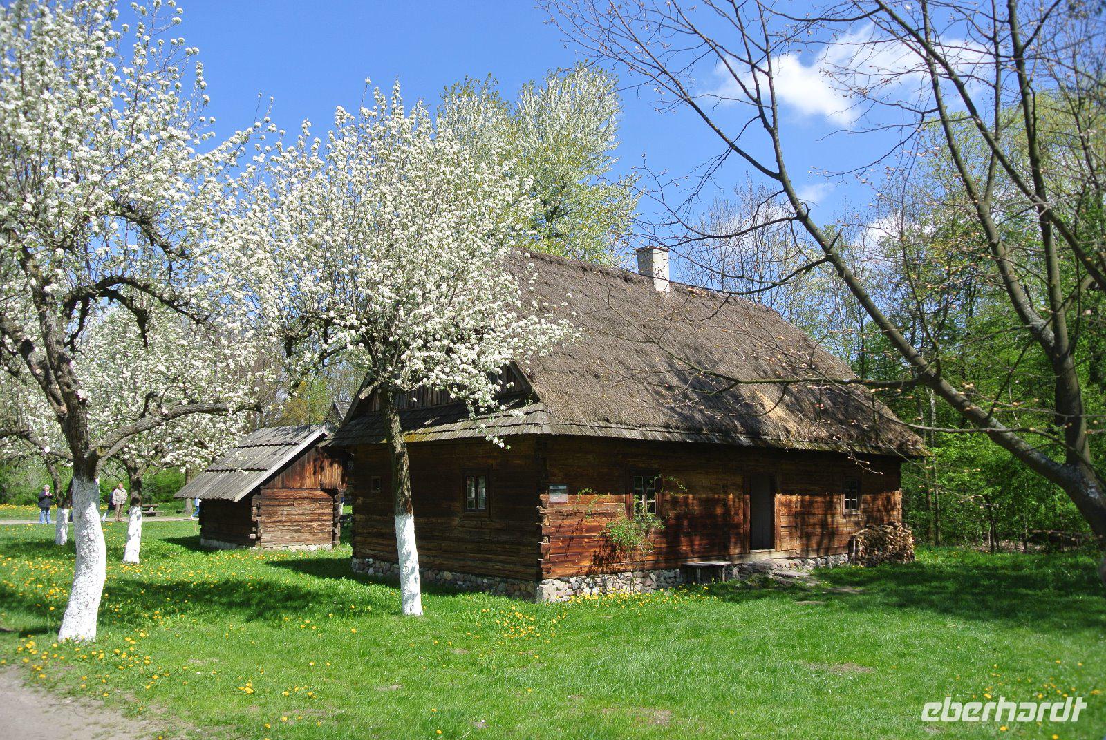 Die Holzhäuser wurden aus verschiedenen Teilen Schlesiens dort, in einem Areal mit alten Obstbäumen und Wiesen, aufgebaut.