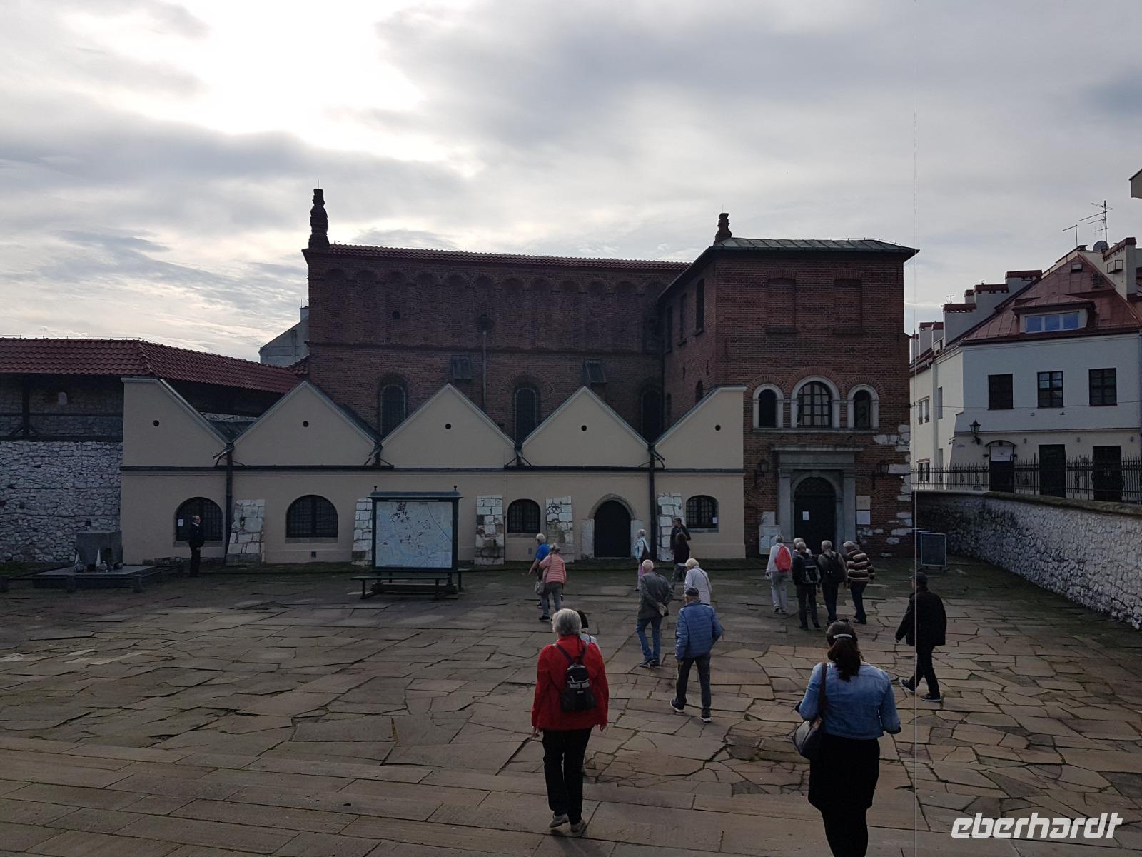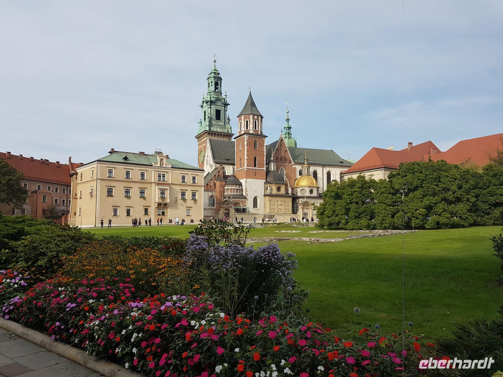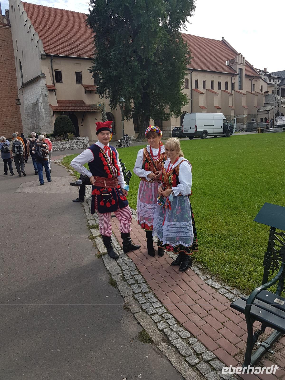 Nach dem Frühstück kam Christian, unser örtl. Guide, zum Hotel und zuerst fuhren wir mit dem Bus nach Kazimierz und lernten das ehemalige Jüdische Viertel kennen. In der Alten Synagoge besuchten wir die dortige Ausstellung. Die berühmte Remuh- Synagoge und den dazu gehörigen Friedhof konnten wir von außen in Augenschein nehmen. Wir erfuhren auch das die ehemalige Metallwarenfabrik von Oskar Schindler sich in der Nähe befand. Der Film "Schindlers Liste" war den Gästen bekannt und sowohl Christian als auch Horst gaben in diesem Zusammenhang weitere Informationen zur Geschichte. Wir fuhren zurück zum Hotel und setzten die Stadtführung zu Fuß fort. Horst nahm mit ein paar Gästen die Tram bis zum vereinbarten Treffpunkt, zu dem Christian mit den anderen Gästen zu Fuß gingen. Übrigens: In Polen können Rentner die Nahverkehrsmittel kostenfrei nutzen( in Breslau ab 68 und in Krakau ab 70 )! An der Franziskanerkirche winkte uns Joh. Paul II. aus seinem Fenster. Wir sahen Junge Krakauer in ihrer typ. Tracht. Nach der Franziskaner Kirche besichtigten wir den Rynek mit seinen markanten Bauwerken ( Tuchhallen, alter Rathausturm, UNI, Marienkirche ). Jetzt war es wieder Zeit für eine Pause. Appetit hatte sich bei dem breiten Angebot der Cafe`s und Restaurant`s schon wieder bei den meisten Gästen angesagt. Pünktlich um 14:30 Uhr trafen wir uns wieder an der Marienkirche. Jetzt spazierten wir zum Wawel. Wir besichtigten die prunkvoll ausgestattete Kathedrale incl. Unterkirche und den Innenhof des königlichen Schlosses. Nach der Führung ging Horst noch mit einigen Gästen zum feuerspeienden Drache am Fuße des Wawelberges. Danach war Freizeit. Um 18:30 Uhr trafen sich die Gäste, die das Chopinkonzert gebucht hatten in der Lobby. Das Konzert war einer der Höhepunkte der Reise. Über den abendlichen Rynek ging es zurück zum Hotel.