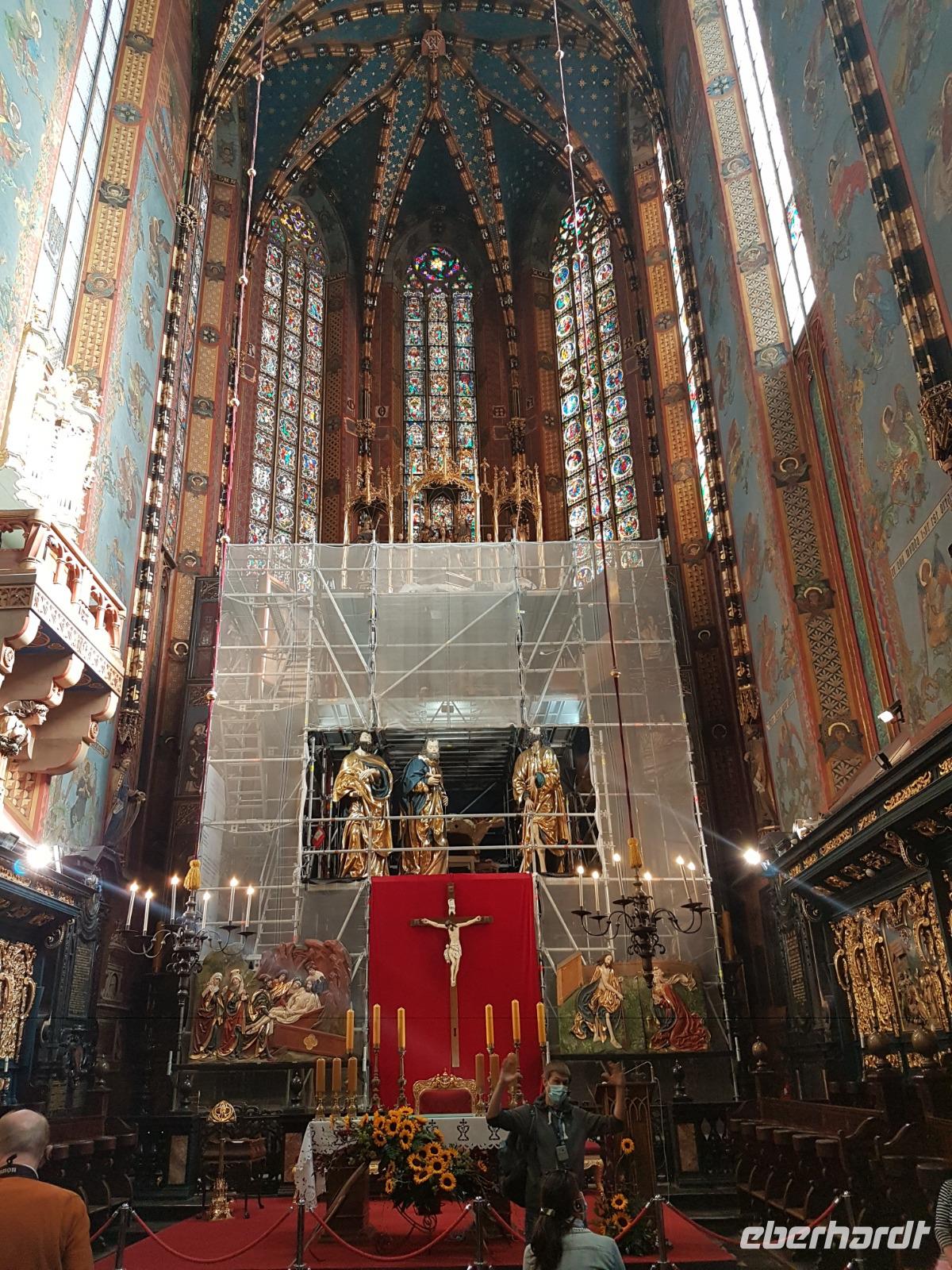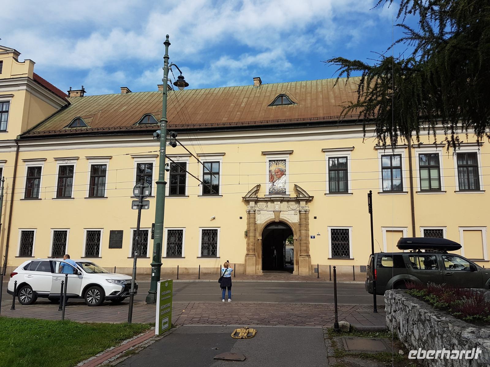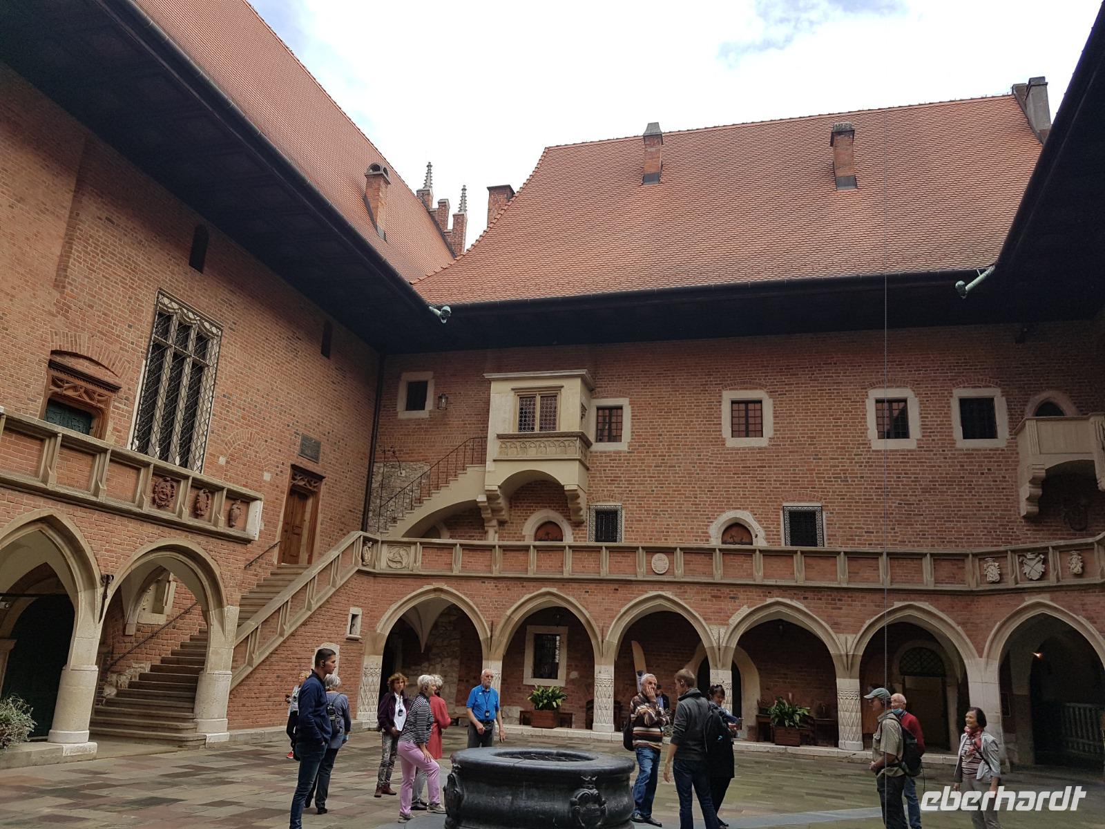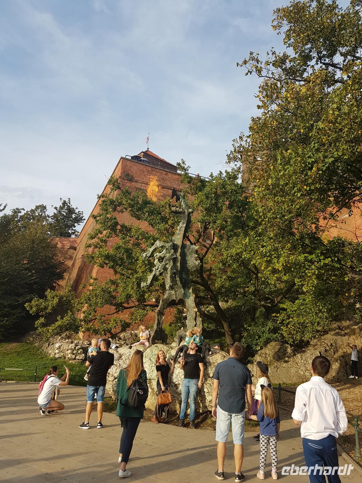 Nach dem Frühstück kam Christian, unser örtl. Guide, zum Hotel und zuerst fuhren wir mit dem Bus nach Kazimierz und lernten das ehemalige Jüdische Viertel kennen. In der Alten Synagoge besuchten wir die dortige Ausstellung. Die berühmte Remuh- Synagoge und den dazu gehörigen Friedhof konnten wir von außen in Augenschein nehmen. Wir erfuhren auch das die ehemalige Metallwarenfabrik von Oskar Schindler sich in der Nähe befand. Der Film "Schindlers Liste" war den Gästen bekannt und sowohl Christian als auch Horst gaben in diesem Zusammenhang weitere Informationen zur Geschichte. Wir fuhren zurück zum Hotel und setzten die Stadtführung zu Fuß fort. Horst nahm mit ein paar Gästen die Tram bis zum vereinbarten Treffpunkt, zu dem Christian mit den anderen Gästen zu Fuß gingen. Übrigens: In Polen können Rentner die Nahverkehrsmittel kostenfrei nutzen( in Breslau ab 68 und in Krakau ab 70 )! An der Franziskanerkirche winkte uns Joh. Paul II. aus seinem Fenster. Wir sahen Junge Krakauer in ihrer typ. Tracht. Nach der Franziskaner Kirche besichtigten wir den Rynek mit seinen markanten Bauwerken ( Tuchhallen, alter Rathausturm, UNI, Marienkirche ). Jetzt war es wieder Zeit für eine Pause. Appetit hatte sich bei dem breiten Angebot der Cafe`s und Restaurant`s schon wieder bei den meisten Gästen angesagt. Pünktlich um 14:30 Uhr trafen wir uns wieder an der Marienkirche. Jetzt spazierten wir zum Wawel. Wir besichtigten die prunkvoll ausgestattete Kathedrale incl. Unterkirche und den Innenhof des königlichen Schlosses. Nach der Führung ging Horst noch mit einigen Gästen zum feuerspeienden Drache am Fuße des Wawelberges. Danach war Freizeit. Um 18:30 Uhr trafen sich die Gäste, die das Chopinkonzert gebucht hatten in der Lobby. Das Konzert war einer der Höhepunkte der Reise. Über den abendlichen Rynek ging es zurück zum Hotel.