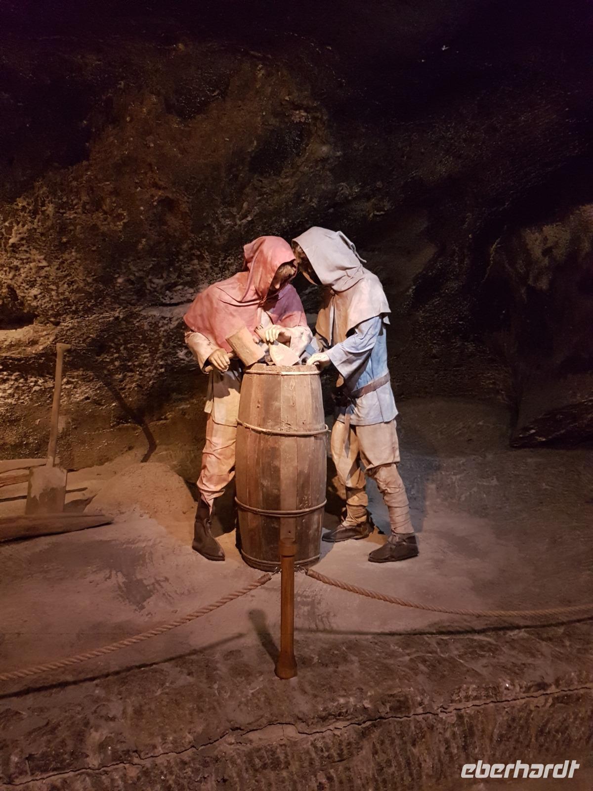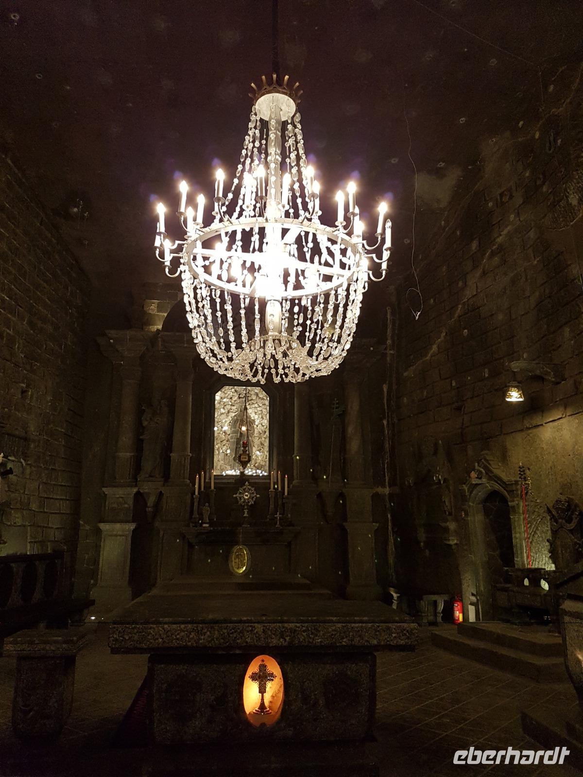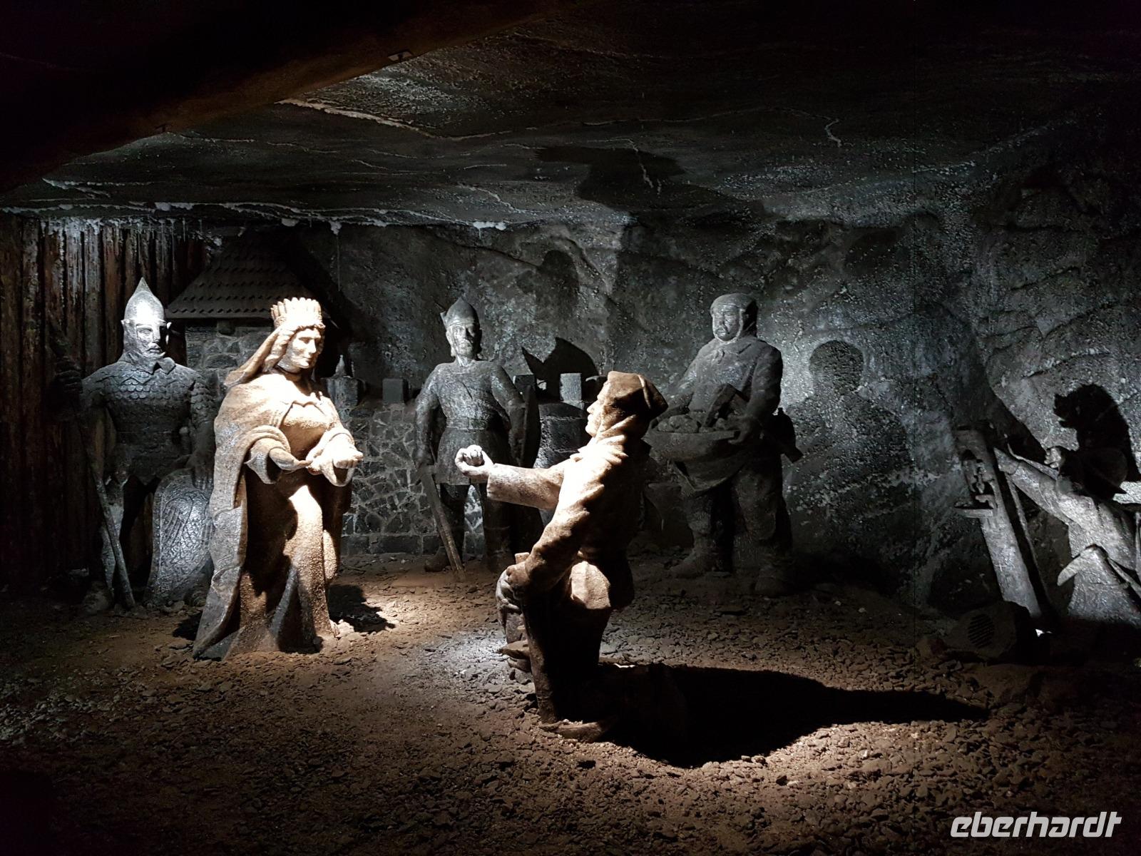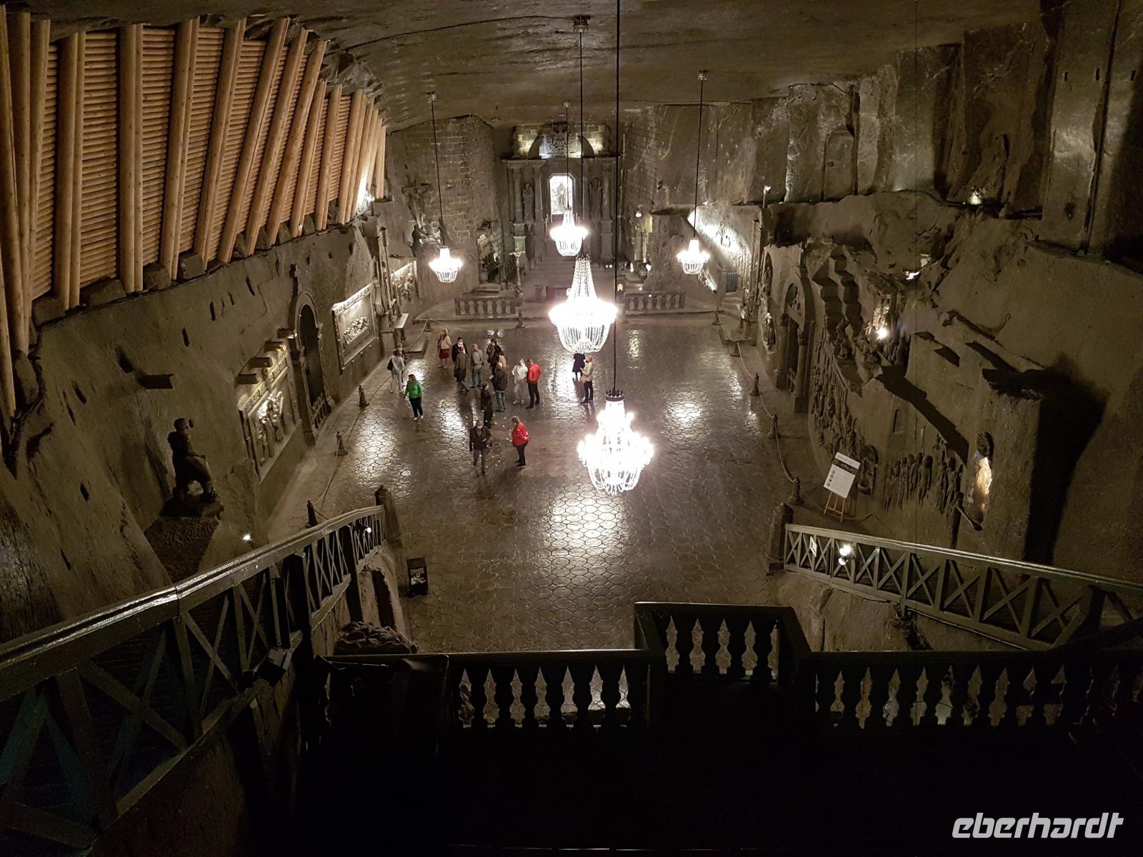 Die meisten Gäste hatten den Besuch der Salzmine Wieliczka gebucht und so fuhren wir nach dem Frühstück mit dem Bus zum etwa 30 Min. entfernten berühmten Salzbergwerk. Christian begleitete uns bis zum Bergwerk und erledigte da die, wegen Corona, veränderten Formalitäten für uns, bevor wir mit dem Bergführer MAREK 380 Stufen nach unter Tage gingen. Auf einer ersten Sole, 130 m unter der Erdoberfläche begann die sehr interessante Führung. Wir erfuhren, das der Salzbergbau in vergangenen Zeiten 30% der Staatseinnahmen ausmachten. Salz wurde wie Gold gehandelt ! Unter Tage gab es viele interessante Dinge zu sehen. Wie erfolgte der Abbau und die Zutageförderung , wie schwer und gefährlich war die Arbeit. Welche Persönlichkeiten besuchten das Bergwerk. Viele Darstellungen nur aus reinem Salz sind wahre Kunstwerke, so die Ausgestaltung der einzelnen ehemaligen Salzkammern mit übermannsgroßen Persönlichkeiten und Darstellungen der biblichen Geschichte.