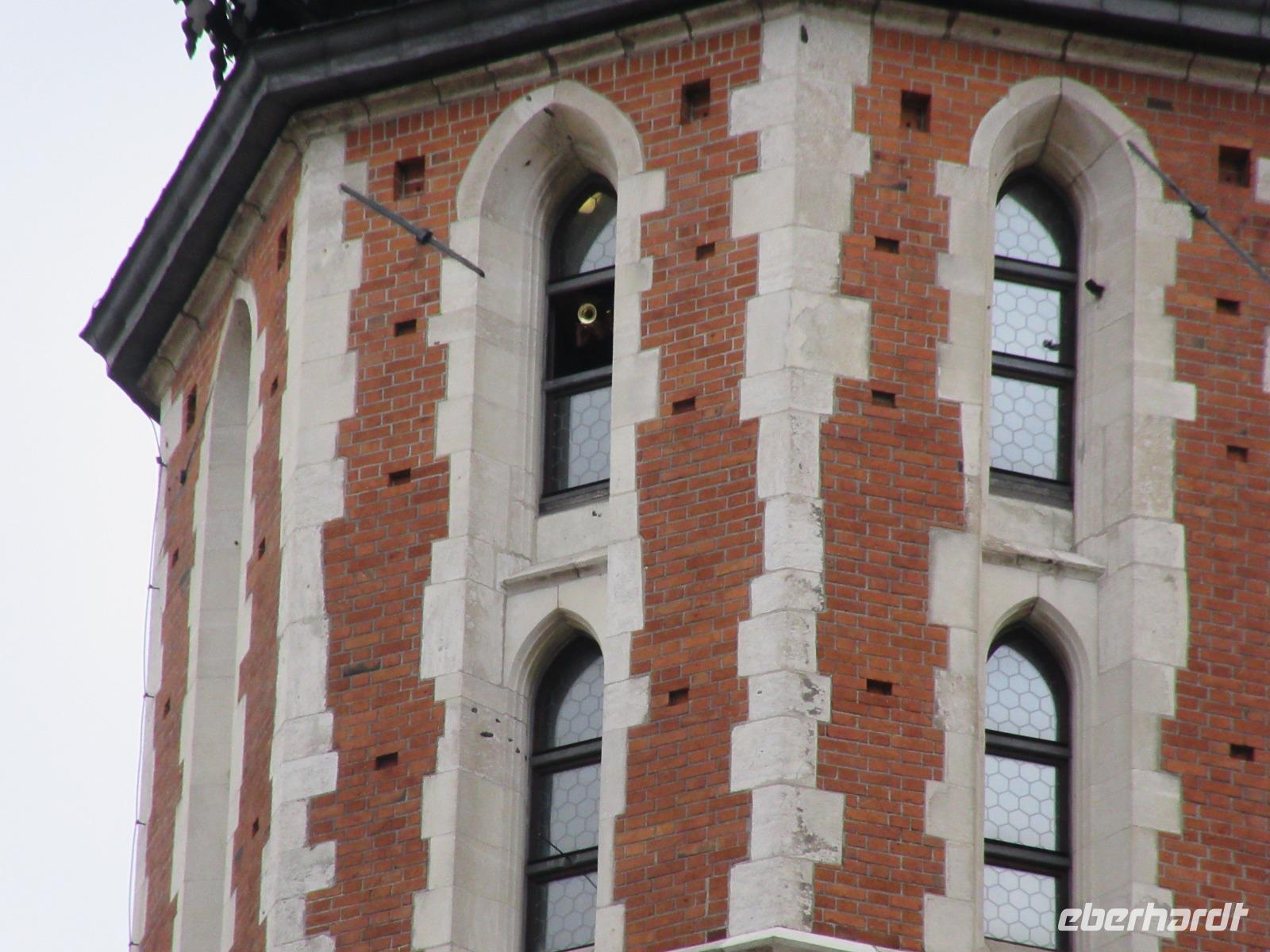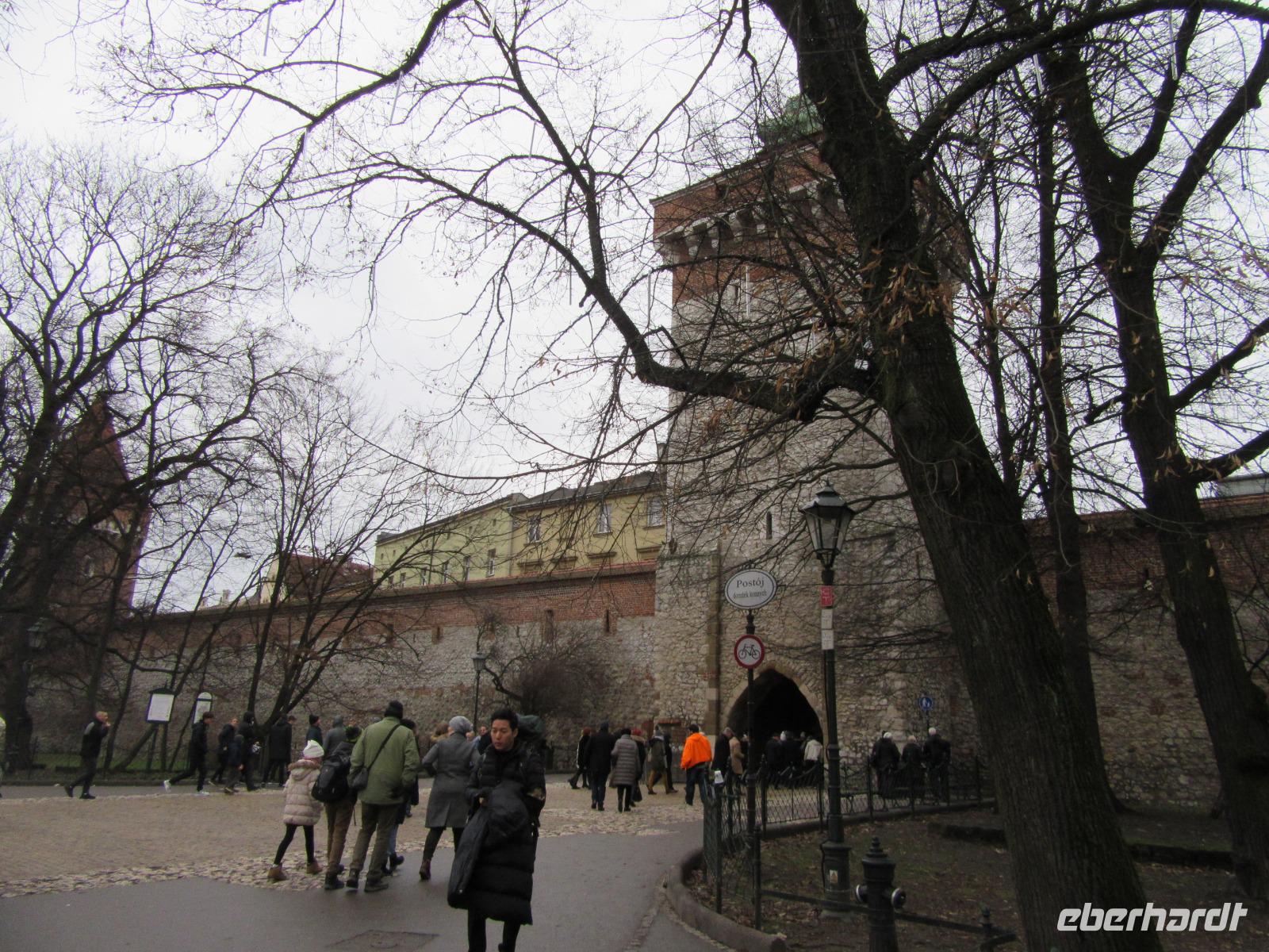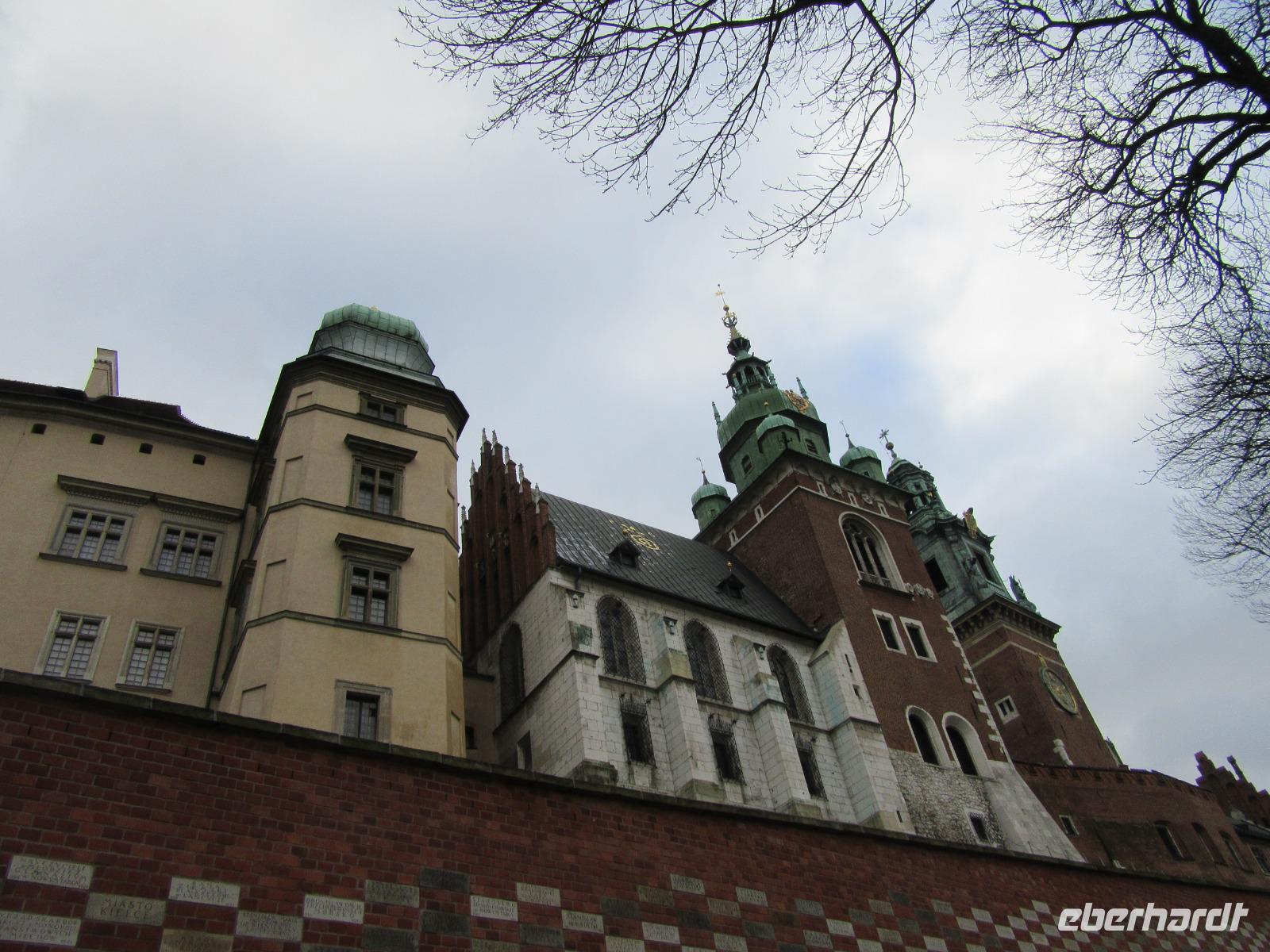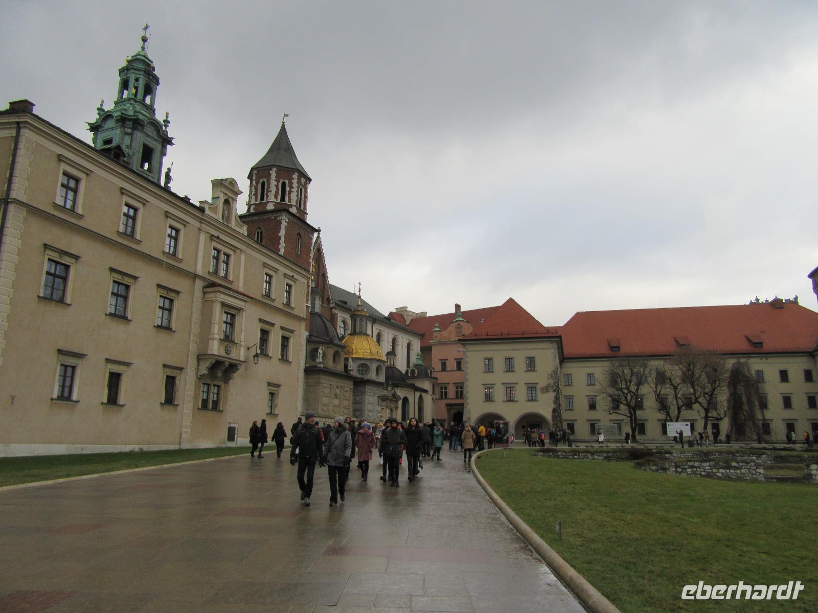 Anschließend spazierten wir zur Wawelburg, gelegen auf dem Hügel Wawel. Dort war es heute ausgesprochen voll, das lag natürlich an den Feiertagen. Christian führte uns durch die Kathedrale, welche polnisches Nationalheiligtum ist, da dort zahlreiche Krönungen und Eheschließungen der Monarchen Polens stattgefunden haben. Die Kathedrale ist sehr prunkvoll und es gibt eine Vielzahl an Verziehrungen zu bestaunen. Der Hochaltar ist auch hier besonders schön anzusehen. Laut einer Erzählung wird Magie übertragen, wenn man sich im Schlossinnenhof an die Wand lehnt. Die Polen sind sehr abergläubige Menschen. Einige Gäste nutzen die Gelegenheit, vielleicht hat es ja funktioniert. Wir hatten dann noch einen wunderbaren Ausblick auf die Weichsel, bevor wir uns von Christian verabschiedeten. Mit dem Wetter hatten wir Glück, denn erst, als unsere Führung endete, begann es zu nieseln.