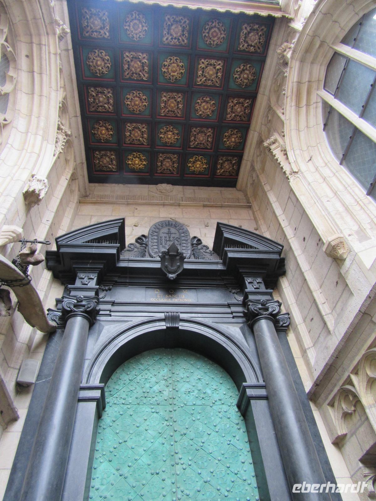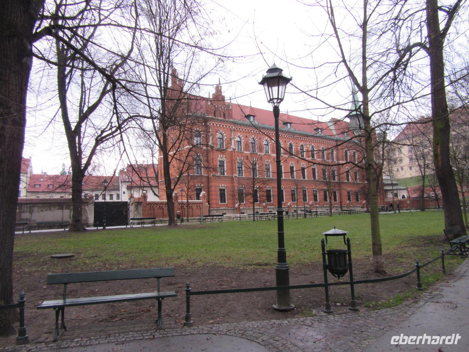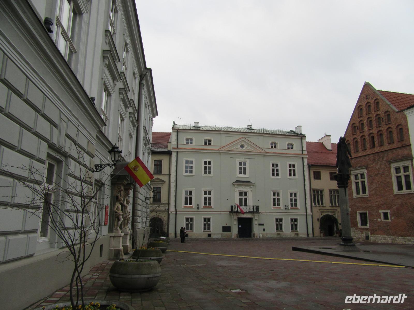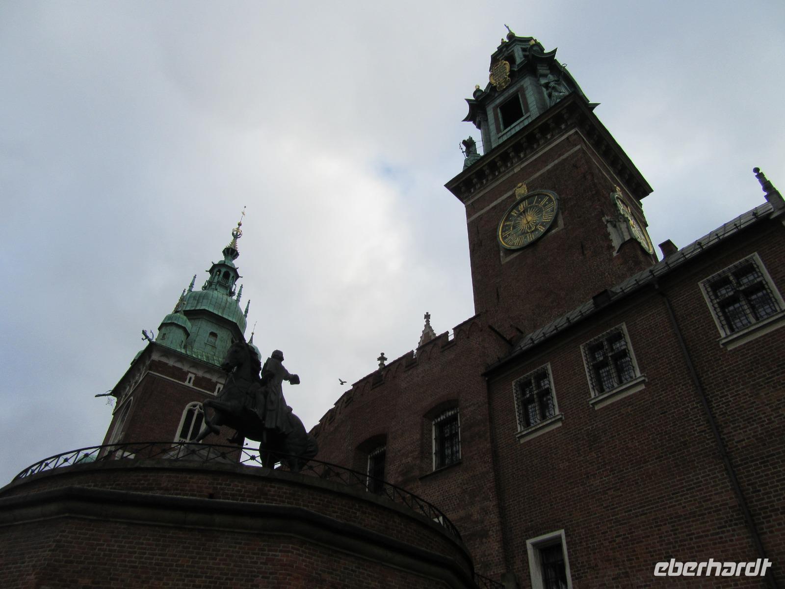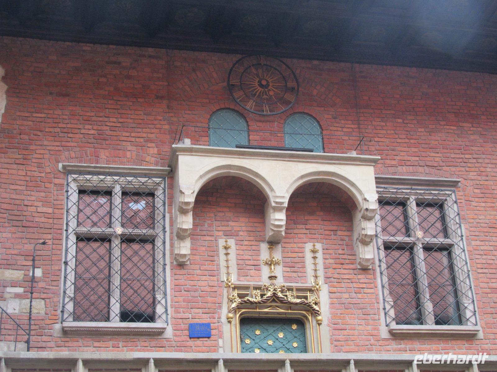 Anschließend spazierten wir zur Wawelburg, gelegen auf dem Hügel Wawel. Dort war es heute ausgesprochen voll, das lag natürlich an den Feiertagen. Christian führte uns durch die Kathedrale, welche polnisches Nationalheiligtum ist, da dort zahlreiche Krönungen und Eheschließungen der Monarchen Polens stattgefunden haben. Die Kathedrale ist sehr prunkvoll und es gibt eine Vielzahl an Verziehrungen zu bestaunen. Der Hochaltar ist auch hier besonders schön anzusehen. Laut einer Erzählung wird Magie übertragen, wenn man sich im Schlossinnenhof an die Wand lehnt. Die Polen sind sehr abergläubige Menschen. Einige Gäste nutzen die Gelegenheit, vielleicht hat es ja funktioniert. Wir hatten dann noch einen wunderbaren Ausblick auf die Weichsel, bevor wir uns von Christian verabschiedeten. Mit dem Wetter hatten wir Glück, denn erst, als unsere Führung endete, begann es zu nieseln.