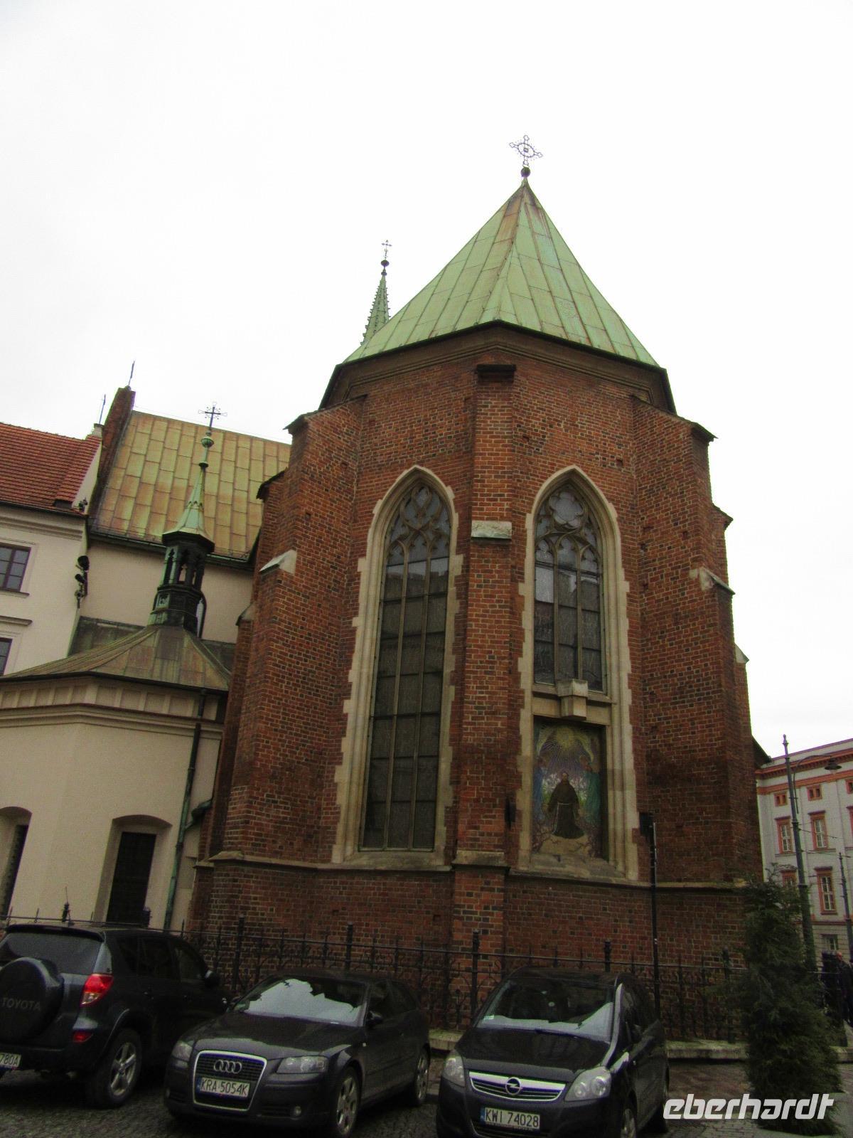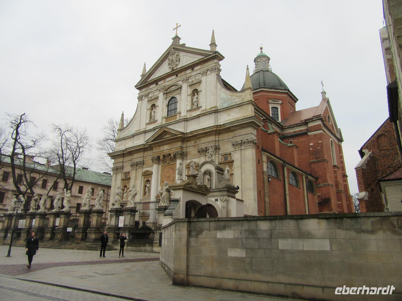 Unser Rundgang führte uns vorbei an weiteren Kirchen der Stadt, durch das Universitätsviertel mit dem Collegium Maius, zum Rynek mit dem Rathausturm und den Tuchhallen und dem Juliusz Slowacki Theater. Es wurde dann doch recht kühl, also waren wir froh, als wir am Resturant ankamen, wo uns das Mittagessen erwarete. In diesem rustikalen Restaurant wurden uns typisch polnische Speisen aufgetischt. Zuerst gab es Schmalzbrote, anschließend eine Pilzcremesuppe im Brotlaib, dann geräucherten Schafskäse mit Preisebeeren und Pierrogen mit verschiedenen Füllungen sowie Kraut mit Wurst und Datteln.