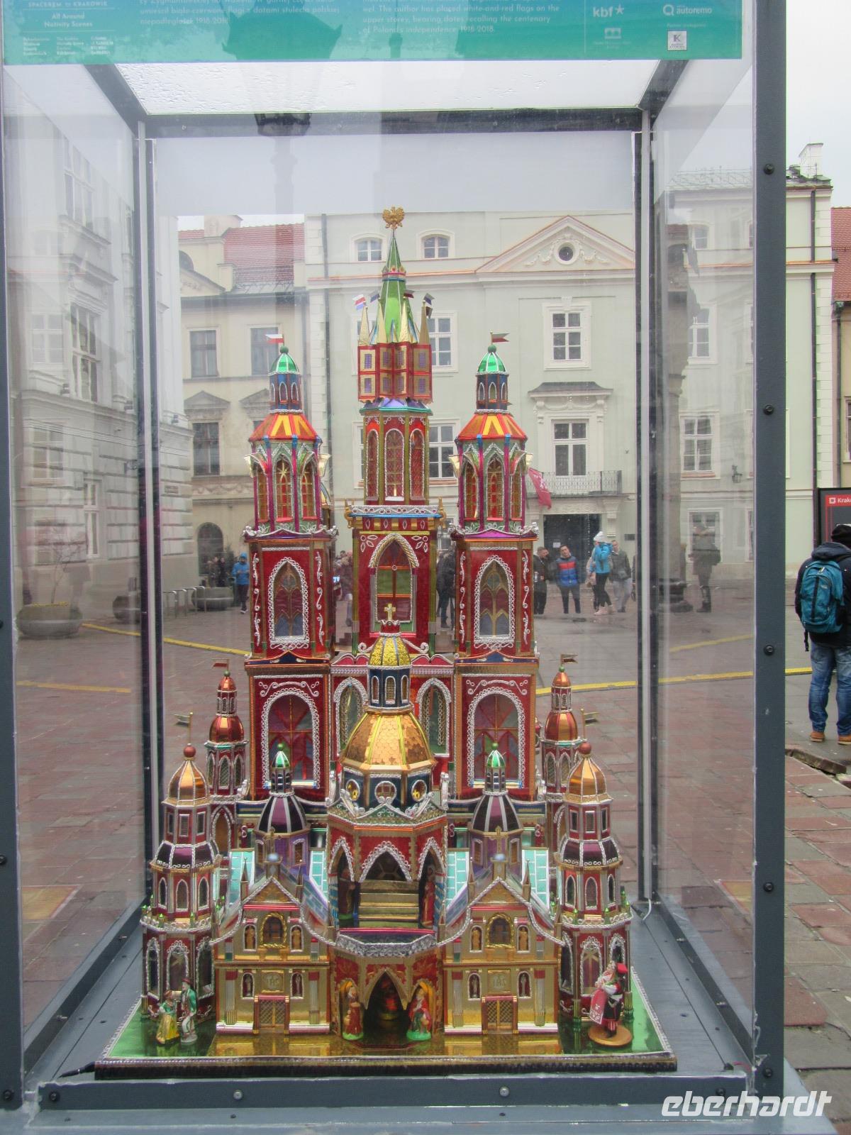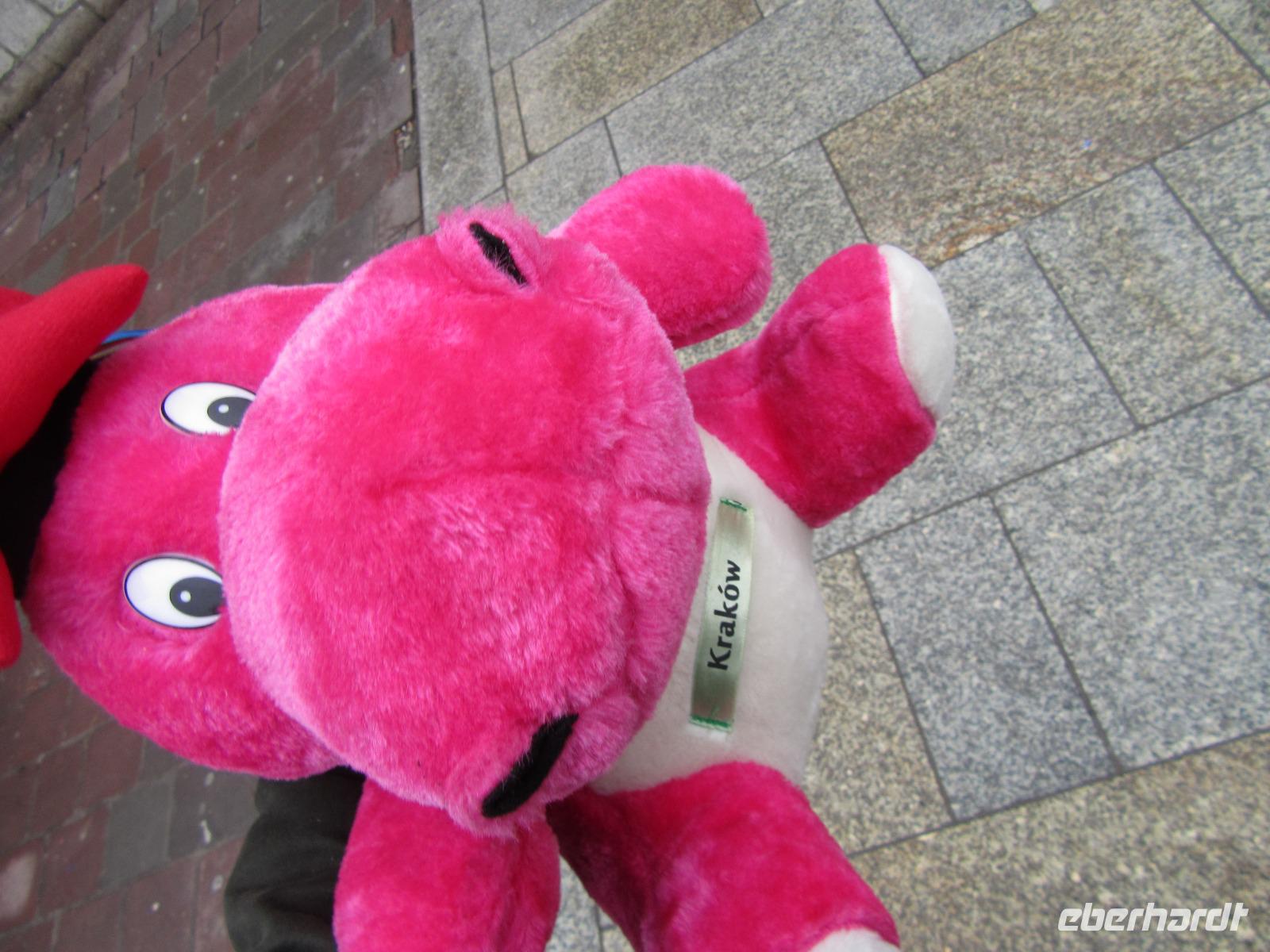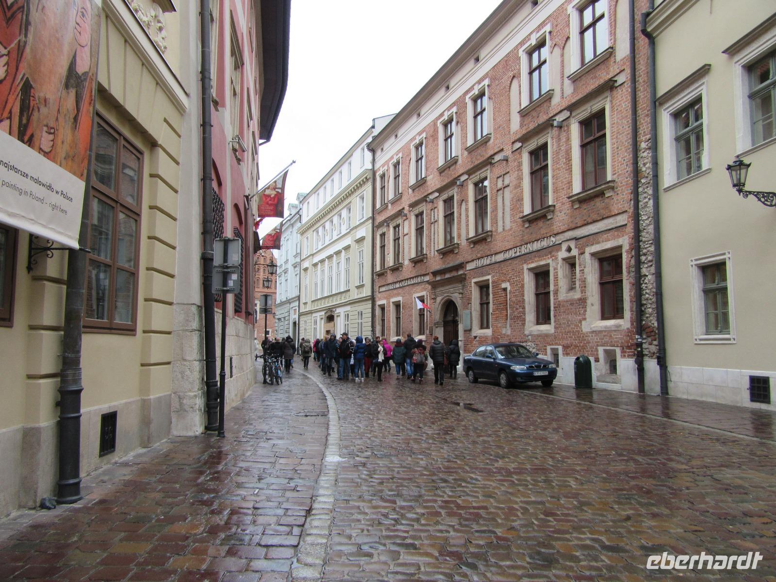 Ewa führte uns zu allen wichtigen Sehnswürdigkeiten der Stadt. Wir begannen mit einem Spaziergang durch den Planty Park und sahen aus einem Stück Entfernung sogar schon die Anlage der Wawelburg von außen. Weiter ging es dann in die Straße Kanonicza, welche die Altstadt auf schnellstem Weg mit der Wawelburg verbindet und die wohl schönste und älteste Straße der Stadt ist. Ein Stück spazierten wir dann entlang der Straße Grodzka,diese war im Mittelalter eine sehr wichtige Handelsstraße, heute ist dort eine Vielzahl an Einkaufsmöglichkeiten zu finden. Auf unserem Weg durch die Innenstadt trafen wir immerwieder auf die Krakauer Weihnachtskrippen, sie waren alle sehr schön und in verschiedensten Farben gestaltet, dennoch sah jede anders aus. Gerade, als wir vor einer dieser Weihnachtskrippen standen, kam ein Pole auf mich zu und schenke mir überraschenderweise einen knallpinken Waweldrachen aus Plüsch. Von nun an hatten wir also einen zusätzlichen Begleiter während des Stadtrundganges.