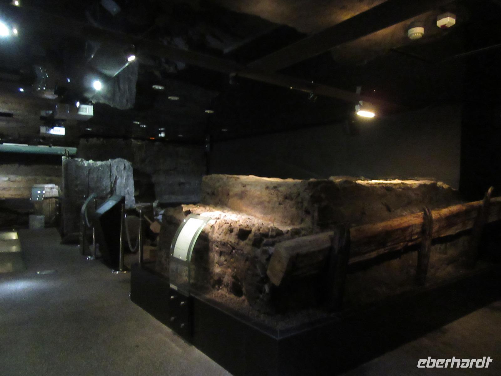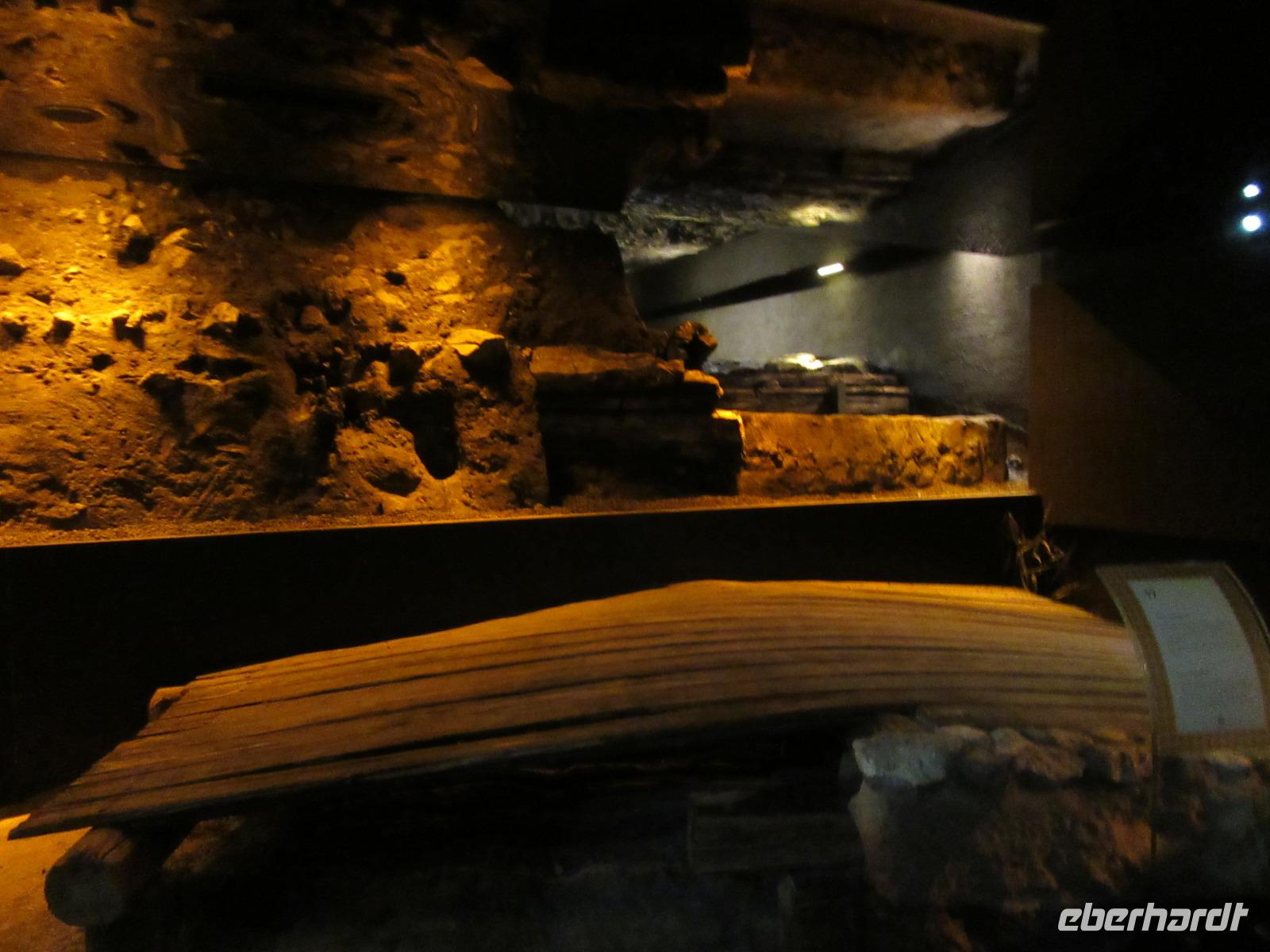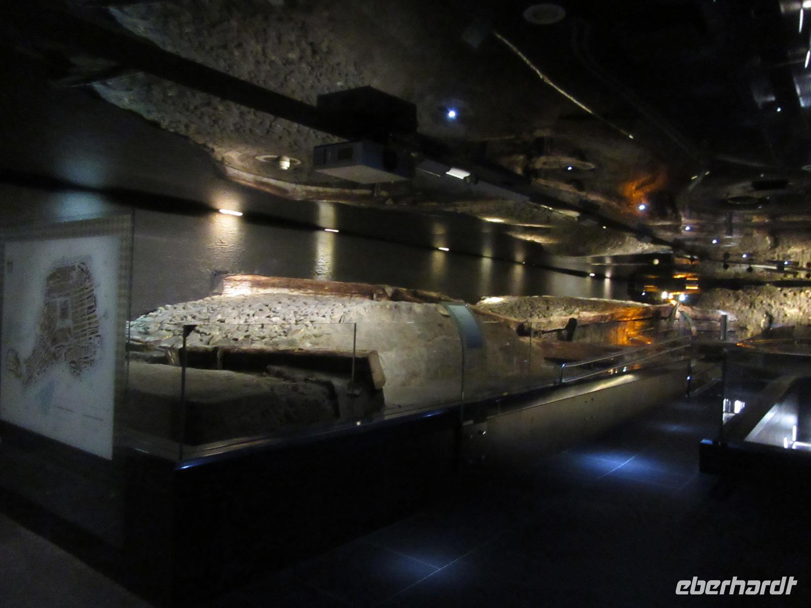 Christian führte uns dann durch die Ausstellung des unterirdischen Markplatzes. Hauptsächlich zwischen 2005 und 2007 fanden dort entsprechende Ausgrabungen statt. Die Führung war sehr interessant, denn ein Großteil war noch erstaunlich gut erhalten, sogar aus dem Mittelalter. Wir sahen alte Mauerstücke, aber beispielsweise auch Schuhe, Schmuck, Werkzeuge und eine Waage oder eine Messlatte. Um das Ganze authentisch darzustellen waren wir von Geräuchen des damaligen Treibens am Markt umgeben. Während der Führung bekamen wir auf verschiedenen Ebenen einen Einblick in die 5000 jährige Geschichte der Stadt.