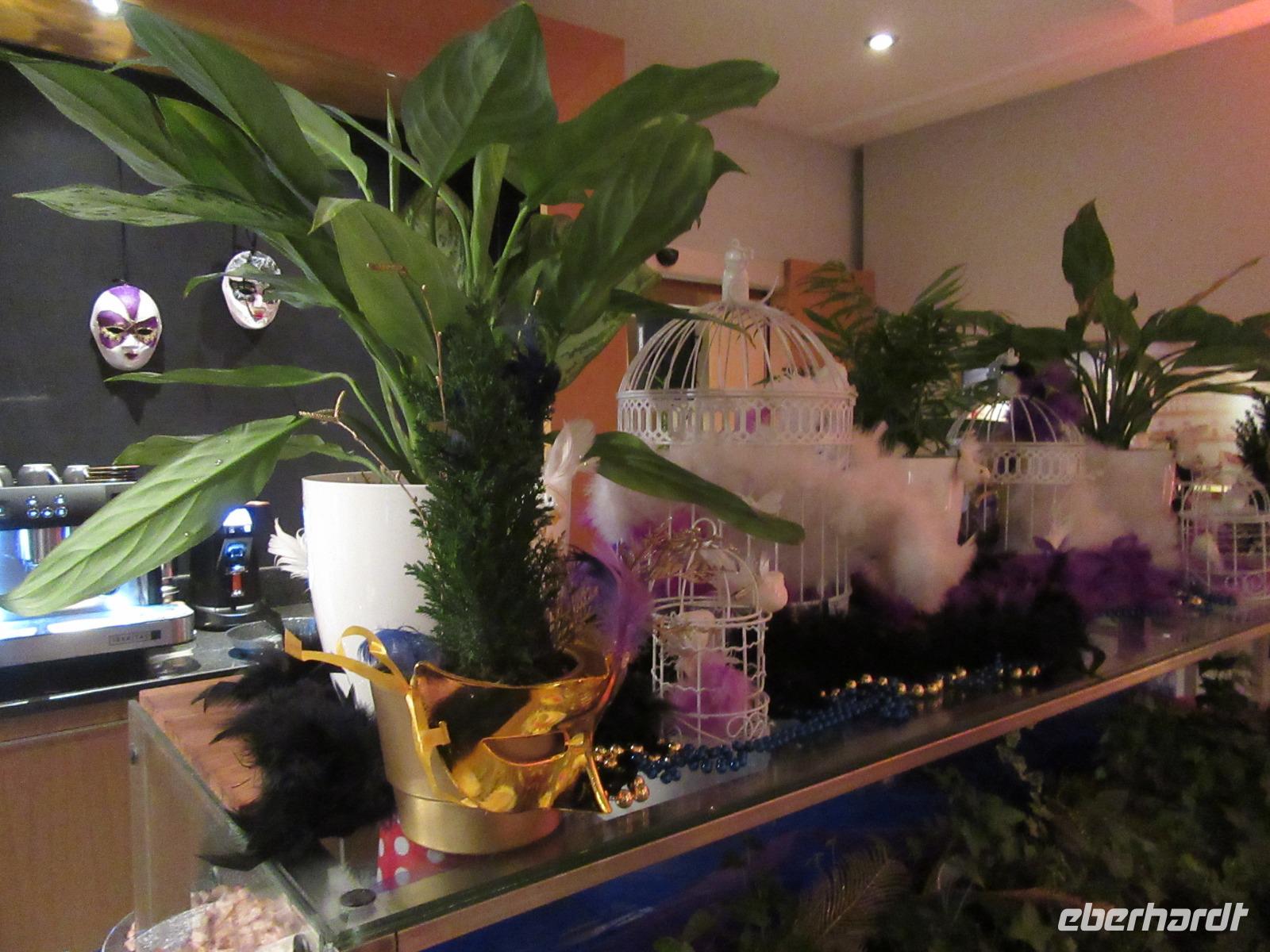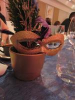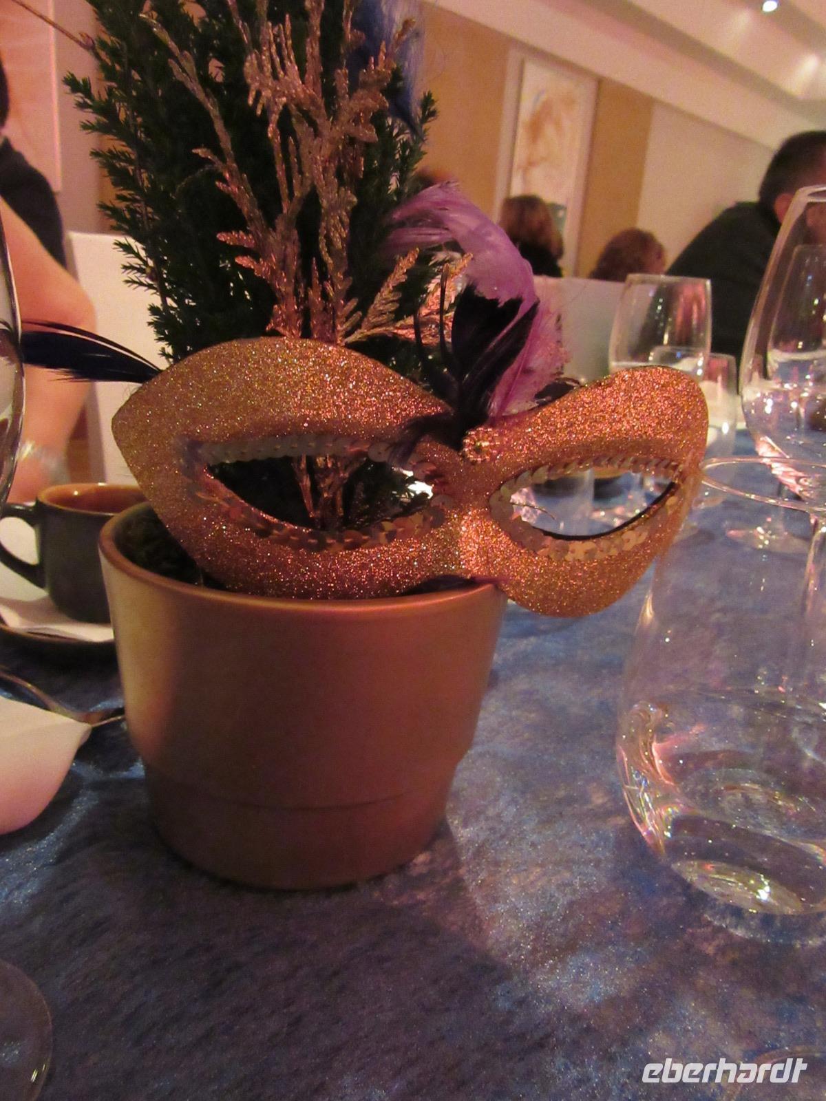 Wir trafen uns dann alle später zu unserem Silvesterabendessen wieder. Für uns waren zwei große Tafeln eingedeckt. Der Abend stand unter dem Motto des venezianischen Maskenballs. Die Räume waren dem Motto entsprechend schick geschmückt und festlich gestaltet.