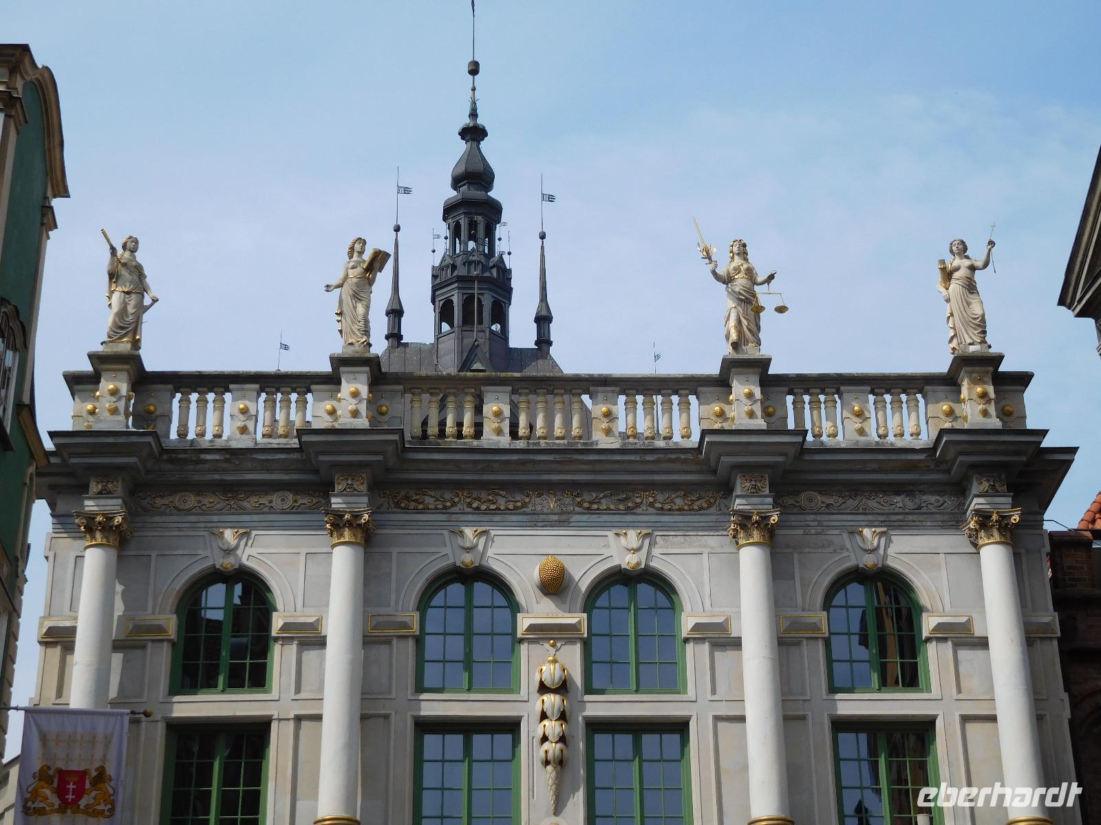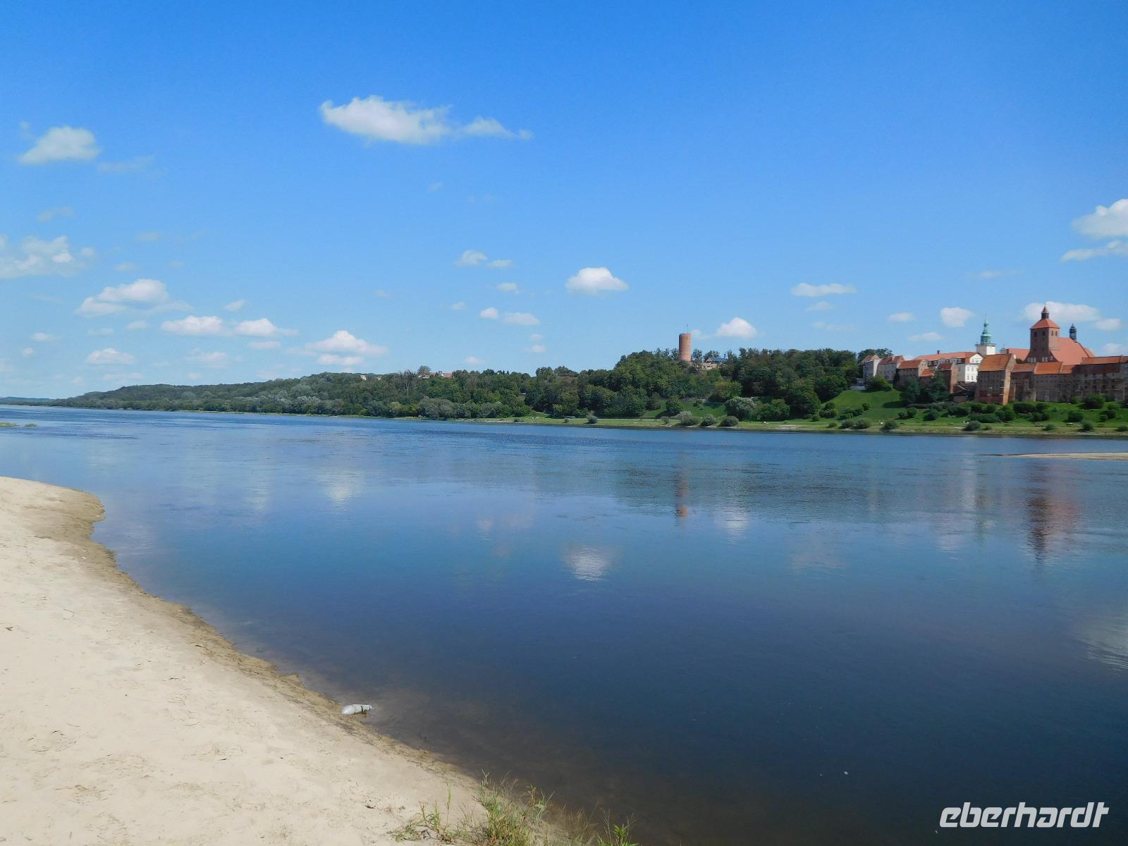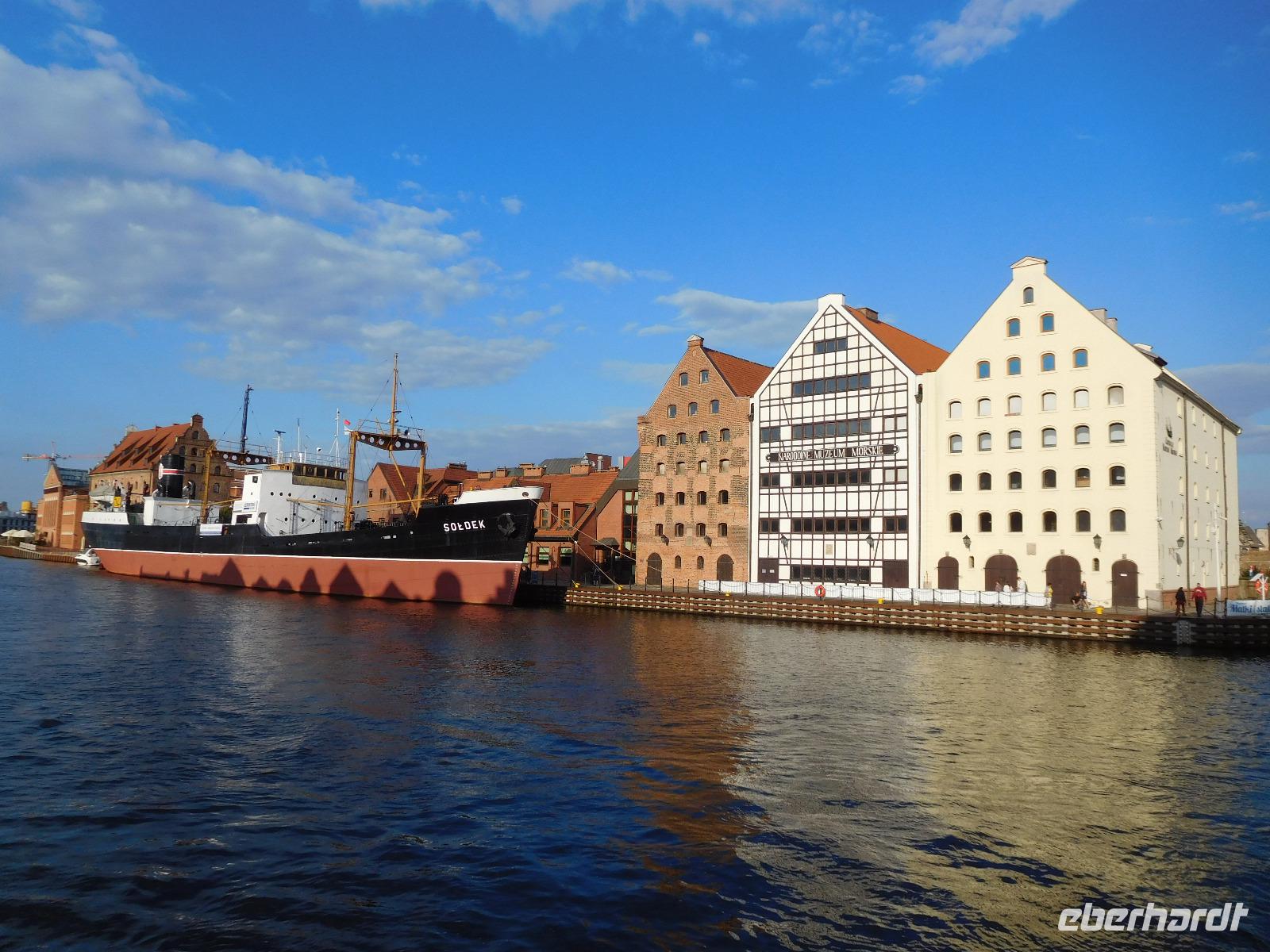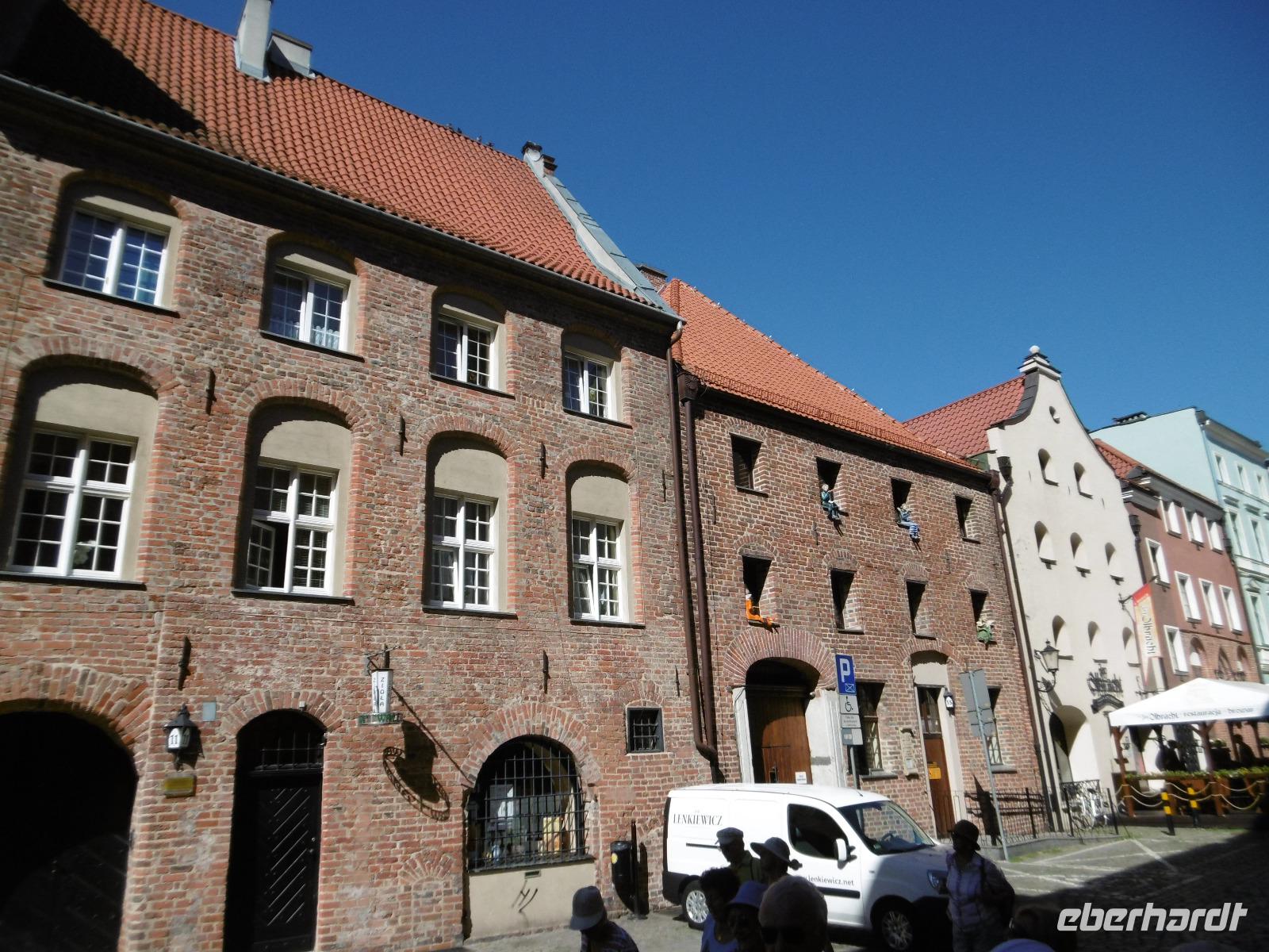 Auf dem Weg nach Danzig legten wir eine abenteuerliche Rast ein. Der Busfahrer Alf fuhr gegenüber der alten Stadt Graudenz fast einen Kilometer rückwärts, um an eine Sandbucht an der Weichsel zu gelangen. Von hier hatten wir einen grandiosen Blick auf die dem Fluss zugewandte Stadtmauer mit 26 mittelalterlichen Speichern. Vorwärts erreichte der Bus wieder die Straße und anschließend ging es dann nach Danzig ins Hotel, wo uns nach dem Einchecken und einer kleinen Erfrischungspause der Reiseleiter bei einem kleinen Stadtrundgang bis zur Danziger Bowke, wo wir das Abendessen einnahmen, mit der Topographie der Altstadt vertraut machte. Vorbei an der Katharinenkirche und der alten Wassermühle des Deutschen Ordens, sowie dem im Stil der niederländisch beeinflussten Renaissance gebauten Altstädtischen Rathaus gingen wir in die Nikolaikirche, die dem Dominikanerorden gehört. Als einzige hat sie samt ihrer Ausstattung das Kriegsgeschehen 1945 ohne größeren Schaden überstanden. Dann konnte man hinter der Königskapelle schon die riesige Frauenkirche sehen, in die wir einen Blick werfen konnten. Ein paar Schritte und schon war der Lange Markt mir Rathaus und Artushof erreicht, den wir einmal rauf und runter spazierten. Zum Abschluss noch durch das Grüne Tor an die Mottlau, wo einst der Hafen war. Nahe beim mittelalterlichen Krantor, einem Wahrzeichen der Stadt, war dann auch die Gaststätte. Natürlich mussten wir einen Blick in die Frauengasse werfen. Hier sind die schönsten Beischläge erhalten, wie die unterkellerten Terrassen der alten Patrizierhäuser hier genannt wurden. Wo einst im Sommer das kommerzielle und familiäre Leben stattfand, wird heute Bernsteinschmuck verkauft. Nach dem ortstypischen Abendessen in der Bowke konnte jeder noch durch die belebte Altstadt bummeln.