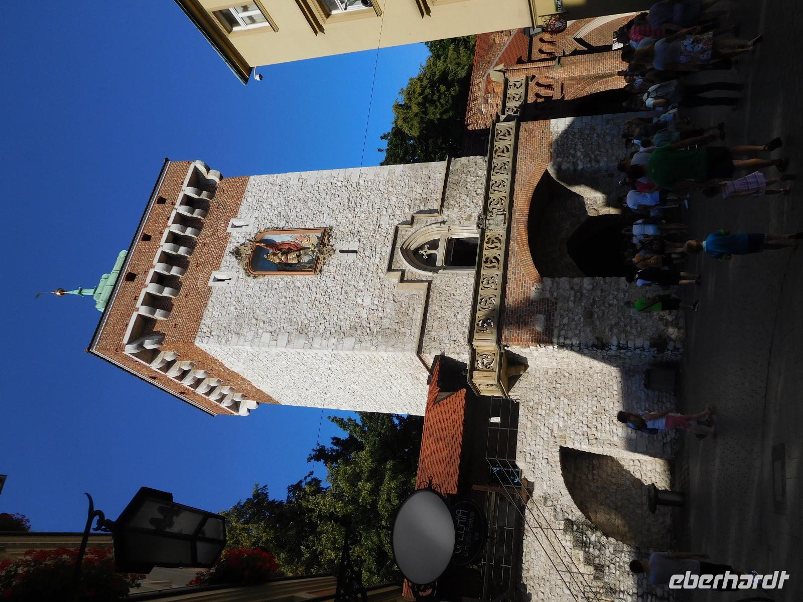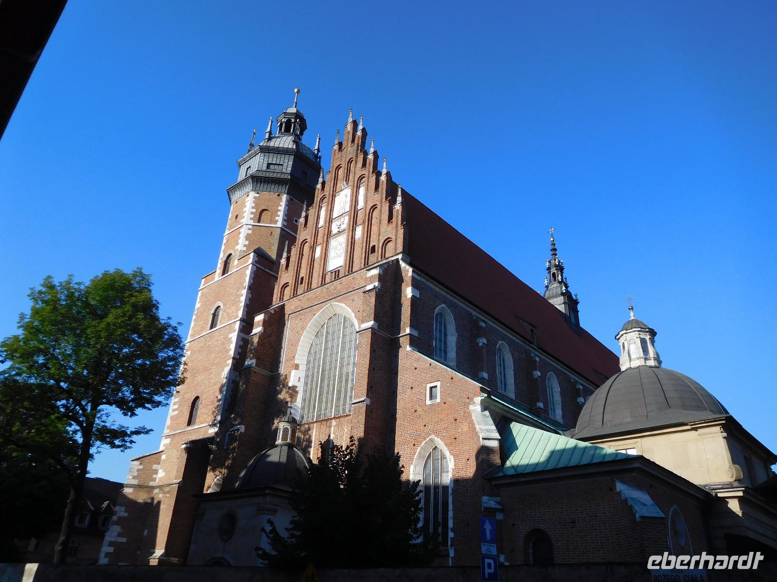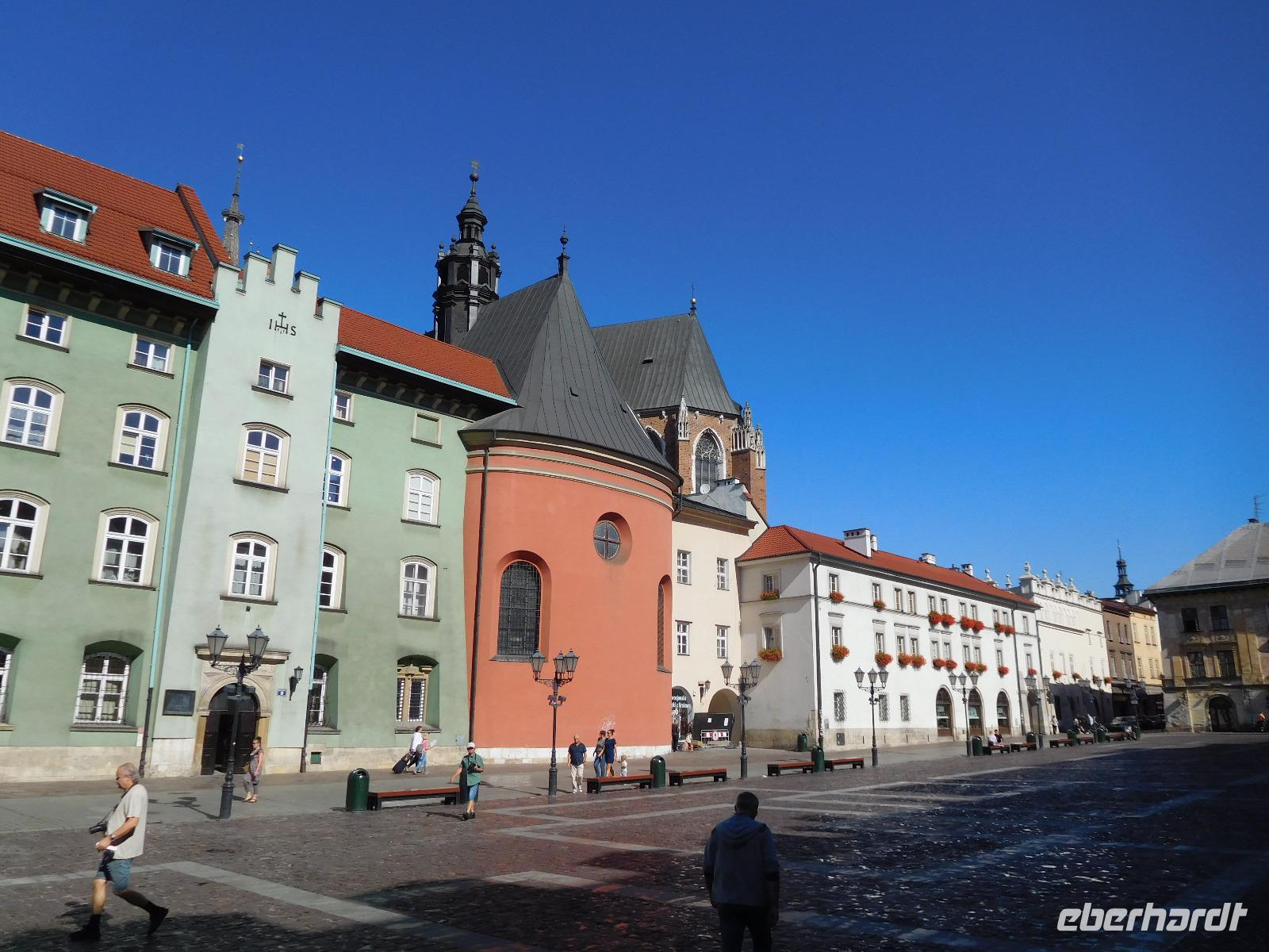 Um neun holte uns die charmante Stadtführerin Ewa vom Hotel ab und durch den auf der ehemaligen Wallanlage angelegten Park ging es zur Barbakane am Florianstor und hinein in die Floriansstraße. Die Deutschlehrerin spricht akzentfrei unsere Sprache und besitzt dazu ein immenses Wissen über ihre Stadt. Über den Alten Markt führte sie uns vorbei an der Dominikanerkirche mit dem gut erhaltenen gotischen Portal, dann in die Franziskanerkirche mit den Jugendstilfenstern von Wyspianski hin zum Collegium Maius, dem aus dem 15. Jahrhundert stammenden historischen Universitätsgebäude. Um 11 Uhr öffnen sich die Schaufenster der historischen Uhr und heraus treten die hohen Herren der Universität, als Figuren natürlich.