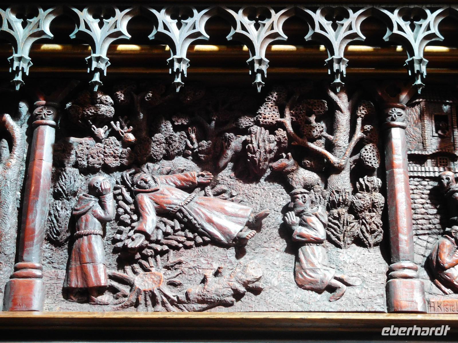 Anschließend schlenderten wir zum Hauptmarkt in die Marienkirche. Vor dem Hineingehen hörten wir noch das berühmte Bläsersignal des Hejnal vom Turm, das so abrupt abbricht. In der Kirche, der Reiseleiter hatte sich schon um die Eintrittskarten gekümmert, konnten wir Platz nehmen und Ewa erzählte uns den Lebenslauf des Veit Stoss, der um 1447 in Horb am Neckar geboren wurde und 1533 in Nürnberg starb. Er war als Bildhauer und -Schnitzer vor allem in Krakau und Nürnberg als Bildhauer - Arbeiten in Holz und Stein -, Maler und Kupferstecher tätig, vor allem in Krakau (1477-96) und Nürnberg (ab 1496 bis zu seinem Tod 1533) tätig, wobei er zeitweise aus Nürnberg wegen einer Verurteilung fliehen musste. Erstmals 1477 erscheint er in den Quellen, als er nach Krakau geht, um sein erstes Hauptwerk, das Hochaltarretabel der dortigen Marienkirche (bis 1489) und weitere Werke, wie das Grabmal des polnischen Königs Kasimir IV. Jagiello in der Krakauer Kathedrale (1492) zu schaffen. Reich geworden kehrt Veit Stoß 1496 nach Nürnberg zurück, wo er steinerne und hölzerne Skulpturen fertigt. Von den Fuggern beim Erwerb einer fast ausgebeuteten Goldmine bei Breslau betrogen ist er seit 1503 in ein langwieriges Gerichtsverfahren wegen Urkundenfälschung verstrickt. Ihm werden im Dezember 1503 zur Strafe beide Backen mit einem glühenden Eisen durchstoßen und er darf die Stadt nicht ohne Genehmigung des Rates verlassen, flieht dennoch 1504 nach Münnerstadt, kehrt aber 1505 freiwillig nach Nürnberg zurück, wo er erneut verhaftet wird. Ein von Kaiser Maximilian I. 1506 ausgestellter Gnadenbrief wurde vom Rat der Stadt Nürnberg nicht berücksichtigt. Dennoch wird ihm später (1514) erlaubt, in Nürnberg eine Gießwerkstatt zu errichten, um Figuren für das Grabmal des Kaisers zu schaffen, das heute in der Hofkirche zu Innsbruck steht. Auch die Nürnberger Patrizier bestellten weiter Werke bei ihm, so den „Englischen Gruß" in der Lorenzkirche (1517/18). Sein Sohn Andreas, der im Nürnberger Karmeliterkloster als Prior amtiert, beauftragt seinen Vater, sein letztes Werk, das Hochaltarretabel der Karmeliterkirche zu schaffen, das bewusst ohne farbige Fassung bleiben sollte (1520-23). Veit Stoß verstarb 1533 wohlhabend und wurde auf dem Nürnberger St. Johannisfriedhof begraben.