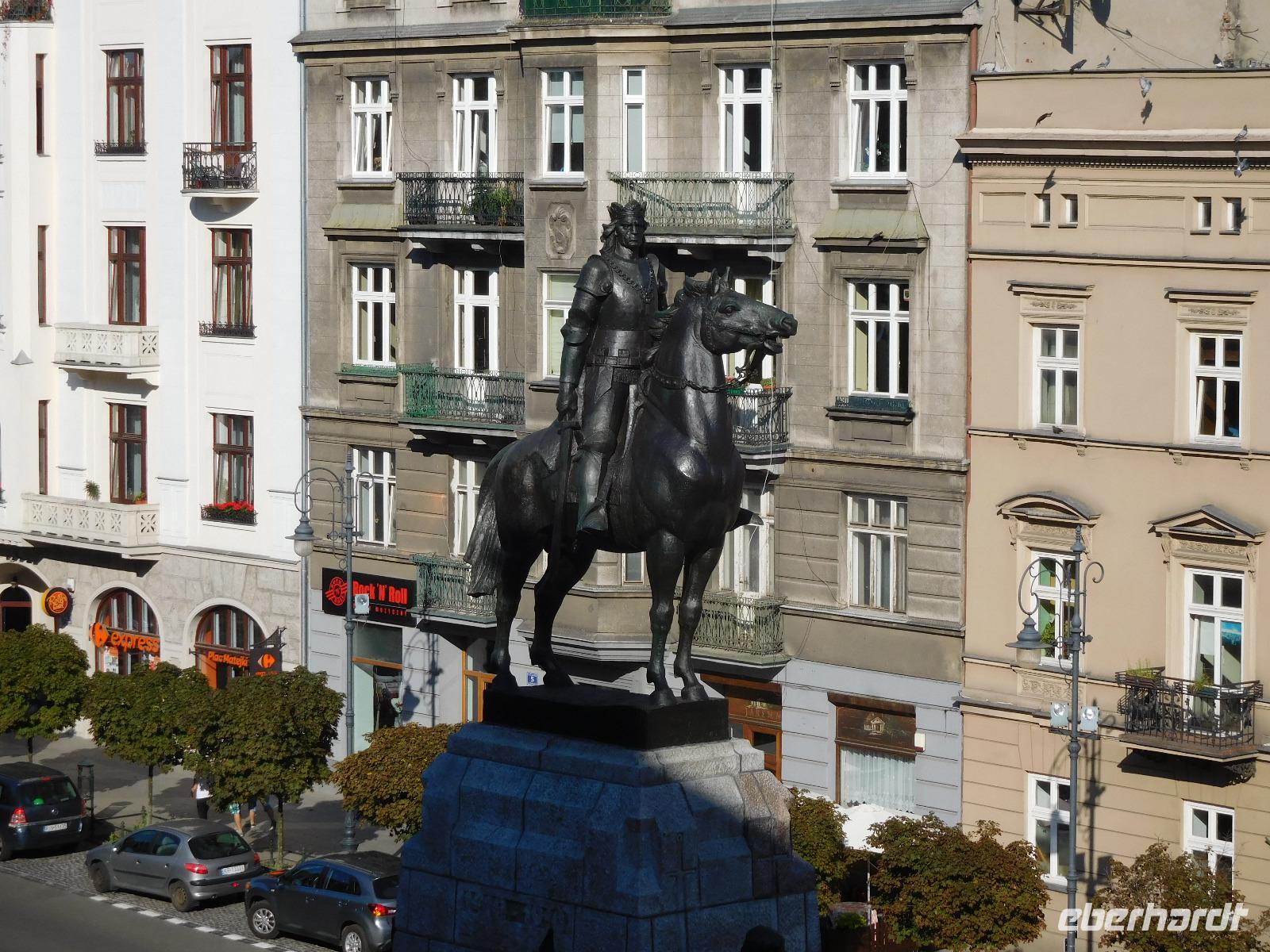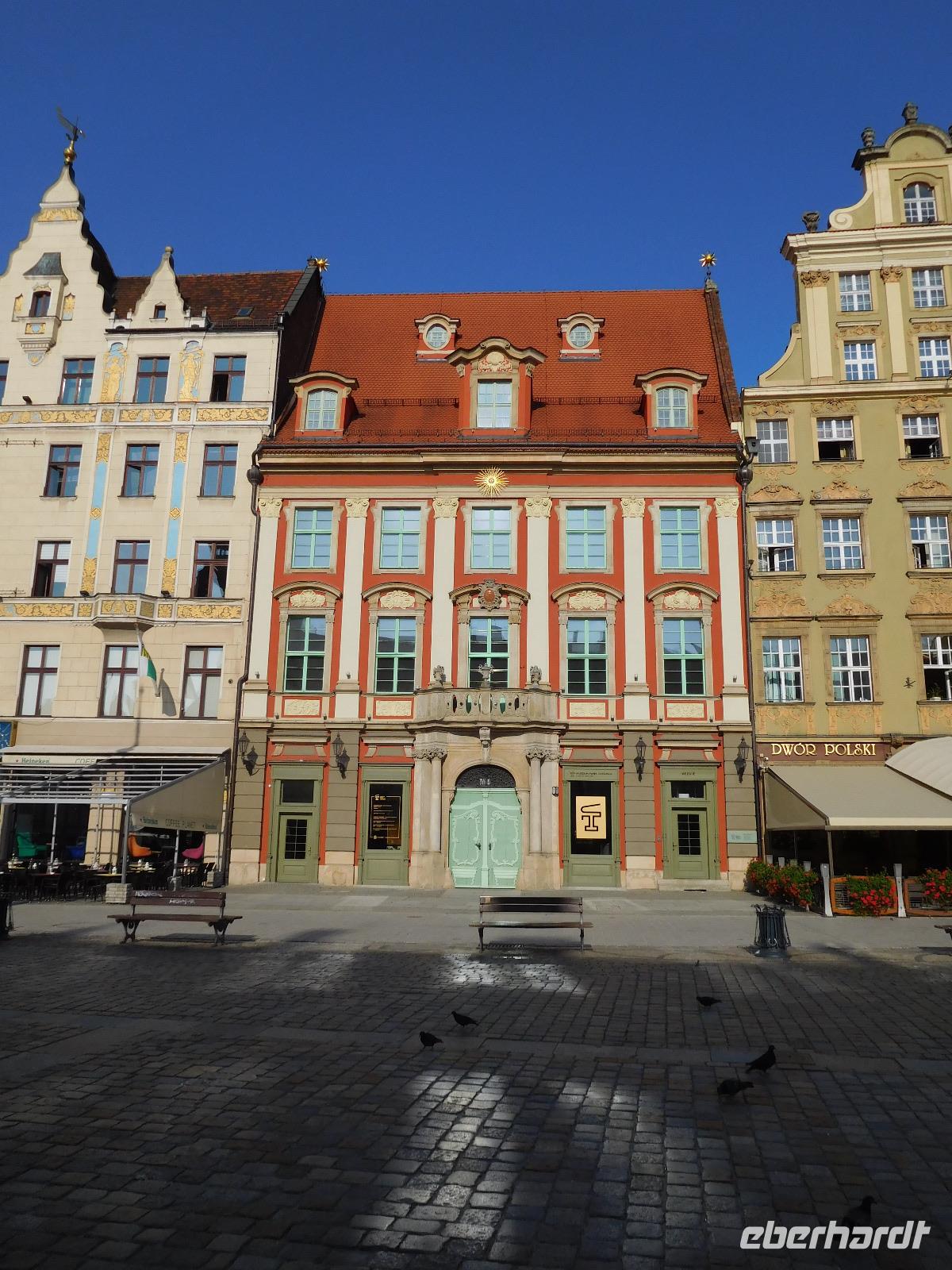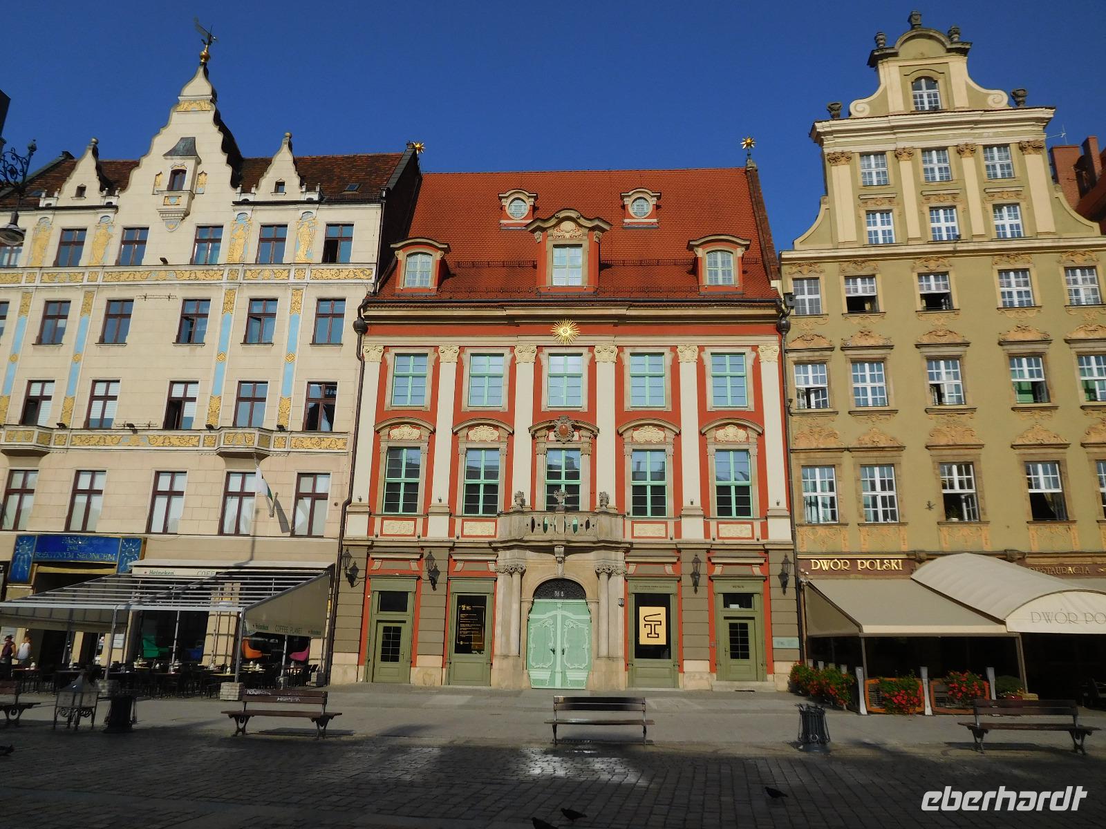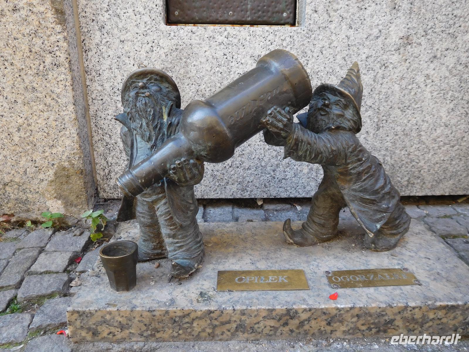 Dann liefen wir auf den riesigen Hauptmarkt und Frau Monika erklärte die wichtigsten Gebäude, natürlich zuförderst das gotische Rathaus aus dem 13. Jahrhundert, das man zu Beginn des 20. Jahrhunderts mit derb bäuerischen Figuren ergänzt hatte. Nachdem sie noch viele Tipps für kleine Besichtigungswege gegeben hatte, verabschiedete sie sich und die Gäste hatten noch Freizeit, die im belebten historischen Stadtzentrum wie im Fluge verging. Kurz vor sieben trafen wir uns bei der Gaststätte Pod Fredra, die nach dem volkstümlichen Breslauer Dichter Fredro benannt ist, dessen Denkmal direkt davor steht. Im Erdgeschoss wartete ein gemütlich ausgestatteter seperater Raum auf uns. Das Mahl war polnisch deftig, schmackhaft und überreichlich. Die meisten spülten mit Bier, ausgeschenkt im Tonkrug, das Ganze zünftig hinunter.