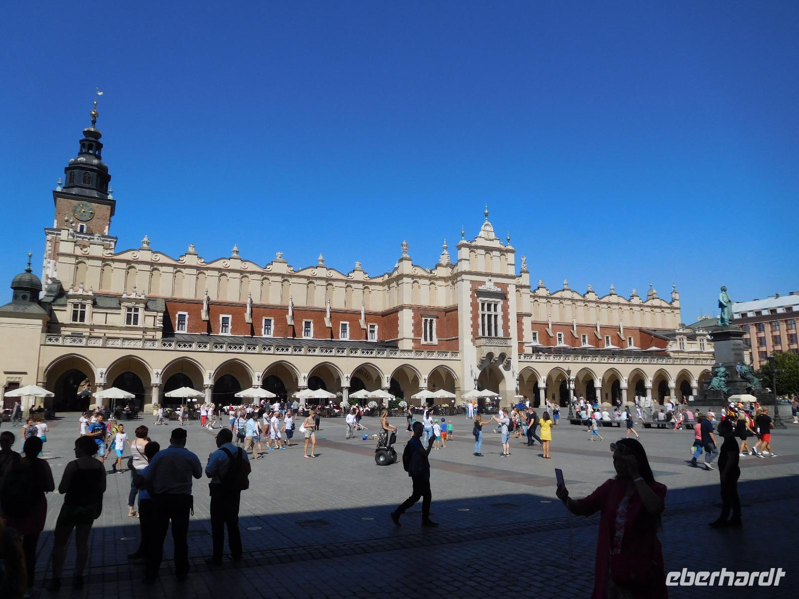 Nach der Führung holte ein Kleinbus acht Gäste ab zu einem Ausflug nach Auschwitz. Sie hatten den Besuch im größten Vernichtungslager der Nationalsozialisten gebucht und bekamen dort zunächst eine Führung im Stammlager, sowie im riesigen Vernichtungslager Birkenau. Andere Gäste trafen sich um halbsieben am Hotel mit Stadtführer Christian, um in einem nahe beim Markt liegenden Konzertsaal ein Klavierkonzert mit Werken von Chopin zu genießen. Der überwiegende Teil der Gruppe erkundete während entspannter Spaziergänge die vielen Sehenswürdigkeiten der heimlichen Hauptstadt Polens. So war auf dem Markt um die Tuchhallen ein großer Markt mit traditionellem Handwerk aufgebaut. Auf einer Bühne gaben Volkskunstgruppen aus allen Teilen Polens Proben ihres Könnens ab.