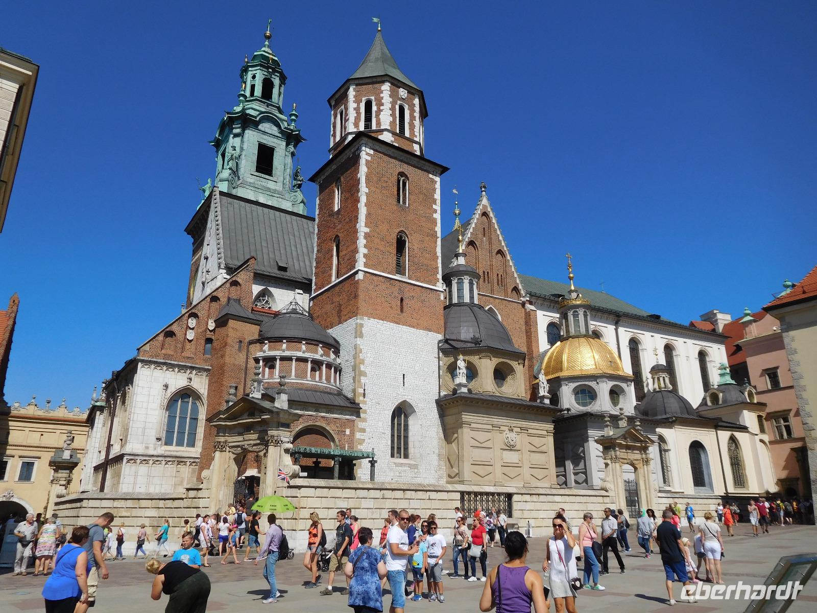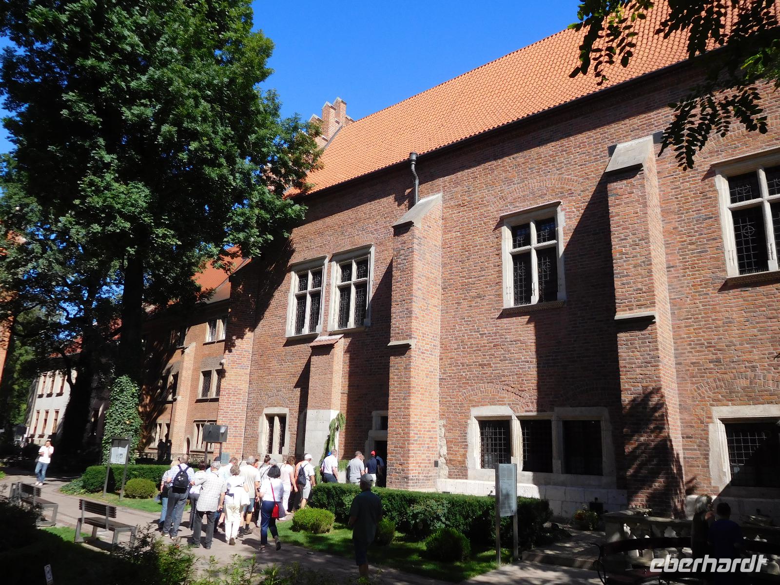 Nach einem sehr abwechslungsreich zelebrierten Frühstück holte uns Ewa ab und gemütlich schlenderten wir duch den Park des Promenadenrings zum Wawelhügel. Er ist der südlichste Ausläufer des Krakau-Tschenstochauer Jura, eines 161-155 Millionen Jahre alten Kalksteingebirges im südlichen Zentralpolen. Das ganze Gebiet ist stark verkarstet, und die Landschaft ist von Höhlen durchzogen. Auf der am Weichselufer liegenden Seite des Wawel führt eine solche Karsthöhle von den Burgmauern oben auf dem Hügel bis zu seinem Fuß. Nach ihrer Form gaben ihr die Menschen den Namen Drachenhöhle. So erzählt die Legende, dass hier einst ein Drache gehaust habe, bis der Ritter Krak kam und den Drachen durch List überwand. An diesem Platz wurde dann die Stadt Krakau gegründet, die nach dem Ritter benannt wurde. Historisch belegt ist, dass sich seit dem frühen Mittelalter an dieser Stelle eine Burg befand. Die komplexe Bebauung zeugt von einer über 1000-jährigen Baugeschichte. Dabei finden sich Zeugnisse aus allen Stilepochen wie der Romanik, der Gotik, der Renaissance sowie des Barock. Während der Herrschaft der letzten Jagiellonen erlebte der Wawel sein Goldenes Zeitalter.