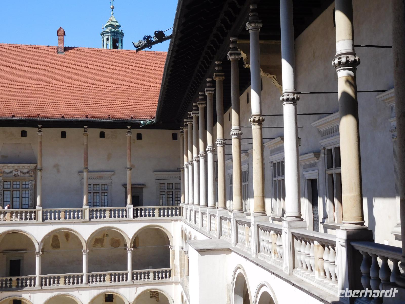 Zu jener Zeit war der Wawel eines der prächtigsten Schlösser in Europa, die Residenz des größten Flächenstaates auf dem Kontinent und zugleich der Sitz der Jagiellonendynastie, deren Länder sich von der Ostsee bis zum Schwarzen Meer und bis zur Adria erstreckten. Die Dachziegel und Säulen sollen vergoldet gewesen sein. Die Außenwände waren mit bunten Fresken bedeckt. Im Schloss befand sich die weltweit größte Sammlung von über 300 Wandteppichen, welche in Arras aus Goldfäden gewirkt worden waren. Ein kurioses Detail ist die Dekoration der Kassettendecken im Saal der Gesandten, die aus geschnitzten und zum Teil grotesk dargestellten Ebenbildern menschlicher Köpfe besteht. Das Schloss wurde zum Vorbild Dutzender Magnatenresidenzen in ganz Mittel- und Osteuropa.