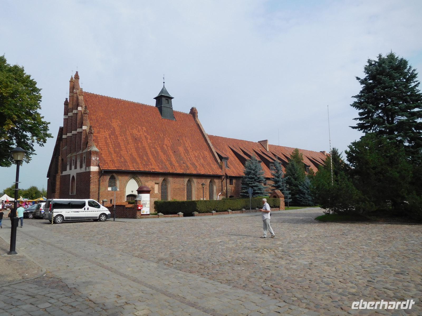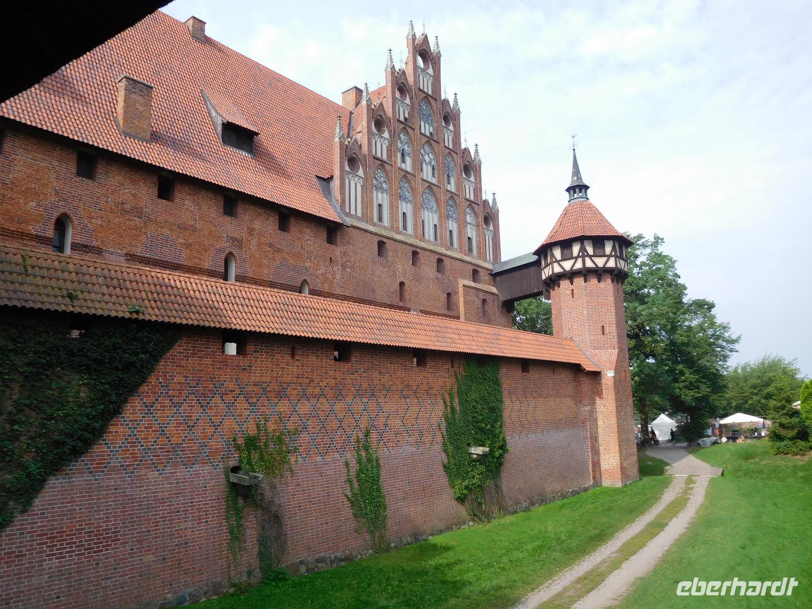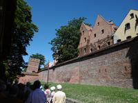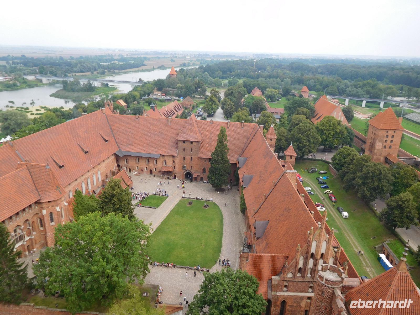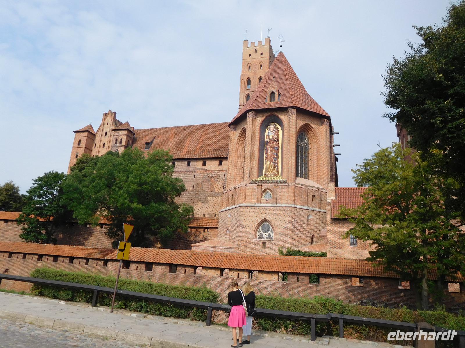 Um 08.30 Uhr fuhren wir zur Marienburg, einer der größten Burganlagen überhaupt und die größte aus Backstein. Wir hatten mit der aus dem Ort stammenden Gästeführerin eine sehr gute Führung durch die vielen gotischen Räume und Gänge. In diesem Jahr kann erstmals die Kirche der Burg ohne Gerüste bestaunt werden. Schon zum Auftakt hatten wir von außen die unlängst wieder am Chor angebrachte über acht Meter hohe Madonnenfigur bestaunt, die aus einem Puzzle tausender Restteile wieder in einstiger Pracht erstanden ist. Innen neben Resten mittelalterlicher und historistischer Wandmalereien ein prächtiger Altar, den ein Hochmeister aus dem sächsischen Herrscherhause der Wettiner gestiftet hatte. Ein romantischer Spaziergang durch die Wehrmauern führte zur Gruftkapelle. Die anschließende Pause bot Möglichkeiten zum Essen oder zum Besteigen des Bergfrieds der imposanten Anlage, deren Umfang man von oben erst so richtig einschätzen konnte.