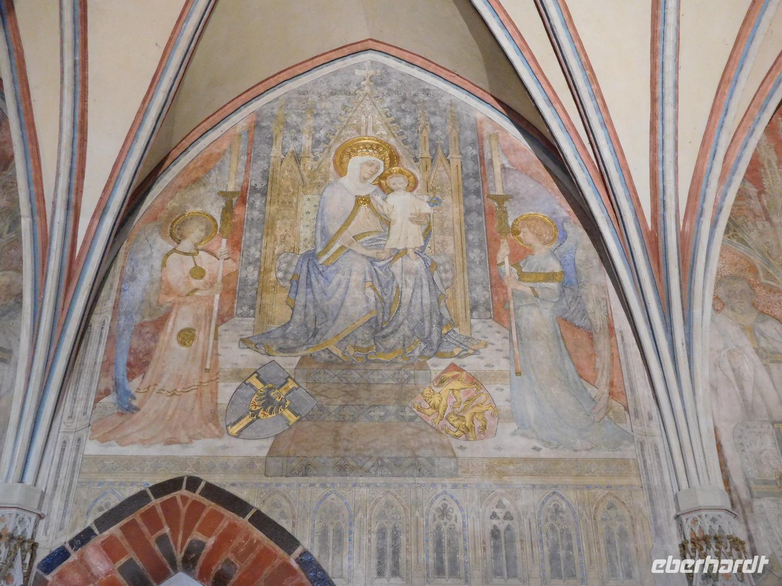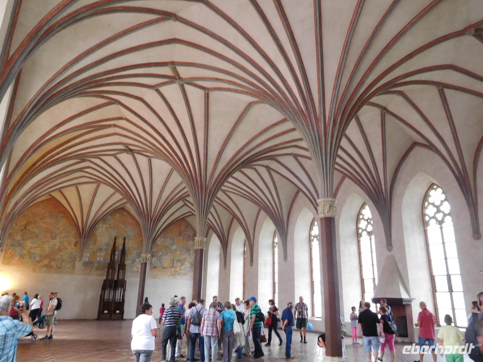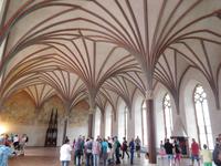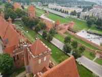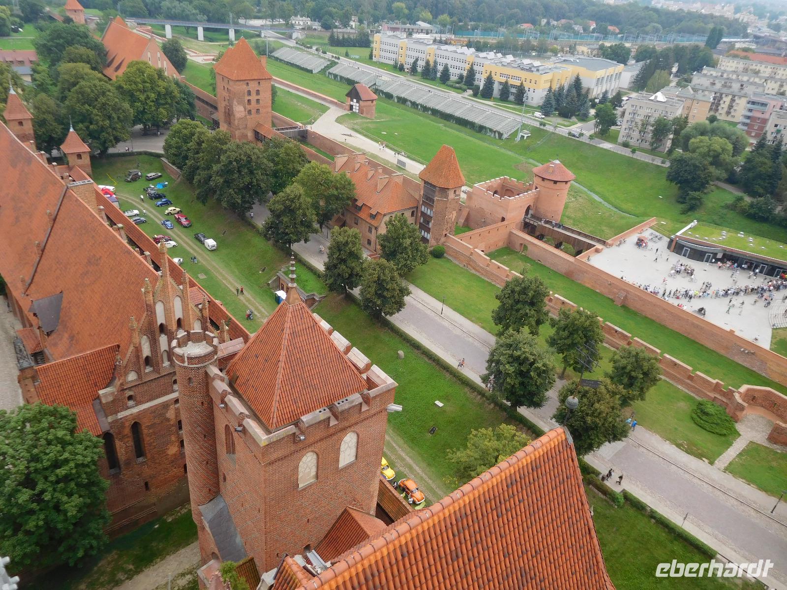 Um 08.30 Uhr fuhren wir zur Marienburg, einer der größten Burganlagen überhaupt und die größte aus Backstein. Wir hatten mit der aus dem Ort stammenden Gästeführerin eine sehr gute Führung durch die vielen gotischen Räume und Gänge. In diesem Jahr kann erstmals die Kirche der Burg ohne Gerüste bestaunt werden. Schon zum Auftakt hatten wir von außen die unlängst wieder am Chor angebrachte über acht Meter hohe Madonnenfigur bestaunt, die aus einem Puzzle tausender Restteile wieder in einstiger Pracht erstanden ist. Innen neben Resten mittelalterlicher und historistischer Wandmalereien ein prächtiger Altar, den ein Hochmeister aus dem sächsischen Herrscherhause der Wettiner gestiftet hatte. Ein romantischer Spaziergang durch die Wehrmauern führte zur Gruftkapelle. Die anschließende Pause bot Möglichkeiten zum Essen oder zum Besteigen des Bergfrieds der imposanten Anlage, deren Umfang man von oben erst so richtig einschätzen konnte.