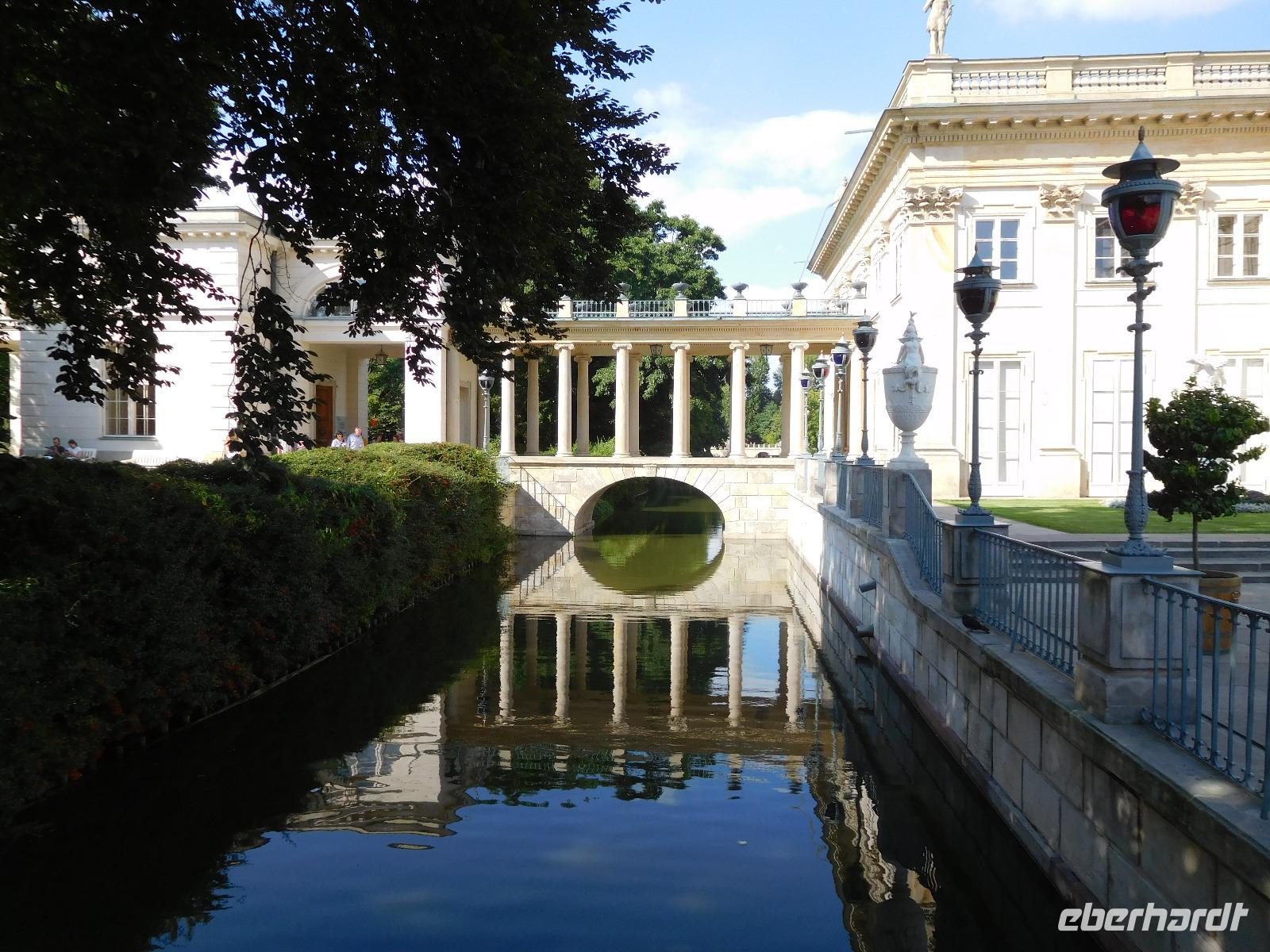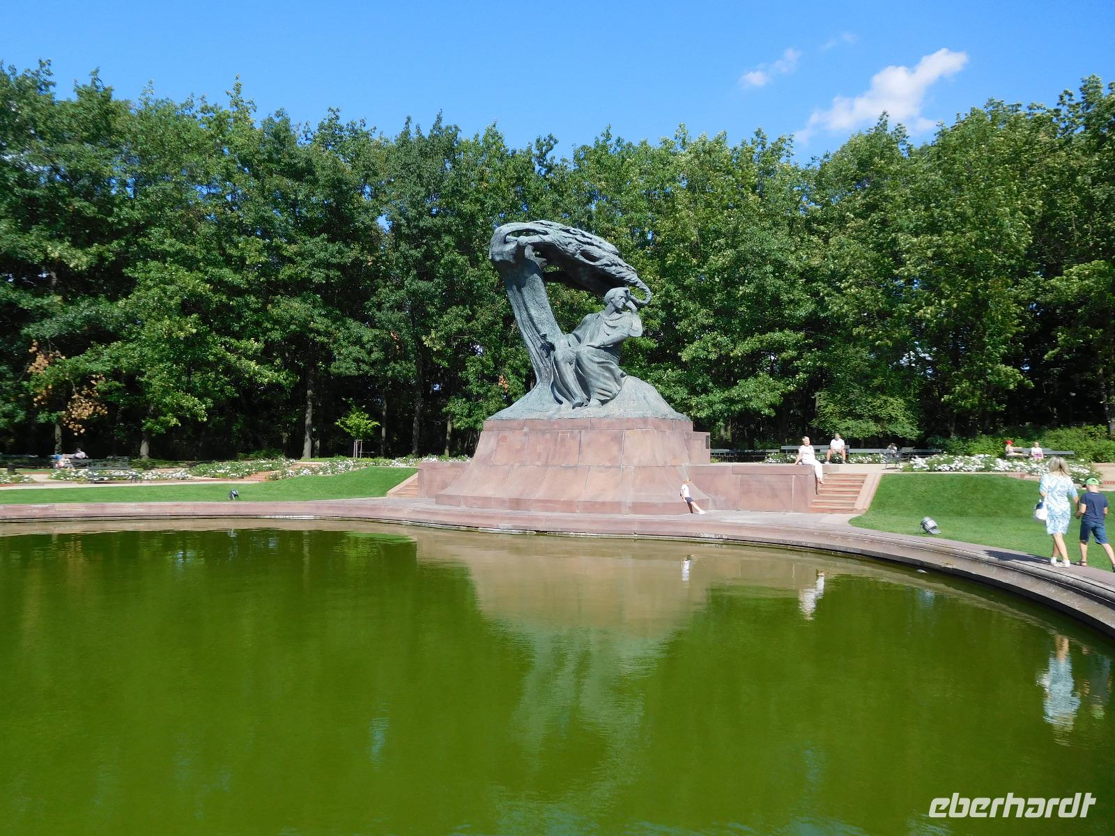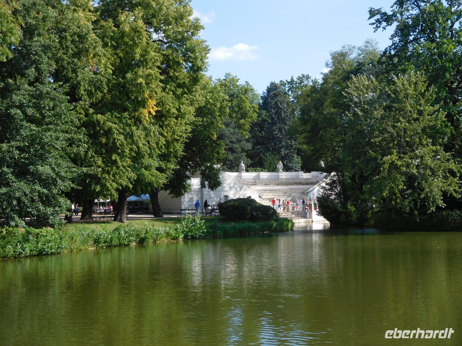 Abschließend spazierten wir durch die grüne Lunge der Großstadt, die Lazienki Królewski oder königliche Bäder, die im 17. Jahrhundert auf dem Gebiet von Burg und Ort Jazdow entstanden. Dies war der erste hiesige Besiedlungsplatz, bis litauische Eroberer die Bewohner vertrieben, die dann ein neues Warschau auf dem Platz der heutigen Altstadt gründeten. In Jazdow baute bereits König Siegmund III. Wasa ein erstes Schloss und Prinz Lubomirski ließ im 17. Jahrhundert durch einen Holländer einen ersten Badepavillon bauen- daher der Name Bäder. Aus dem Pavillon wurde ein Wasserschlösschen und zahlreiche Parkbauten, zum Schluß im klassizistischen Stil, kamen hinzu. Künstler und Gärtner verwandelten das Terrain in eine Rousseausche Ideallandschaft mit Teichen, Bosketten, Inselchen und antikisierenden Bauten. Selbst ein Amphitheater fehlt nicht. Nach der zweiten polnischen Teilung 1795 fiel der Besitz an den Zaren Alexander I., der ihn noch erweitern ließ. Seit 1918 steht er allen Besuchern offen.