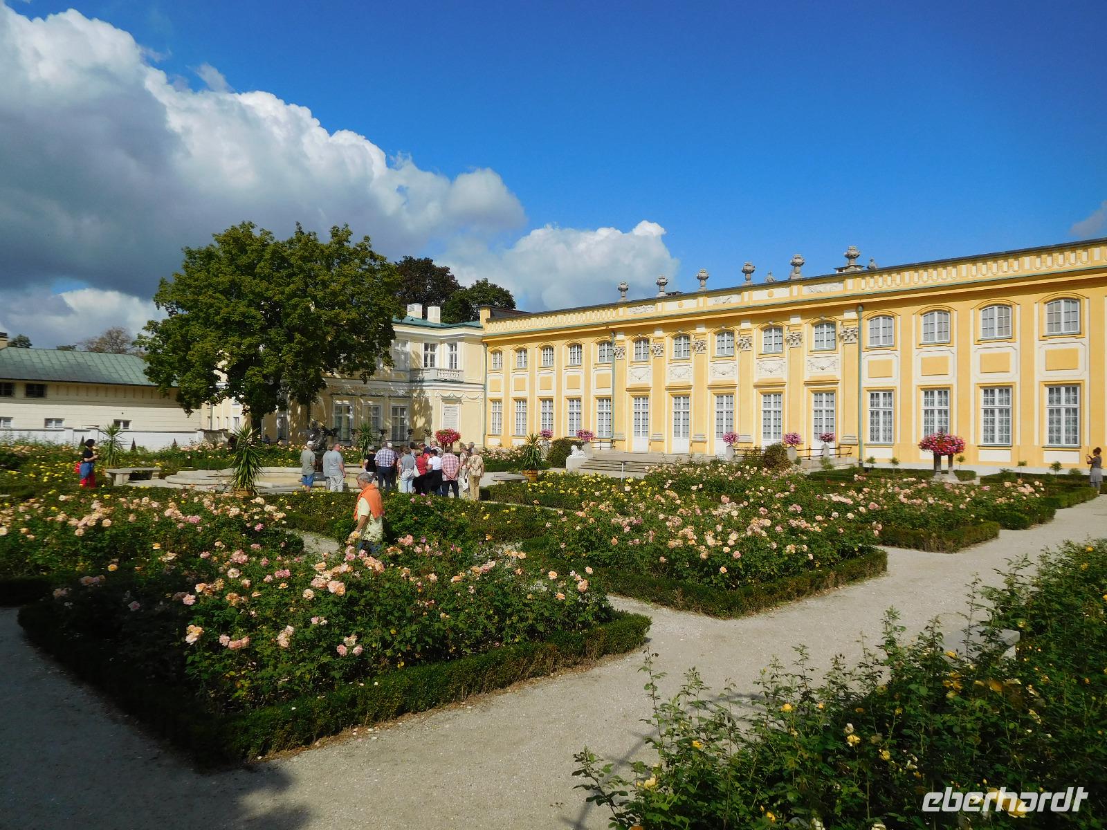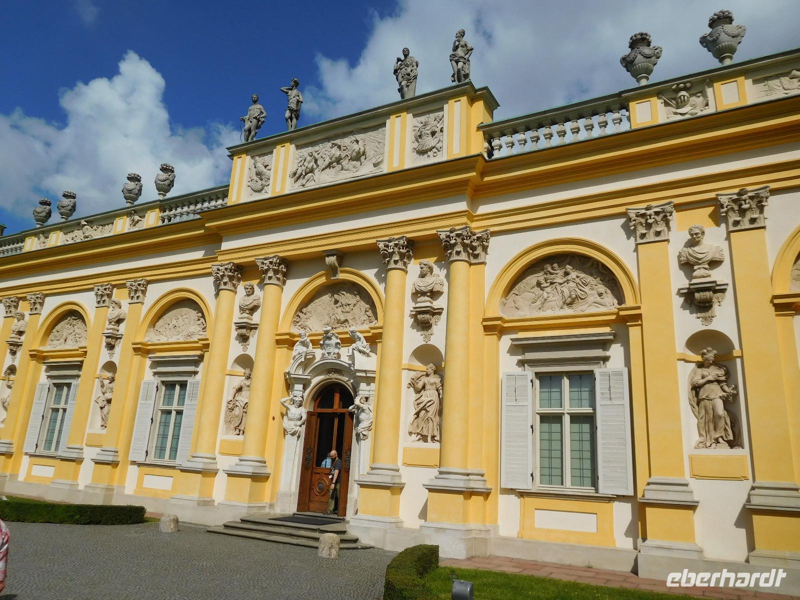Nach dem Hotelfrühstück holte uns eine andere Ewa ab zur Besichtigung des Königsschlosses in Wilanow. Zuerst schlenderten wir durch den herrlichen Park. Die Eintrittskarten hatte der Reiseleiter im Namen von Eberhardt Travel als kleine Überraschung spendiert. Im Erdgeschoss des Palastes erinnert viel an die Besitzerfamilie, insbesondere an den Entsatz König Sigmund III. Sobieski, der 1683 Wien verteidigte und die Schlacht am Kahlen Berg gewann. Im oberen Geschoss waren viele Fürstenporträts, vornehmlich aus dem 19. Jahrhundert zu bewundern. Anschließend fuhr der Bus zuerst zum spektakulärsten Kirchenneubau der Stadt. In moderner Betonbauweise entstand in Wilanow eine riesige Kuppelkirche, die unlängst von Papst Franciskus geweiht wurde, als dieser zum katholischen Weltjugendtag in Polen weilte. Der Bau erscheint mir als eine misslungene Mischung aus Berliner Kanzleramt und Reichstagskuppel, aber zum Glück entstehen, wie bei allen neuen polnischen Pilgerstätten, diverse Einkaufszentren im Umkreis. Wahlweise ging es dann per Bus zum Nationalmuseum, in die Altstadt oder zum Hotel. So konnte jeder nach seinen Neigungen den Nachmittag in Warschau gestalten. Einige erkundeten die Alt- und Neustadt und spazierten durch den von August dem Starken gestifteten und von Pöppelmann gestalteten sächsischen Park ins Hotel zurück, was etwa eine halbe Stunde Fußweg bedeutet. Einige Gäste schauten sich mit dem Reiseleiter die unermesslich wertvollen Ausstellungsstücke des Nationalmuseums an. Eine Abteilung zeigt die schönsten mittelalterlichen Altäre und Figuren aus den Kirchen Schlesiens und Preußens. Warum hier im polnischen Nationalmuseum ausgerechnet nur die Schätze der seit dem Mittelalter vorwiegend deutsch besiedelter Gebiete und nicht die altpolnischer Landschaften zu sehen sind, ist schon ein eigenartig Ding. Dafür gibt es sehr viel polnische Malerei, vornehmlich aus den letzten beiden Jahrhunderten zu sehen. Schon durch die Größe wirkt Jan Matejkos Riesengemälde von der 1410 gefochtenen Schlacht bei Grunwald oder Tannenberg, wie sie in der deutschen Geschichtsschreibung genannt wird. Zu unserem besonderen Glück präsentierte eine Sonderschau Renaissancegemälde aus dem norditalienischen Brescia. Neben zwei Raffaels gab es einen Tizian und mehrere Bilder von Lorenzo Lotto zu bestaunen. Daneben Memling und einen großen Dürerzyklus aus dem Vatikan. Warschau für alle ein vielleicht etwas anstrengendes, aber auf jeden Fall schönes Erlebnis gewesen.