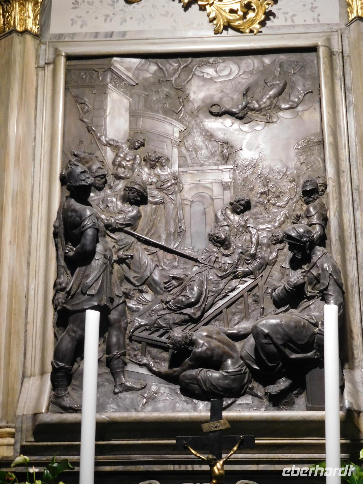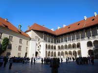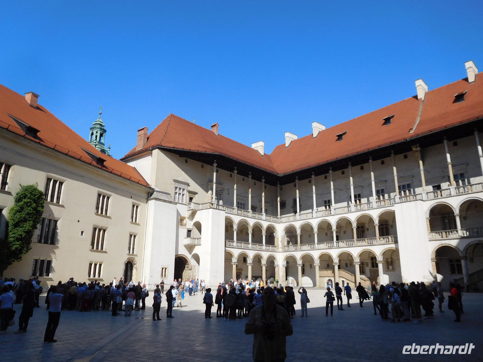 Um neun holte uns Elisabeth vom Hotel ab und wir spazierten die kurze Strecke zum Wawelhügel hinauf. Nachdem uns Ela die gesamte historische Topographie des polnischen Nationalheiligtums erläutert hatte, besichtigten wir die Krönungskathedrale des heiligen Wenzel und Stanislaus, dem dritten Dombau an dieser Stelle. Die künstlerisch teilweise äußerst qualitätvollen Grabmäler polnischer Herrscher gaben Gelegenheit zu einem neuerlichen Streifzug durch die imperiale Geschichte des einstigen Großreichs. Anschließend wechselten wir in die königliche Residenz. Mit Bona Sforza war eine Italienerin Königin geworden, die die Renaissance an den Hof brachte und deren Baumeister Francesco Fiorentino die offene Arkadenlösung des Innenhofes schuf, die sich allerdings in den harten Krakauer Wintermonaten nicht wirklich bewährte. Prächtig sind die Innenräume mit Malereien des Dürerbruders Hans, besonders schön die Decke des Gesandtensaales mit 30 von ehemals 194 geschnitzten Köpfen, die die verschiedenen Stände darstellen. Höhepunkt ist die in der Welt einmalige Sammlung von Brüsseler Wandteppichen, auch wenn nur noch 136 von ehemals 360 in Polen sind. Die Bilderzyklen erzählen die Paradiesgeschichte, sowie die Geschichte von Noah und dem Bau der Arche und als Kontrast die vom Bau des Turms zu Babel.