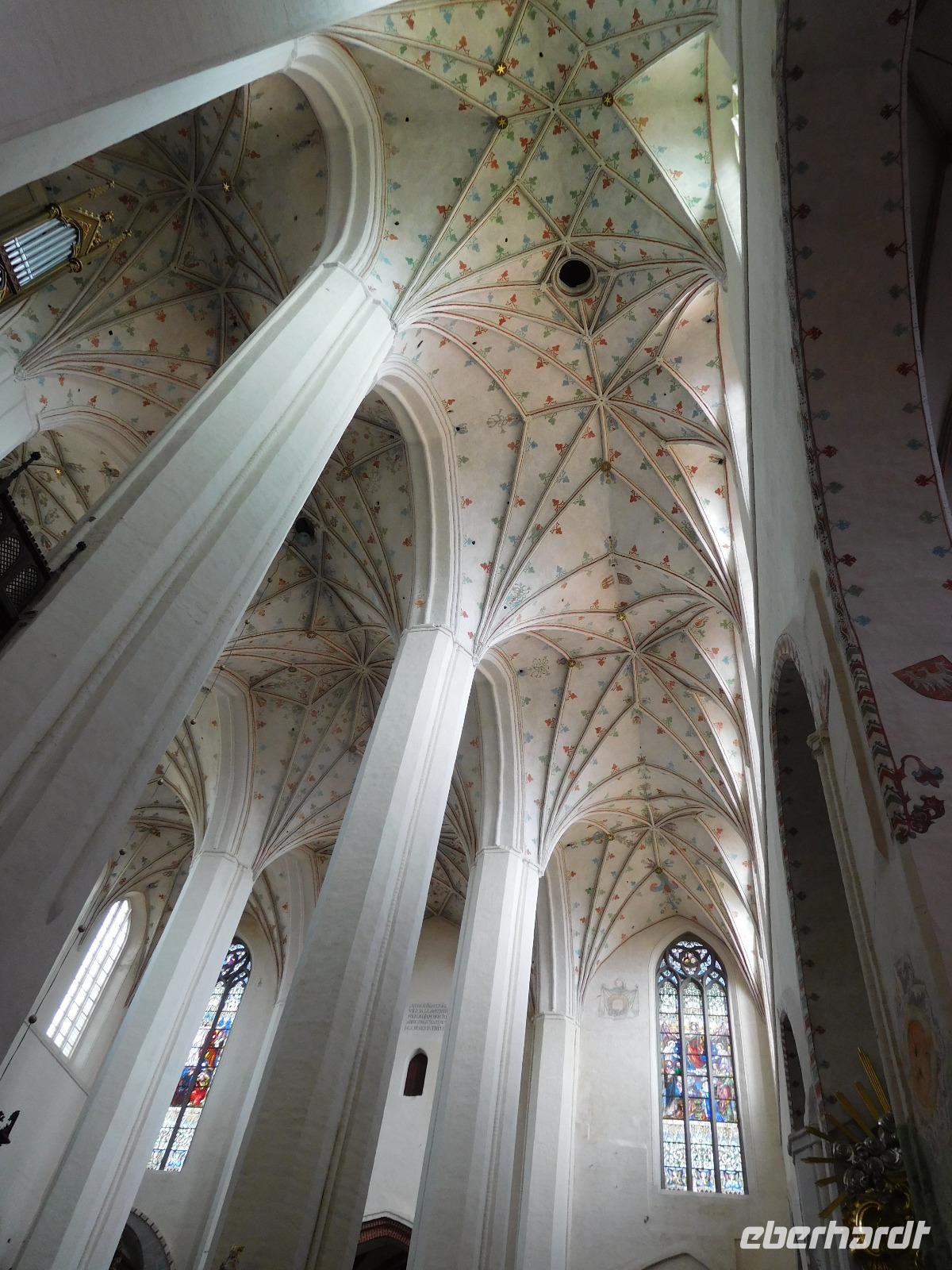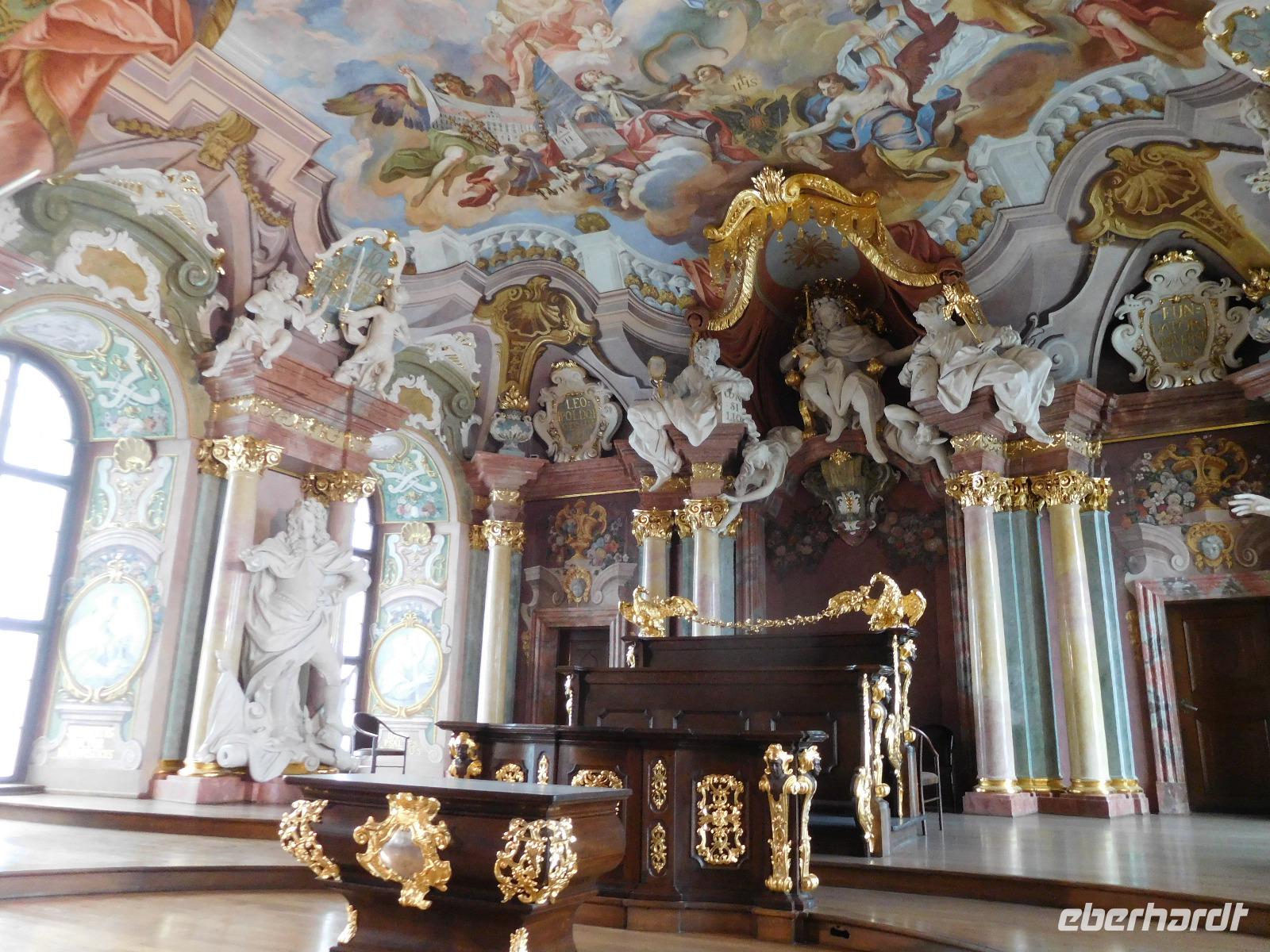 Die erste Empore ist mit 28 Wappendarstellungen des Adels aus dem Umkreis bemalt. Der Altar von Martin Schneider entstand im Jahr 1672. Das Gestühl der Geistlichen an der Nordseite des Mittelschiffs ist mit Allegorien der drei göttlichen Tugenden Glaube, Hoffnung und Liebe verziert. In der Kirche sind vier mit Bildern und Inschriften geschmückte Beichtstühle aufgestellt. Themen der Gemälde sind König David in Reue mit seiner Harfe, Petrus in Reue nach seiner dreimaligen Verleugnung Jesu und die Sünderin zu Füßen Jesu beim Gastmahl des Pharisäers. Die vierte Darstellung findet sich sonst nicht bei traditionellen Beichtstuhlbildern: einem knienden Sünder erscheint Jesus mit einer Tafel, auf der zu lesen ist: „Dir sind deine Sünden vergeben".