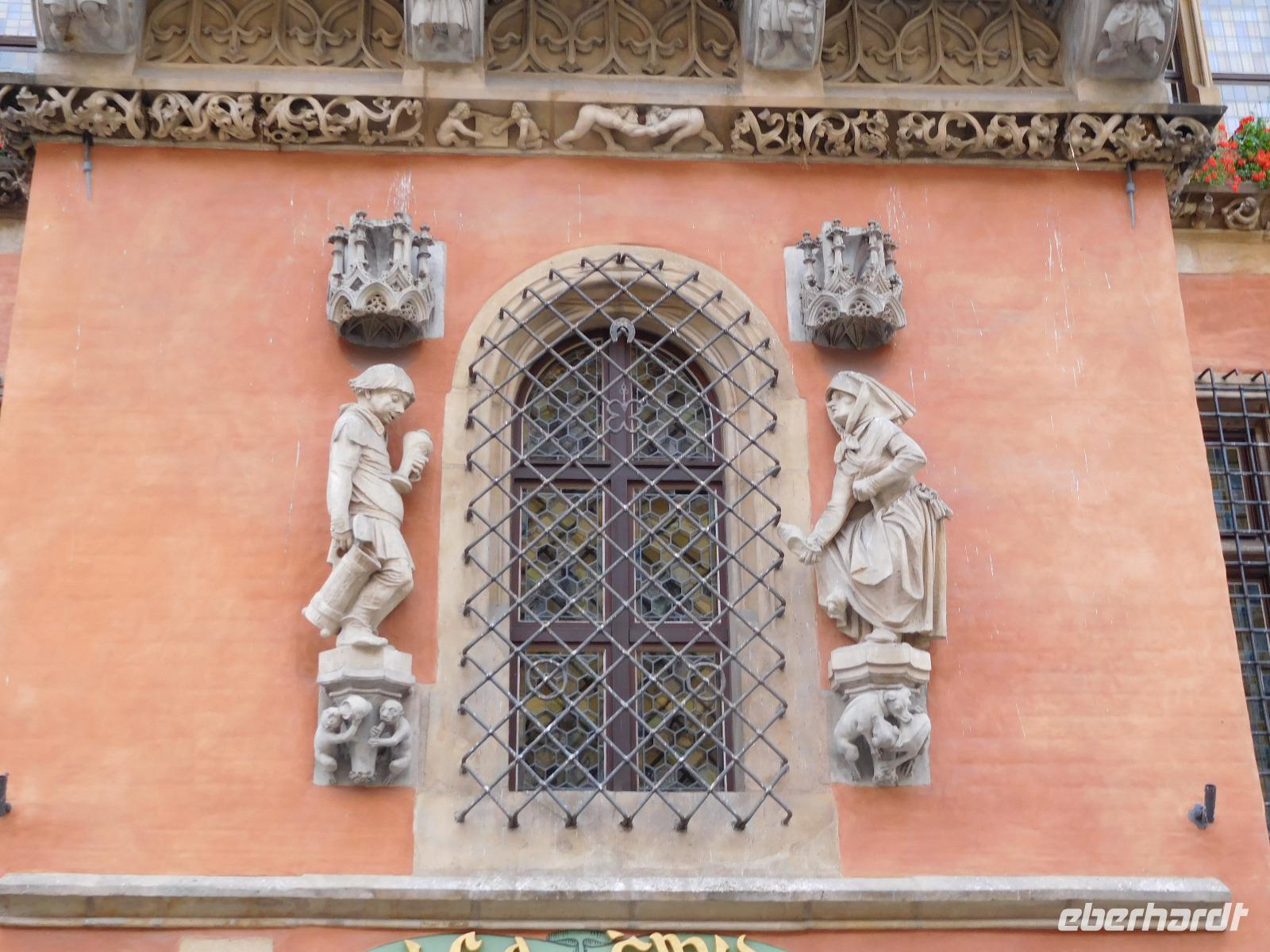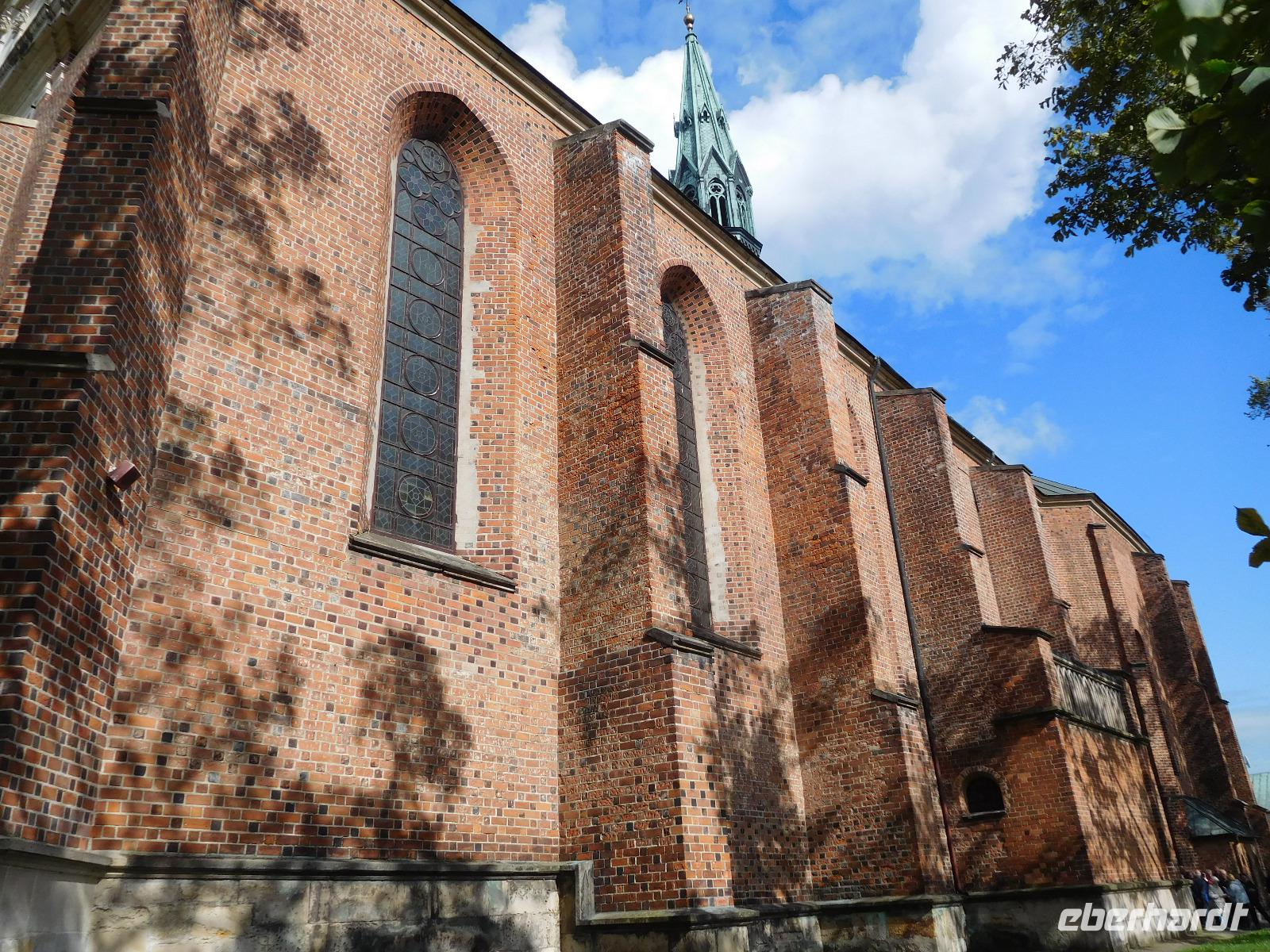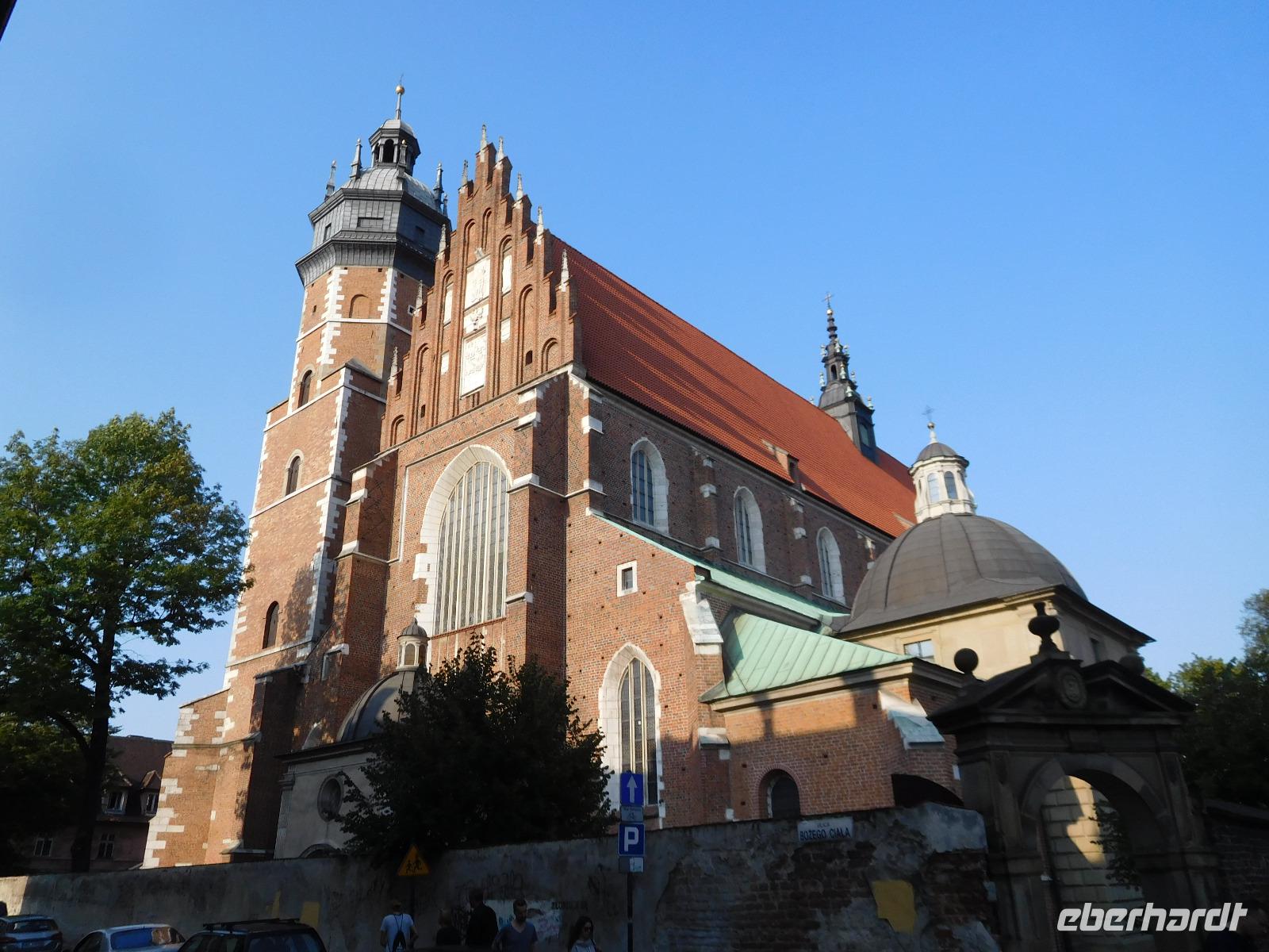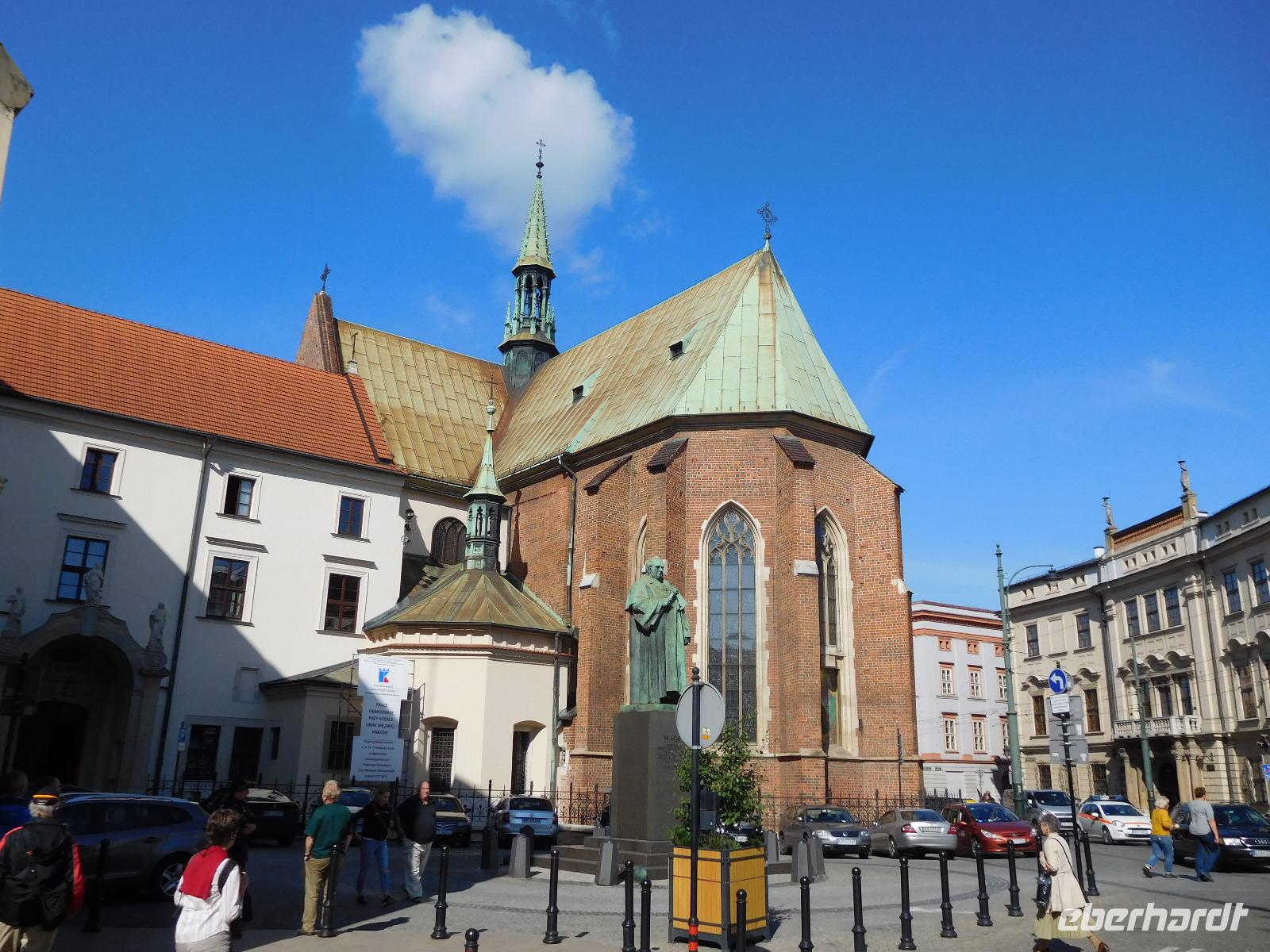 Von unserem strategisch günstig zwischen Altstadt, Wawel und Kazimierz gelegenem Hotel in der Gertraudenstraße führte uns Stadtführerin Elisabeth oder Ela durch die Grodzka, eine der ältesten Straßen und Teil der Via Regia, sowie Krönungsweg. Neben prächtigen Häusern von Kanonikern und reichen Bürgern passierten wir die romanische Andreaskirche, sowie die benachbarte Jesuitenkirche Peter und Paul, die nach dem Vorbild von Il Gesu in Rom gebaut wurde. Auf dem halben Weg zum Markt kann man in der Stadtinformation nicht nur Material über Krakau bekommen, sondern auch einige für den Dom bestimmte Jugendstilfenster von Stanislaw Wyspianski bestaunen, der auch die benachbarte Franziskanerkirche ausgemalt und mit herrlichen Fenstern geschmückt hat. Mehr neogotisch beeinflusst kommt dagegen die gegenüber liegende Dominikanerkirche daher. Ein Abstecher führte ins Universitätsviertel, wo wir im Innenhof des gotischen Collegium Maius um elf Uhr dem Öffnen der mechanischen Uhr beiwohnen konnten. Gründer, Kanzler und Amtsträger der nach Prag zweitältesten Universität Mitteleuropas spazieren im Reigen durch ein Türchen heraus in ein anderes hinein. Dazu ertönt das Gaudeamus Igitur.