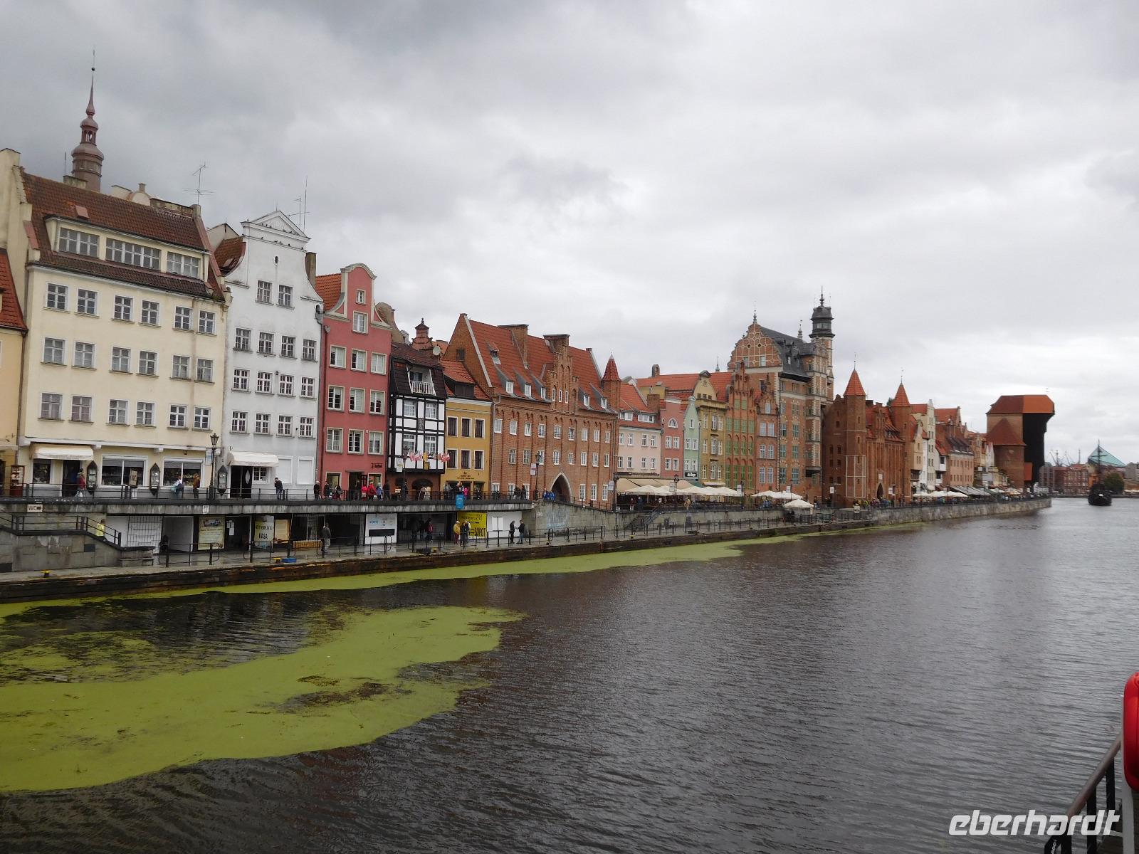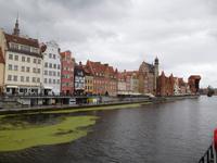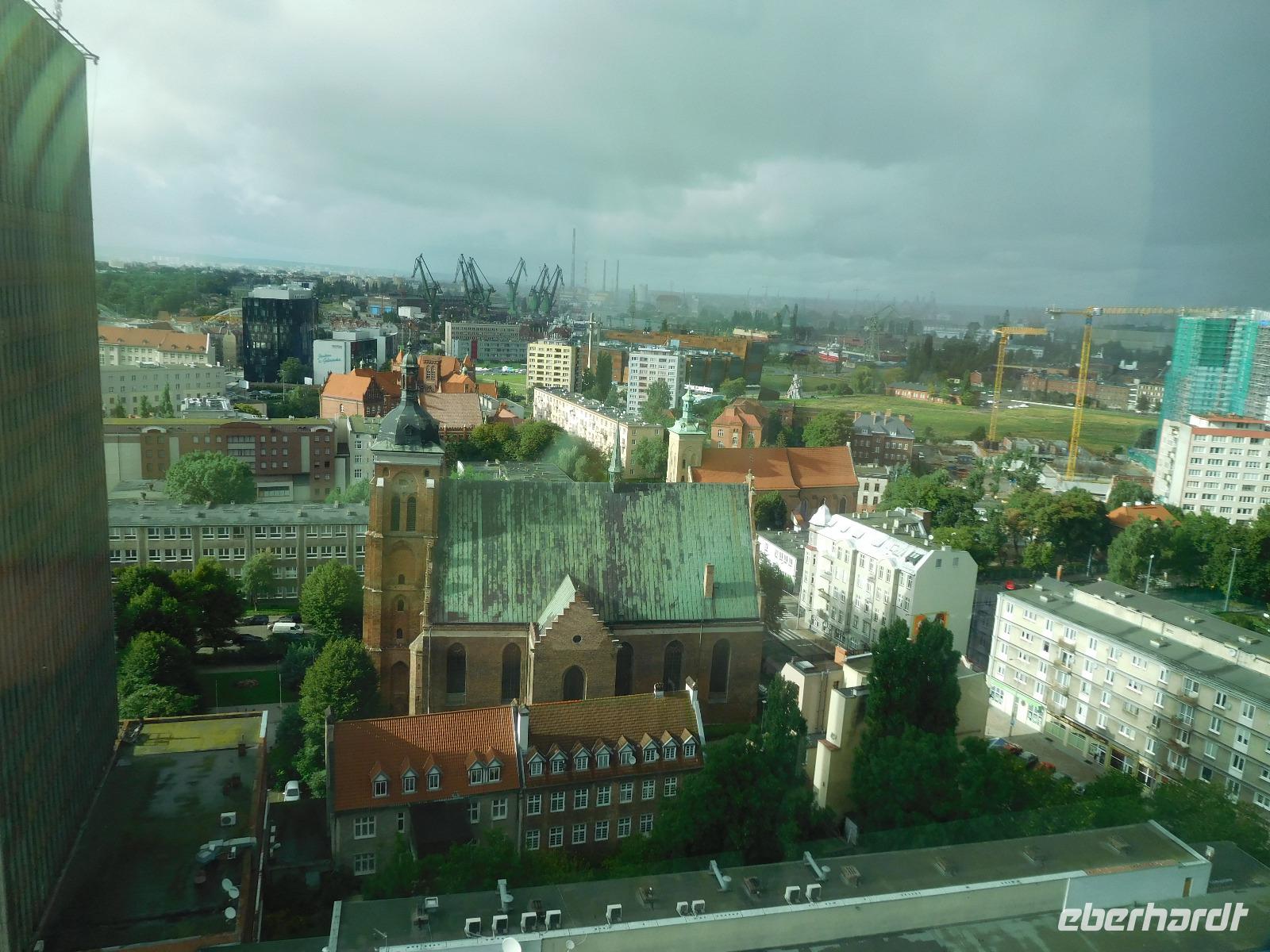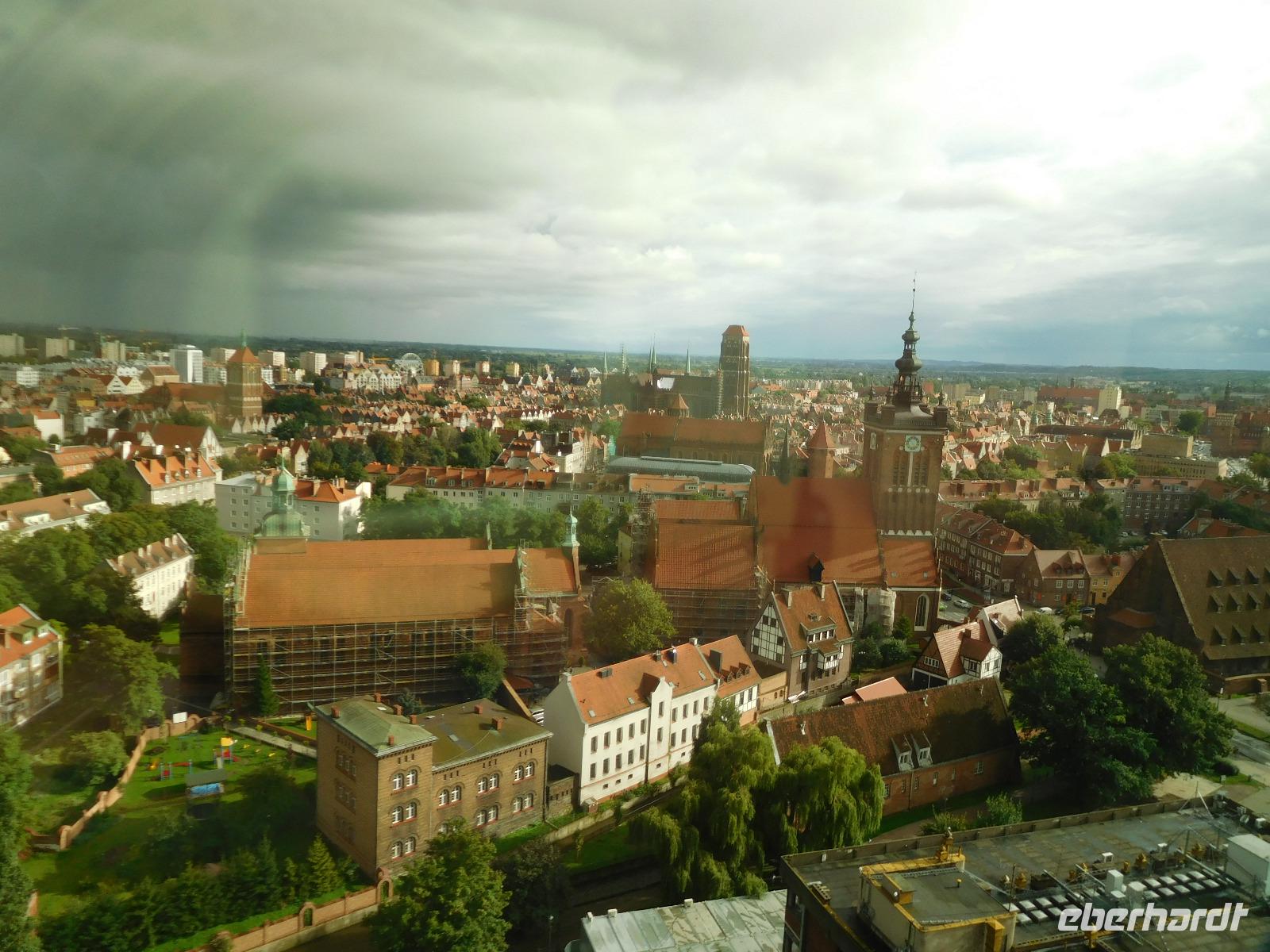Auch in Danzig bekamen wir umgehend die Zimmer und anschließend bot der Reiseleiter einen kleinen Spaziergang an. Unser Hotel lag ja direkt in der Altstadt zwischen Bartholomäus- und Katharinenkirche, hinter der wiederum die Brigittinnenkirche liegt, allesamt hochgotische Backsteinbauten. Gegenüber liegt die Große Mühle, im Mittelalter einer der frühen Industriebetriebe des Ordens. Dahinter das in holländischem Reaissancestil erbaute altstädtische Rathaus mit dem Denkmal des Astronomen Jan Hevelius, der auch Bürgermeister war. Von hier zur Markthalle und der dahinter liegenden Nikolaikirche und schon verließen wir die Altstadt und wechselten zur nach Kulmer Recht gegründeten Rechtstadt, sahen das Zeughaus und liefen auf dem Königsweg durch das Grüne Tor zur Mottlau, an der einst der Hafen mit seinen Kaufmannshäusern und backsteinernen Stadttoren war. Hier spazierten wir bis zum berühmten riesigen Krantor, das 1442-44 gebaut wurde, um Schiffsmasten aufrichten zu können. Ab hier hatten alle einen guten Überblick über die Struktur der Altstadt und konnten gut ihren jeweiligen Interessen nachgehen, bevor es im Hotel ein leckeres Abendbuffet gab.