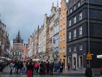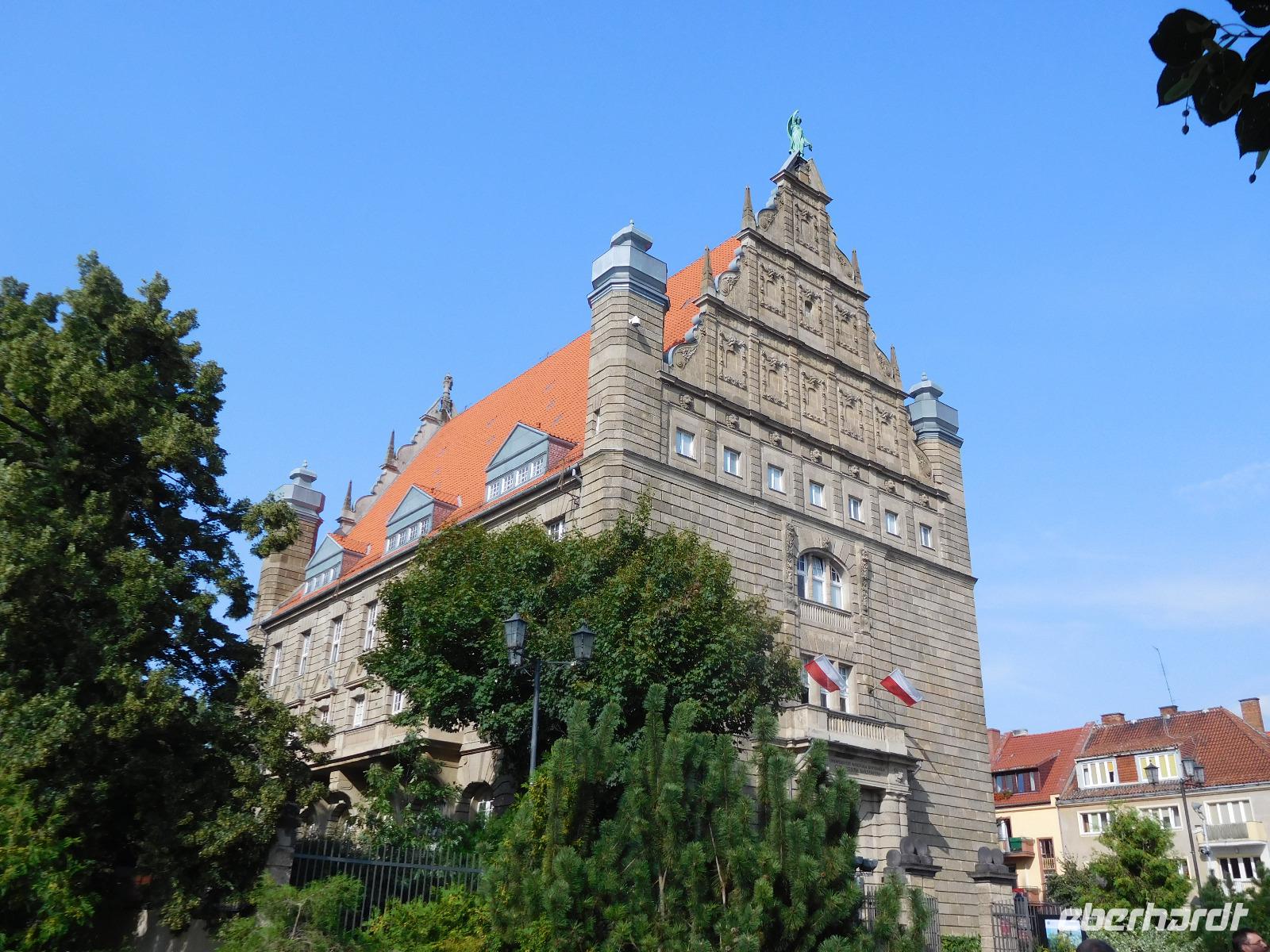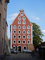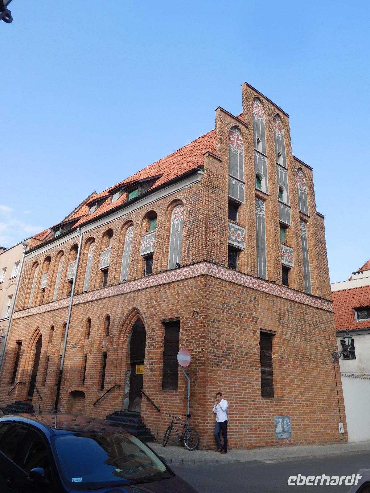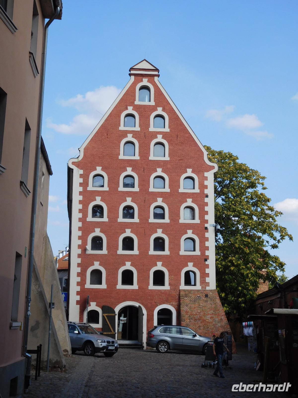 Auch in Danzig bekamen wir umgehend die Zimmer und anschließend bot der Reiseleiter einen kleinen Spaziergang an. Unser Hotel lag ja direkt in der Altstadt zwischen Bartholomäus- und Katharinenkirche, hinter der wiederum die Brigittinnenkirche liegt, allesamt hochgotische Backsteinbauten. Gegenüber liegt die Große Mühle, im Mittelalter einer der frühen Industriebetriebe des Ordens. Dahinter das in holländischem Reaissancestil erbaute altstädtische Rathaus mit dem Denkmal des Astronomen Jan Hevelius, der auch Bürgermeister war. Von hier zur Markthalle und der dahinter liegenden Nikolaikirche und schon verließen wir die Altstadt und wechselten zur nach Kulmer Recht gegründeten Rechtstadt, sahen das Zeughaus und liefen auf dem Königsweg durch das Grüne Tor zur Mottlau, an der einst der Hafen mit seinen Kaufmannshäusern und backsteinernen Stadttoren war. Hier spazierten wir bis zum berühmten riesigen Krantor, das 1442-44 gebaut wurde, um Schiffsmasten aufrichten zu können. Ab hier hatten alle einen guten Überblick über die Struktur der Altstadt und konnten gut ihren jeweiligen Interessen nachgehen, bevor es im Hotel ein leckeres Abendbuffet gab.