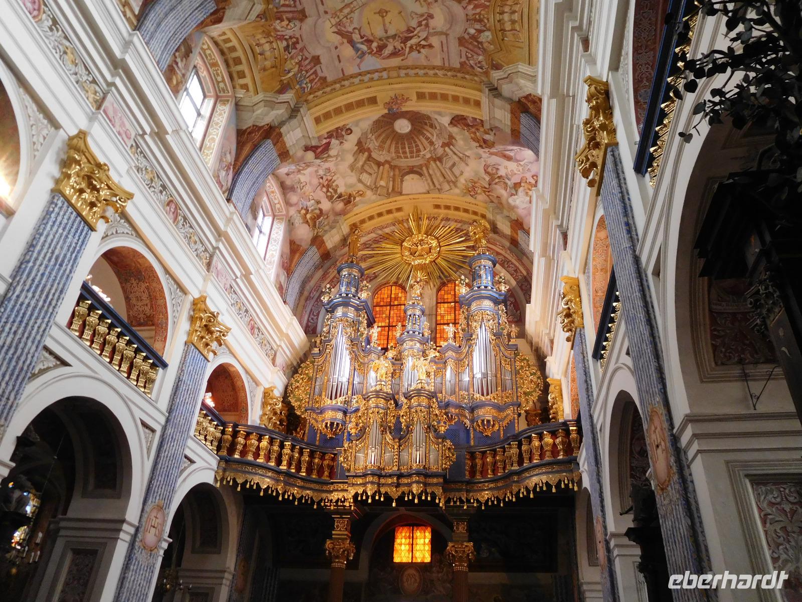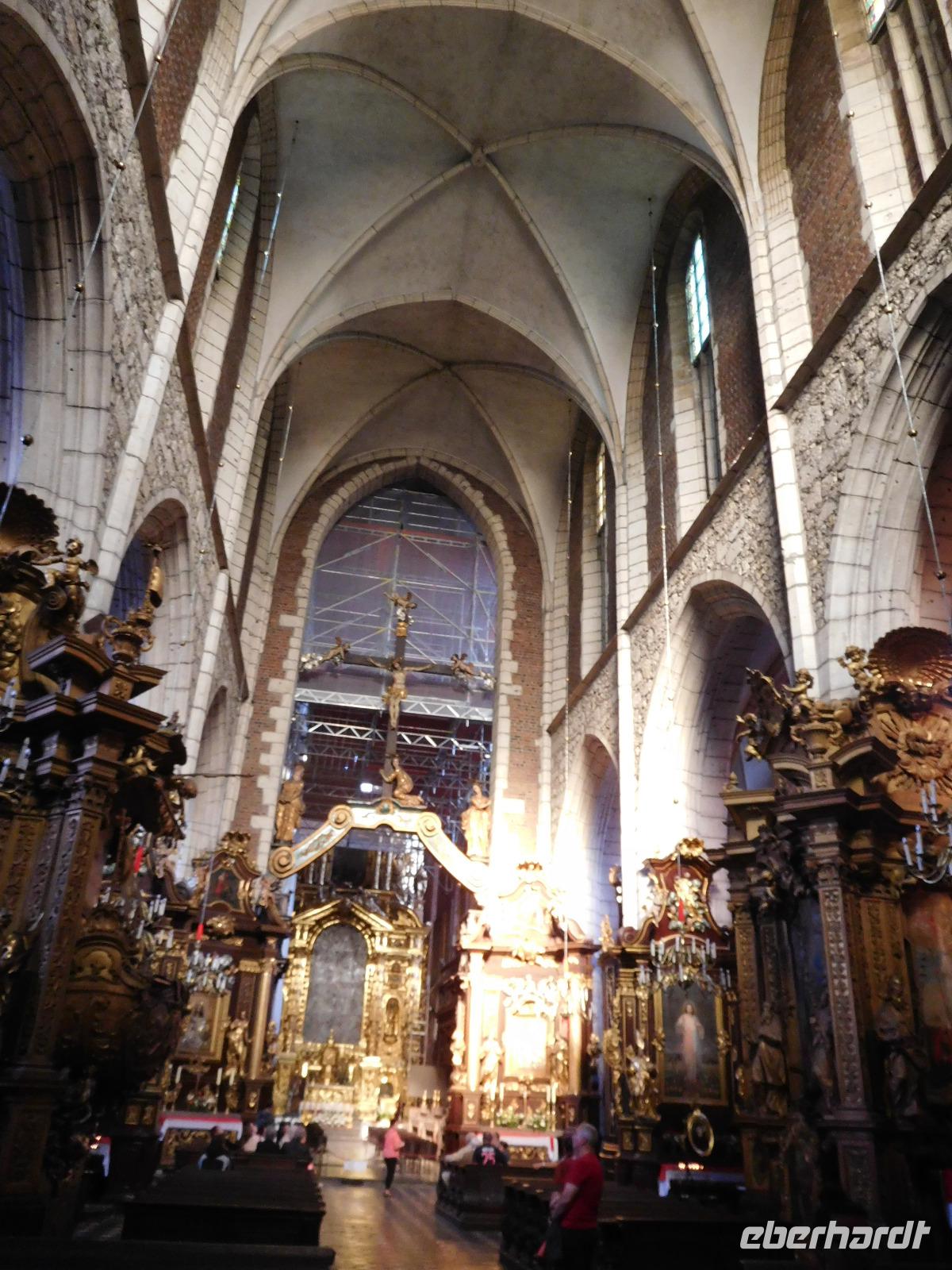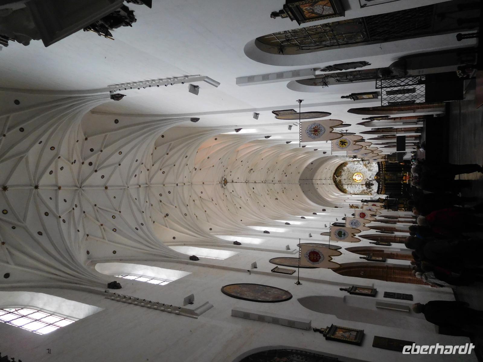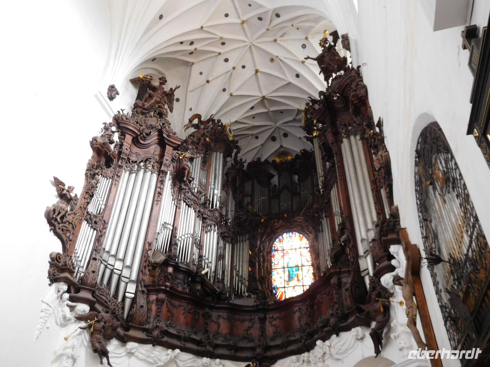 Pünktlich um neun holte uns eine Danziger Frau Anna im Hotel zur Stadtführung ab und los ging es mit unserem Bus zum Zisterzienserkloster Oliva. Wir passierten dabei die ehemalige Leninwerft mit dem Denkmal des Arbeiteraufstandes der Gewerkschaft Solidarität. Hier erzählte uns Frau Anna, dass die gegenwärtige polnische Regierung gerade die Geschichtsbücher ändern und die Rolle von Lech Walesa tilgen lässt. Nach neuer Lesart haben allein die Zwillingsbrüder Kaczynski den Aufstand organisiert und die politische Wende in Polen herbei geführt. Leider fehlen Fotos, aber mit moderner Technik wird man schon geeignete finden. Danach fuhren wir am Bernsteinstadion vorbei, das für die Fußball-WM 2012 gebaut worden war und anschließend kam mit dem Stadtteil Langfuhr die Lebenswelt des Günter Grass in unseren Blick. In Saspe ist aus einem kleinen Fischerdorf ein riesiges Neubaugebiet geworden und in Oliva schien die Zeit stehen geblieben zu sein. 1186 hatten die Zisterzienser mit der Anlage ihres Klosters begonnen. Acht Dörfer hatte der pommersche Herrscher ihnen geschenkt, um zivilisatorisches Know how ins Land zu holen und um eine standesgemäße Grablege für sein Geschlecht zu stiften. Beide Pläne gingen auf. Die Mönche bauten am Olivabach Teiche und Mühlen, in denen sie auch Hämmer betrieben. Nach der Reformation, die in Danzig schon 1518 griff, wurde ihre Kirche von den Katholiken als Hauptkirche genutzt, ab 1925 war sie Sitz des neu gegründeten Bistums Danzig. Die alte Ausstattung wurde fast komplett zu Beginn des 17. Jahrhunderts von den Schweden geraubt oder vernichtet, die ziemlich einheitliche Barockausstattung entstand nach dem Frieden von Oliva ab 1688. Nur der an den Petersdom angelehnte Hochaltar von 1606 hat diese Raubzüge überdauert. Prunkstück der Kathedrale ist die Orgel, die eigentlich aus drei Instrumenten besteht, die von einem Tisch aus gespielt werden können. Sie 1763-88 von Johann Wulf aus Wormditt gebaut und besitzt 7876 Pfeifen Üppige Schnitzereien und diverse mechanische Teile lassen das Spiel auch optisch abwechslungsreich erscheinen. Wir konnten einem kleinen Konzert mit Stücken von Bach, Saint Saens und Tschaikowski, sowie technisch prägnanten Phantasien beiwohnen.