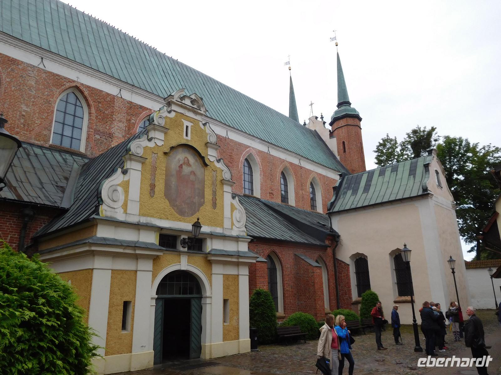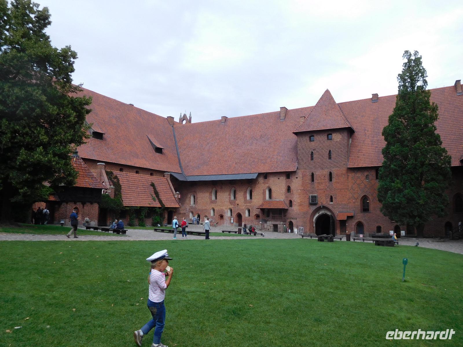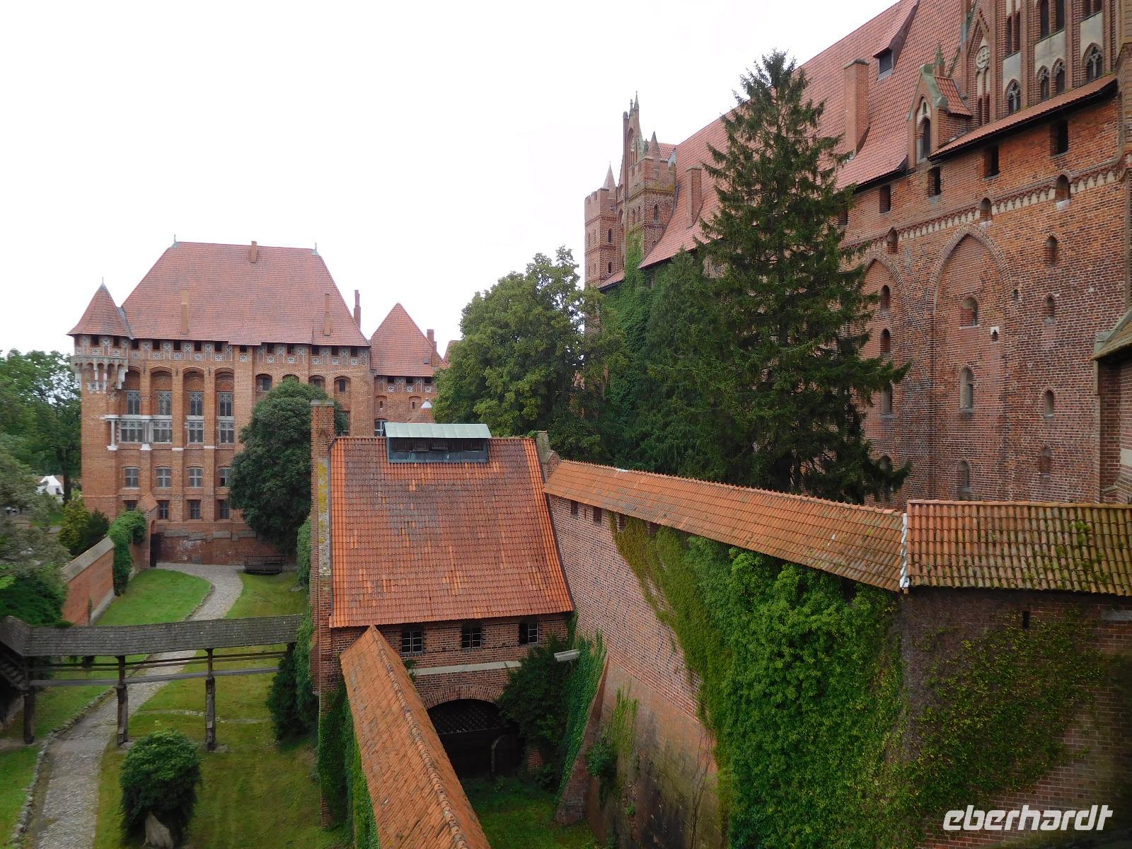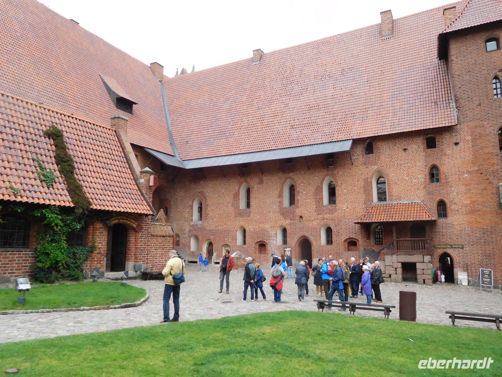 Von Thorn an der Südspitze des ehemaligen Deutschordenslandesfuhren wir weiter nach Norden vorbei an Burgen und Stadtgründungen des Ordens, zu denen der Reiseleiter seine Ausführungen machte. Wir passierten so, immer auf nagelneuer Autobahn parallel zur Weichsel fahrend Kulm, das neben Thorn als schönste mittelalterliche Stadt Polens gilt, dann die Festungsstadt Graudenz, deren mächtige Speicher wie ein Wall an der Weichsel stehen, dann Marienwerder mit der Domburg und dem größten Dansker, einer Riesentoilette über dem Fluß, zuletzt noch Gnewe mit der Ordensburg und Pelplin mit seiner weitestgehend original erhaltenen Zisterzienserkirche. Allein diese Historisch bedeutsame Strecke wäre mehr als eine Tagestour wert, aber uns zog es zur Marienburg, dem größten profanen Backsteinensemble überhaupt, in dem seit 1309 der Hochmeister des Deutschen Ordens residierte. Nachdem es morgens und auf der Fahrt teilweise recht kräftig geregnet hatte, verzogen sich in Marienburg die Wolken und der Himmel riss auf, so dass unsere Führung trocken vonstatten gehen konnte. Hier hatten wir mit der Deutschlehrerin Frau Anna eine sehr kompetente Führerin, die uns zunächst durch die Vorburg in den Innenhof und dann durch Rempter, Hochmeisterpalast, Schatzkammer und Küchentrakt in die erst letzten Winter komplett eingewölbte Kirche führte, in der neben diversen Wandmalereien und gotischen Figuren gleich zwei noch spätromanische Portale mit überreichem Figurenschmuck erhalten sind. Bei den klugen und törichten Jungfrauen denkt man unwillkürlich an Bamberg oder Naumburg. Selbst ein aussagekräftiges Stück Fußboden darf man betreten, allerdings mit Plexiglas zwischen Kacheln und Schuhen. Seit kurzem zu bewundern ist ein spätgotischer Altar mit einer Marienkrönung und einem Stifterwappen aus der Markgrafschaft Meißen, schließlich war der zeitgenössische Hochmeister ein Wettiner.