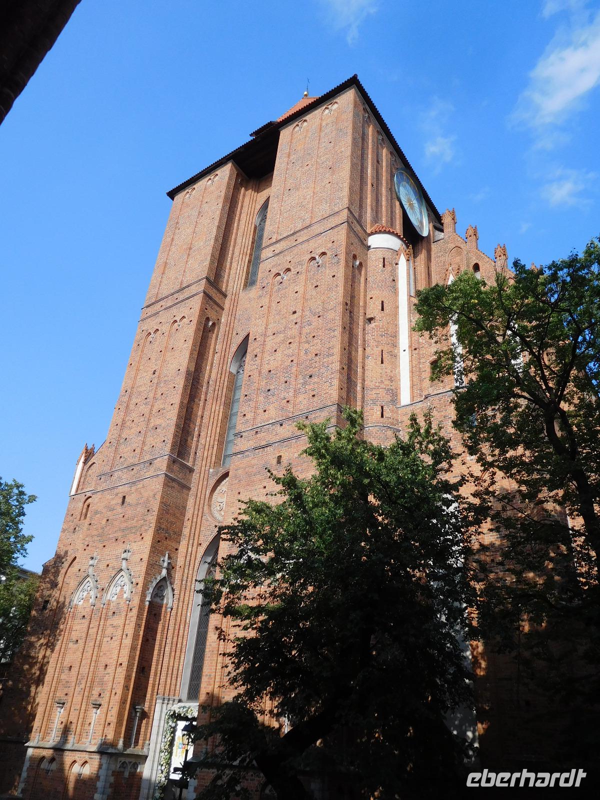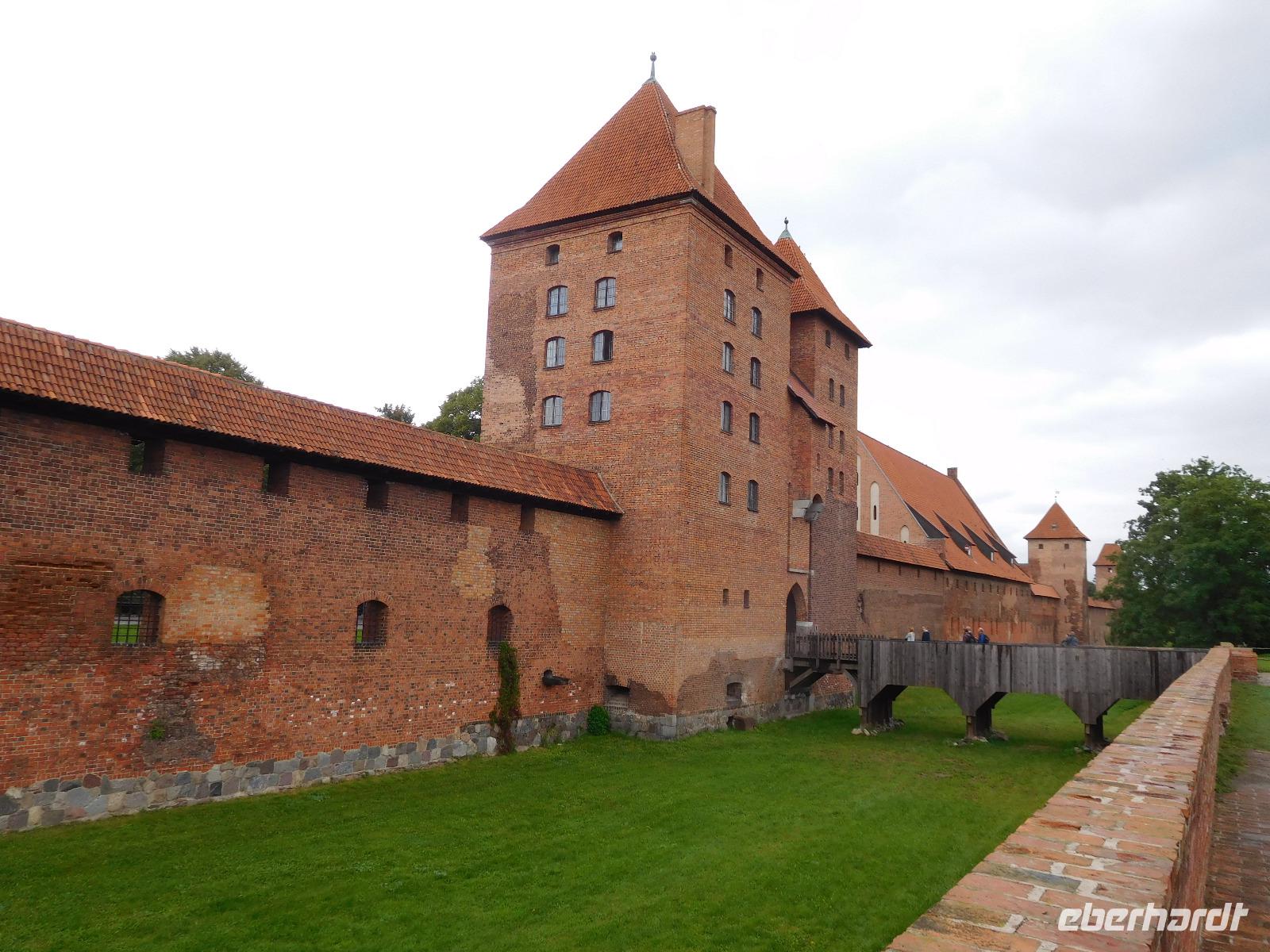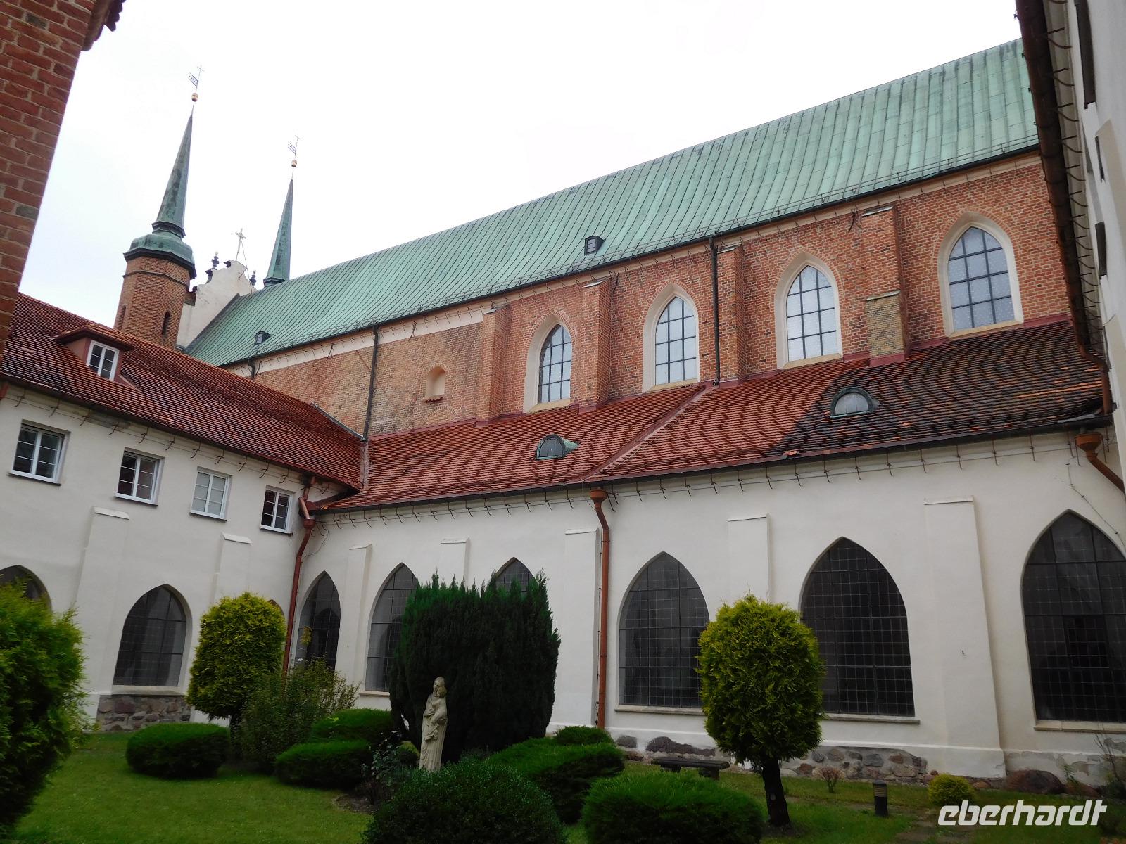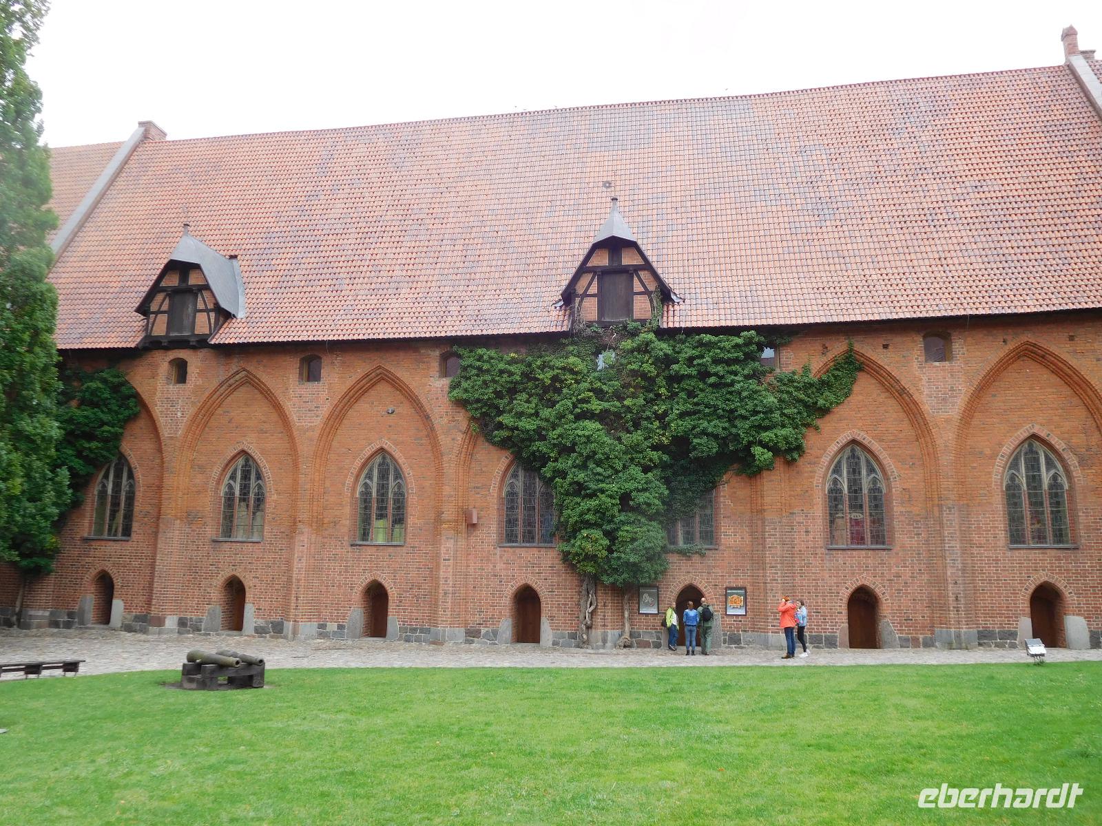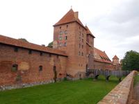 Von Thorn an der Südspitze des ehemaligen Deutschordenslandesfuhren wir weiter nach Norden vorbei an Burgen und Stadtgründungen des Ordens, zu denen der Reiseleiter seine Ausführungen machte. Wir passierten so, immer auf nagelneuer Autobahn parallel zur Weichsel fahrend Kulm, das neben Thorn als schönste mittelalterliche Stadt Polens gilt, dann die Festungsstadt Graudenz, deren mächtige Speicher wie ein Wall an der Weichsel stehen, dann Marienwerder mit der Domburg und dem größten Dansker, einer Riesentoilette über dem Fluß, zuletzt noch Gnewe mit der Ordensburg und Pelplin mit seiner weitestgehend original erhaltenen Zisterzienserkirche. Allein diese Historisch bedeutsame Strecke wäre mehr als eine Tagestour wert, aber uns zog es zur Marienburg, dem größten profanen Backsteinensemble überhaupt, in dem seit 1309 der Hochmeister des Deutschen Ordens residierte. Nachdem es morgens und auf der Fahrt teilweise recht kräftig geregnet hatte, verzogen sich in Marienburg die Wolken und der Himmel riss auf, so dass unsere Führung trocken vonstatten gehen konnte. Hier hatten wir mit der Deutschlehrerin Frau Anna eine sehr kompetente Führerin, die uns zunächst durch die Vorburg in den Innenhof und dann durch Rempter, Hochmeisterpalast, Schatzkammer und Küchentrakt in die erst letzten Winter komplett eingewölbte Kirche führte, in der neben diversen Wandmalereien und gotischen Figuren gleich zwei noch spätromanische Portale mit überreichem Figurenschmuck erhalten sind. Bei den klugen und törichten Jungfrauen denkt man unwillkürlich an Bamberg oder Naumburg. Selbst ein aussagekräftiges Stück Fußboden darf man betreten, allerdings mit Plexiglas zwischen Kacheln und Schuhen. Seit kurzem zu bewundern ist ein spätgotischer Altar mit einer Marienkrönung und einem Stifterwappen aus der Markgrafschaft Meißen, schließlich war der zeitgenössische Hochmeister ein Wettiner.