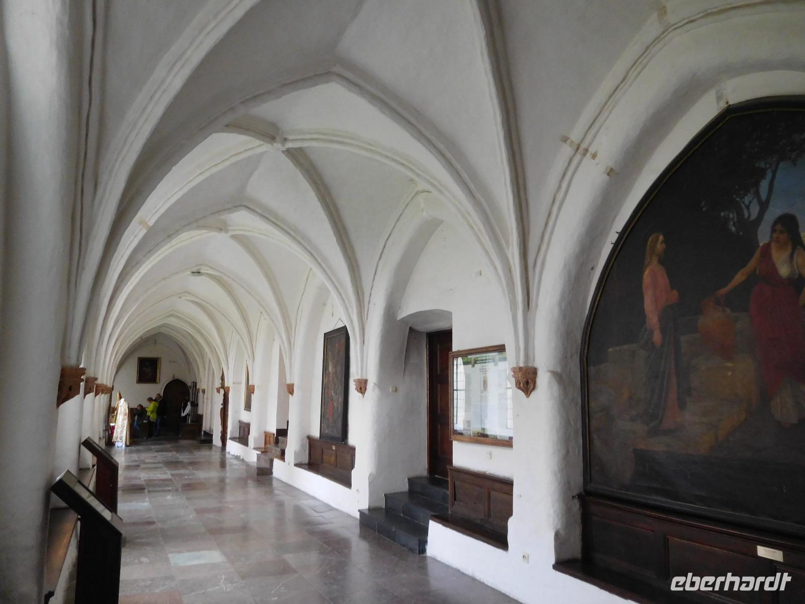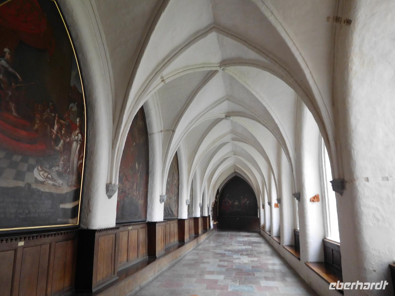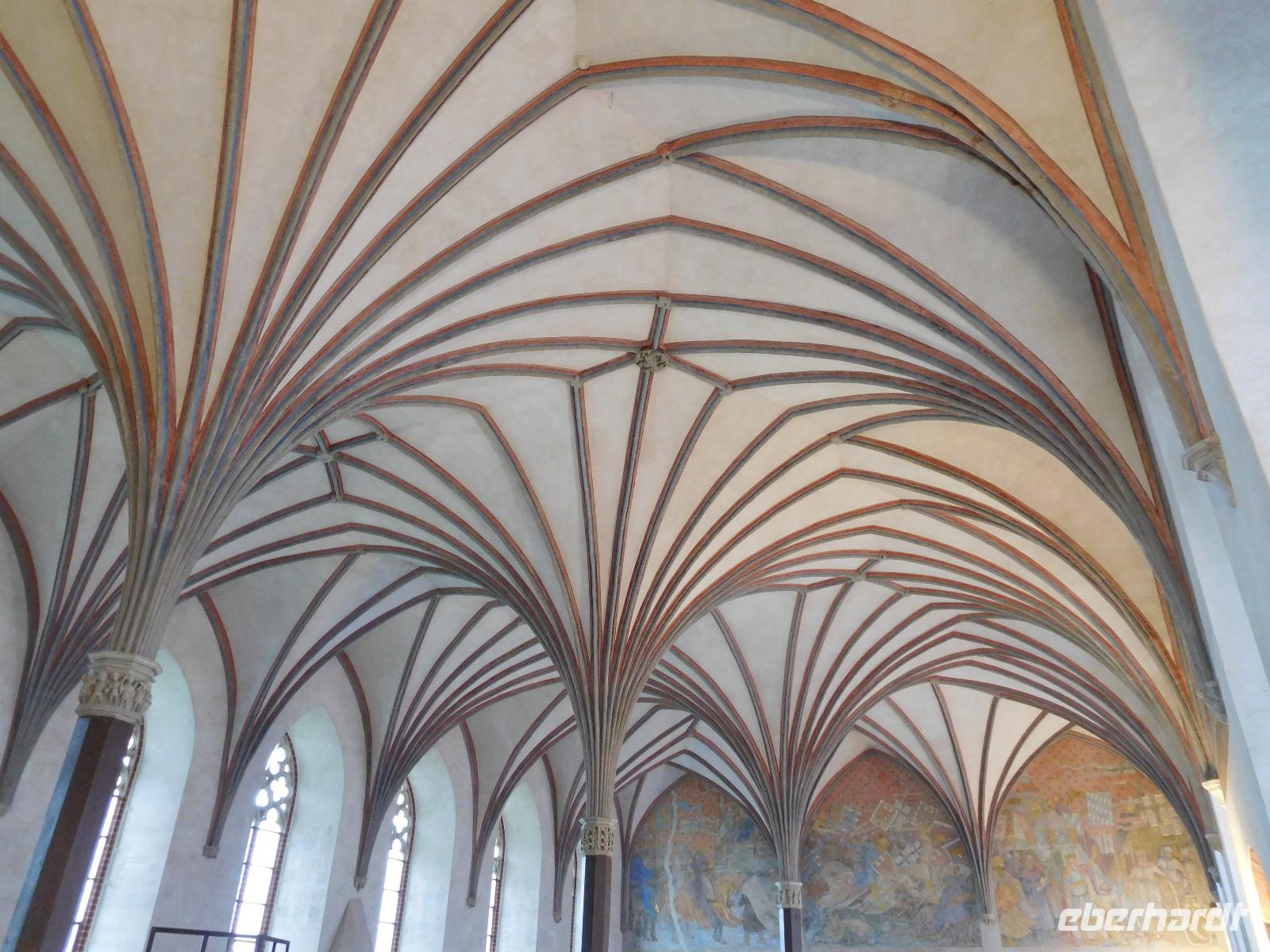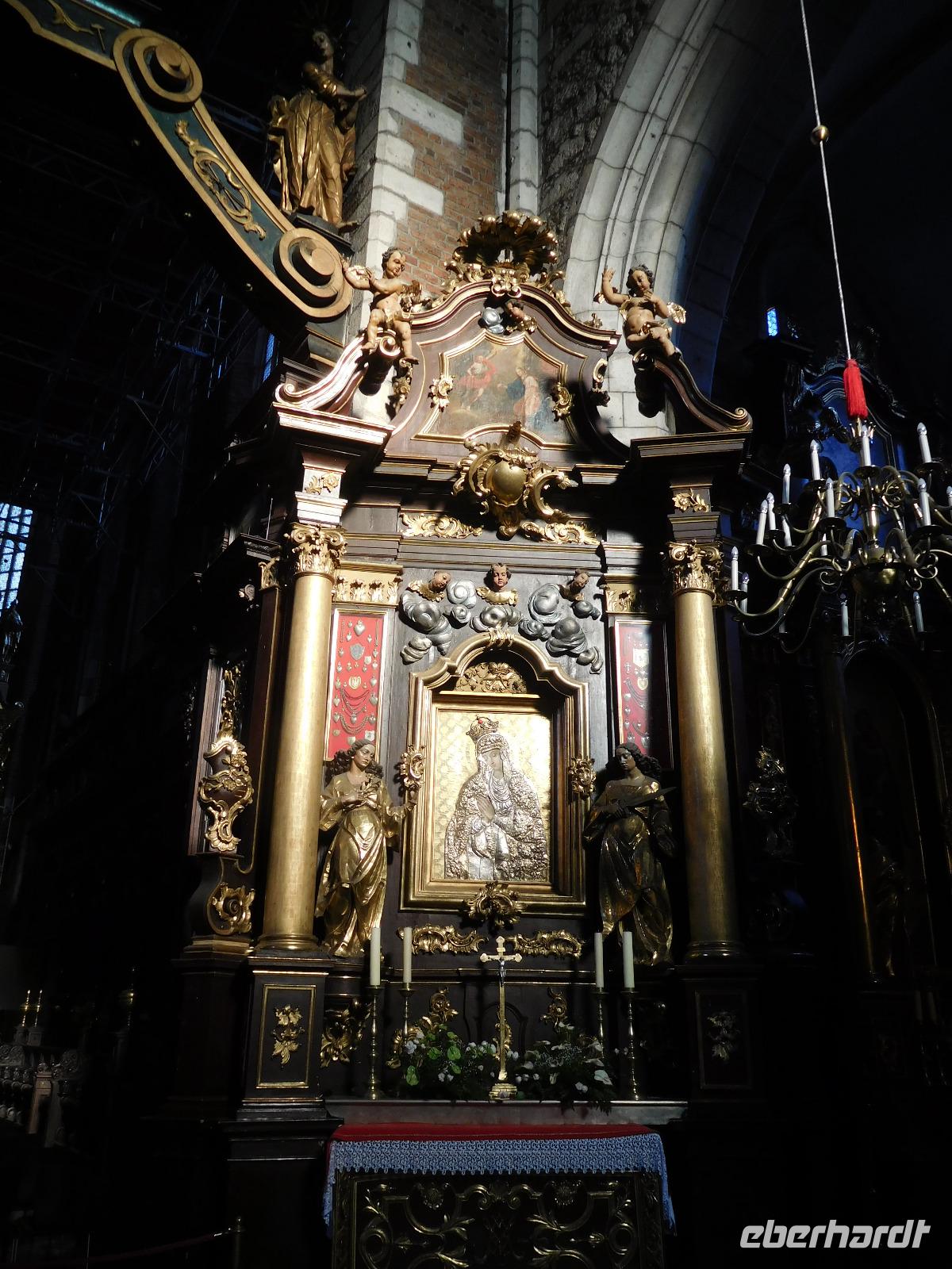 Von Thorn an der Südspitze des ehemaligen Deutschordenslandesfuhren wir weiter nach Norden vorbei an Burgen und Stadtgründungen des Ordens, zu denen der Reiseleiter seine Ausführungen machte. Wir passierten so, immer auf nagelneuer Autobahn parallel zur Weichsel fahrend Kulm, das neben Thorn als schönste mittelalterliche Stadt Polens gilt, dann die Festungsstadt Graudenz, deren mächtige Speicher wie ein Wall an der Weichsel stehen, dann Marienwerder mit der Domburg und dem größten Dansker, einer Riesentoilette über dem Fluß, zuletzt noch Gnewe mit der Ordensburg und Pelplin mit seiner weitestgehend original erhaltenen Zisterzienserkirche. Allein diese Historisch bedeutsame Strecke wäre mehr als eine Tagestour wert, aber uns zog es zur Marienburg, dem größten profanen Backsteinensemble überhaupt, in dem seit 1309 der Hochmeister des Deutschen Ordens residierte. Nachdem es morgens und auf der Fahrt teilweise recht kräftig geregnet hatte, verzogen sich in Marienburg die Wolken und der Himmel riss auf, so dass unsere Führung trocken vonstatten gehen konnte. Hier hatten wir mit der Deutschlehrerin Frau Anna eine sehr kompetente Führerin, die uns zunächst durch die Vorburg in den Innenhof und dann durch Rempter, Hochmeisterpalast, Schatzkammer und Küchentrakt in die erst letzten Winter komplett eingewölbte Kirche führte, in der neben diversen Wandmalereien und gotischen Figuren gleich zwei noch spätromanische Portale mit überreichem Figurenschmuck erhalten sind. Bei den klugen und törichten Jungfrauen denkt man unwillkürlich an Bamberg oder Naumburg. Selbst ein aussagekräftiges Stück Fußboden darf man betreten, allerdings mit Plexiglas zwischen Kacheln und Schuhen. Seit kurzem zu bewundern ist ein spätgotischer Altar mit einer Marienkrönung und einem Stifterwappen aus der Markgrafschaft Meißen, schließlich war der zeitgenössische Hochmeister ein Wettiner.