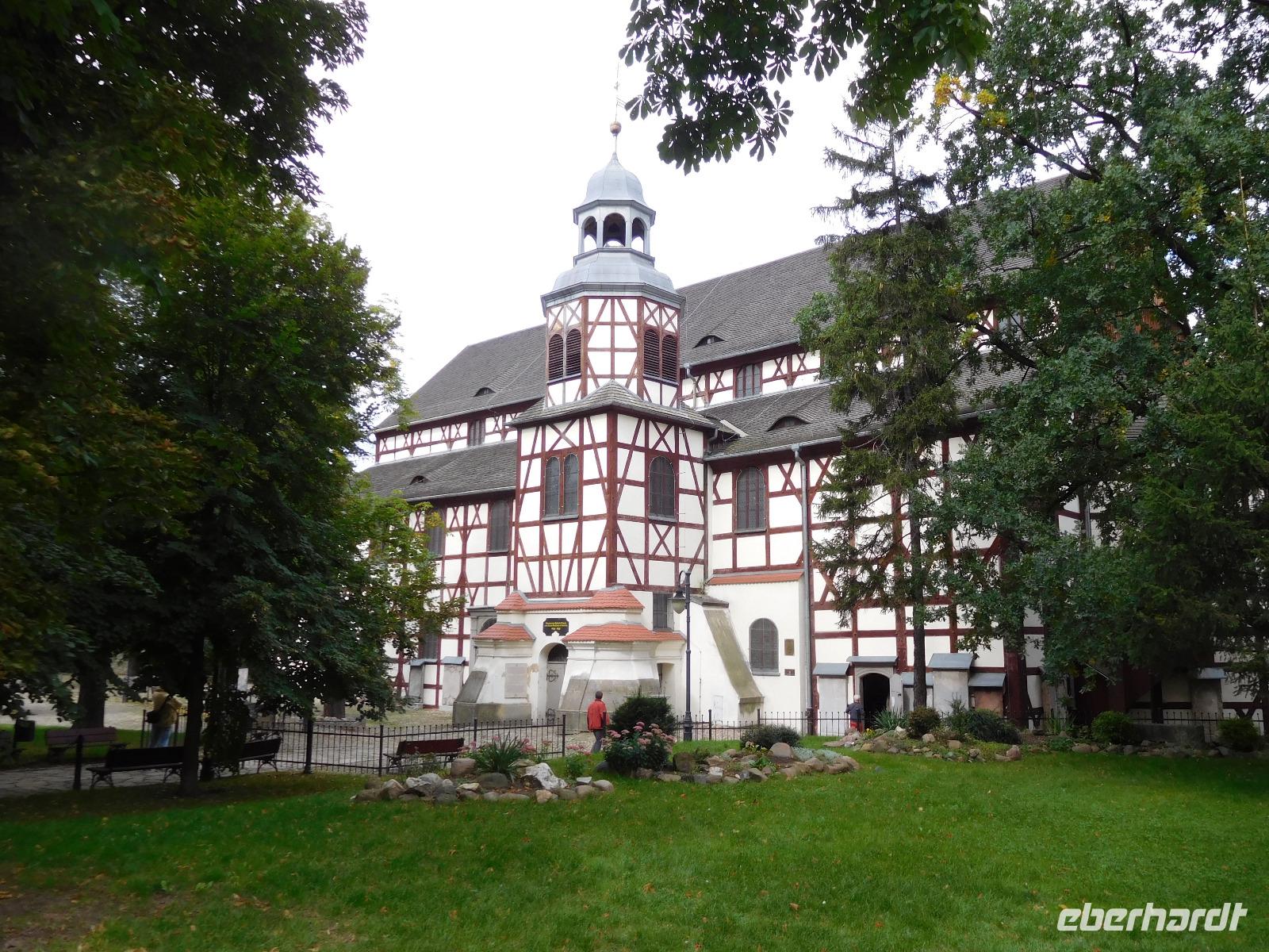 Letzter Programmpunkt war die Besichtigung der Friedenskirche in Jawor/ Jauer. Weil unser Reiseleiter aktiv im evangelischen Gustav-Adolf-Verein arbeitet, der sich um protestantische Kirchen in der Diaspora kümmert, konnte er viele Informationen zu diesem Bauprojekt anbringen. Die Kirche wurde nach dem Ende des dreißigjährigen Krieges ab 1654 als monumentaler Fachwerkbau für die zumeist evangelischen deutschstämmigen Schlesier errichtet. Zu den Beschlüssen des Westfälischen Friedens im Jahr 1648 gehörte die Erlaubnis für die schlesischen Protestanten, drei Friedenskirchen in Glogau, Jauer und Schweidnitz zu bauen. Allerdings musste eine Reihe von Bedingungen erfüllt werden. Steine und Ziegel waren als Baumaterial verboten, nur Holz, Lehm und Stroh durften verwendet werden. Die Kirchen mit Türmen oder Glocken zu versehen war ebenfalls nicht gestattet. Als Standorte kamen nur Plätze außerhalb der Stadtmauern einen Kanonenschuß entfernt davon in Frage und die Gebäude mussten innerhalb eines Jahres fertig gestellt werden. Die Baukosten hatten die Gemeinden zu tragen. Die Kirche in Jauer wurde in den Jahren 1654-55 nach einem Entwurf des Breslauer Architekten Albrecht von Saebisch für etwa 5500 Besucher erbaut. Weil an Sonn- und Feiertagen aber oft bis zu 15.000 Besucher kamen, mussten trotzdem mehrere Gottesdienste nacheinander abgehalten werden.Der Glockenturm wurde erst 1709 angebaut, nachdem der Kaiser dies nach der Altranstädter Konvention von 1706 gestatteten mußte.