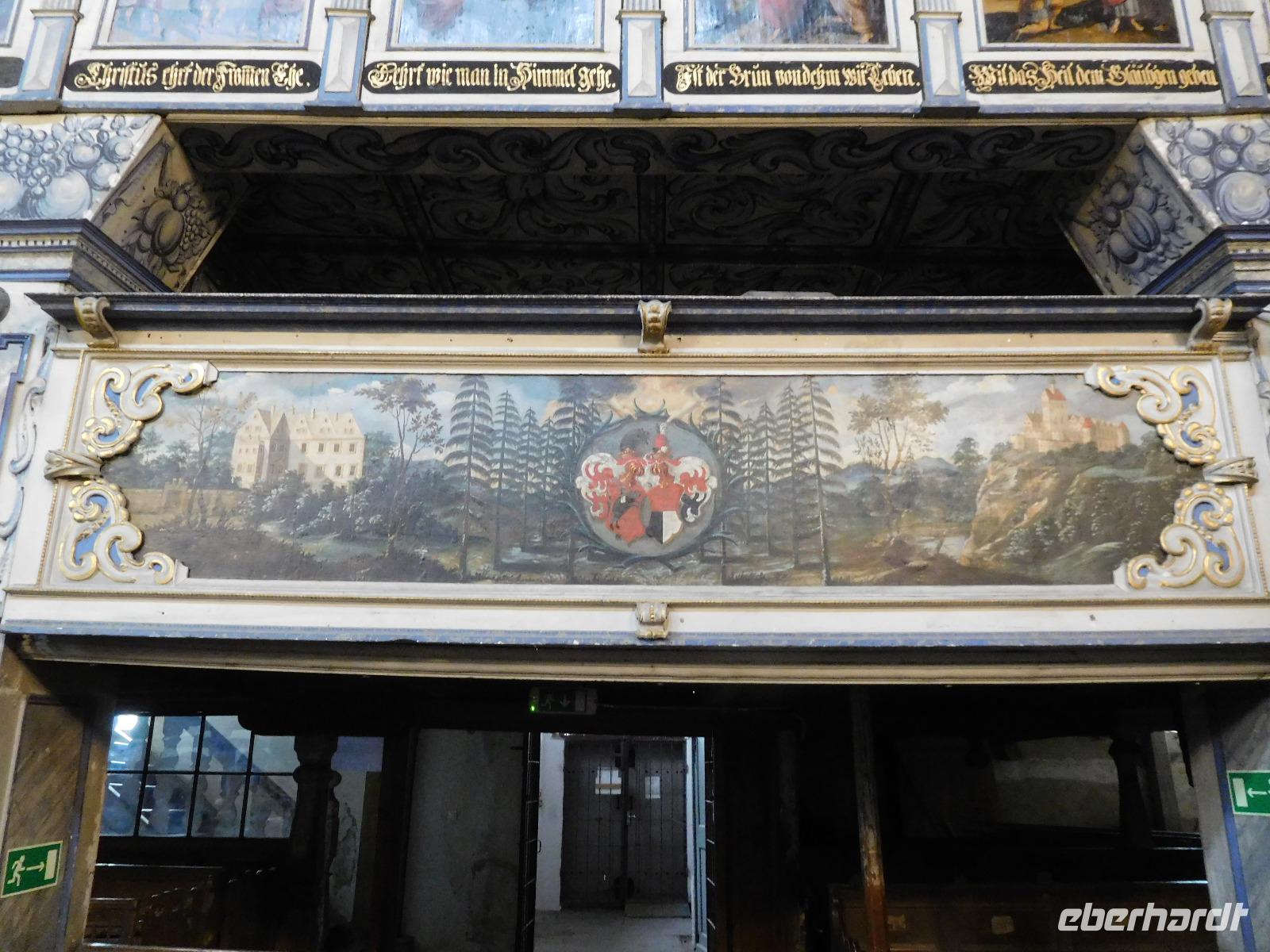 An der zweiten Empore sind 66 Szenen aus dem Neuen Testament dargestellt, an der vierten sind es 71 aus dem Alten Testament. Als direkte Vorlage benutzte der Maler eine Sammlung von 258 Kupferstichen von Matthäus Merian dem Älteren, die 1628 unter dem Titel „Biblische Abbildungen zur Darstellung der wichtigsten Geschichten der Heiligen Schrift" erschienen war.