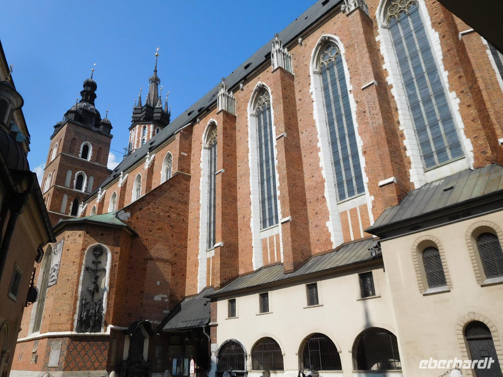 Nicht weit ist es bis zum Markt mit den berühmten Tuchhallen aus dem 14. Jahrhundert, in deren Gewölben Kunst und Kitsch verkauft werden. Vom Turm des 1820 abgerissenen gotischen Rathauses hat man einen schönen Blick über Altstadt und Wawel. Punkt zwölf erklingt von einem Turm der Marienkirche das abrupt endende Trompetensignal, der Hejnal, das täglich im Radio übertragen wird. In der Kirche konnten wir der Öffnungszeremonie des berühmten Marienaltars von Veit Stoß beiwohnen, die eine Nonne vollzieht. Dieser größte mittelalterliche Schnitzaltar, dessen fast 200 Figuren Ende des 15.Jahrhunderts entstanden, stellt alles andere in den Schatten und zeigt erschütternd realistisch die menschliche Agonie.