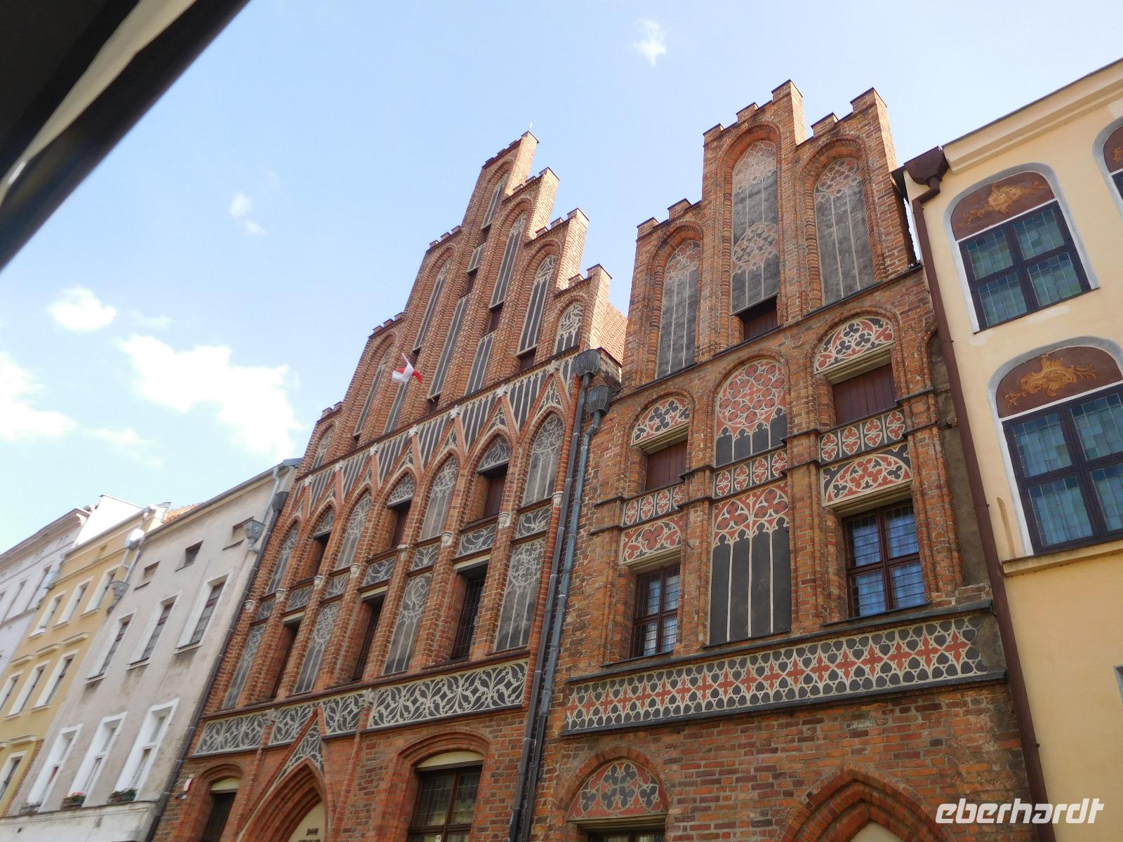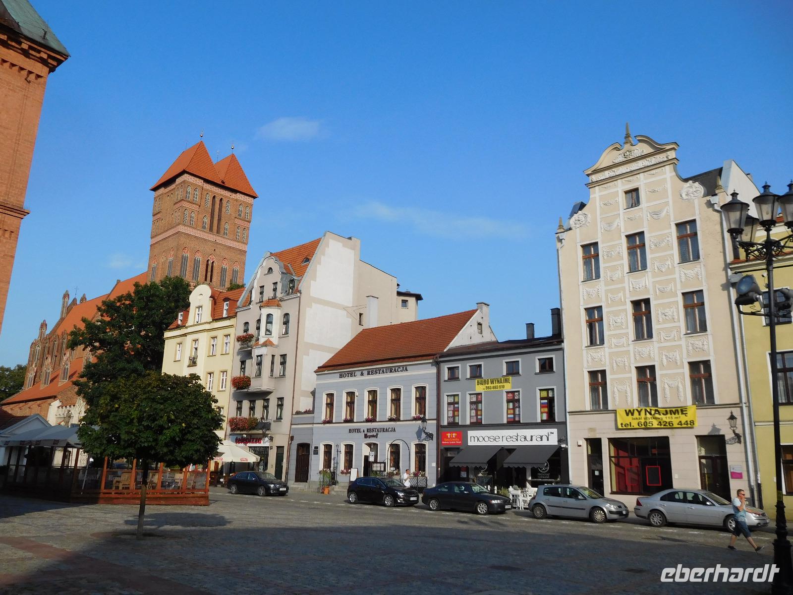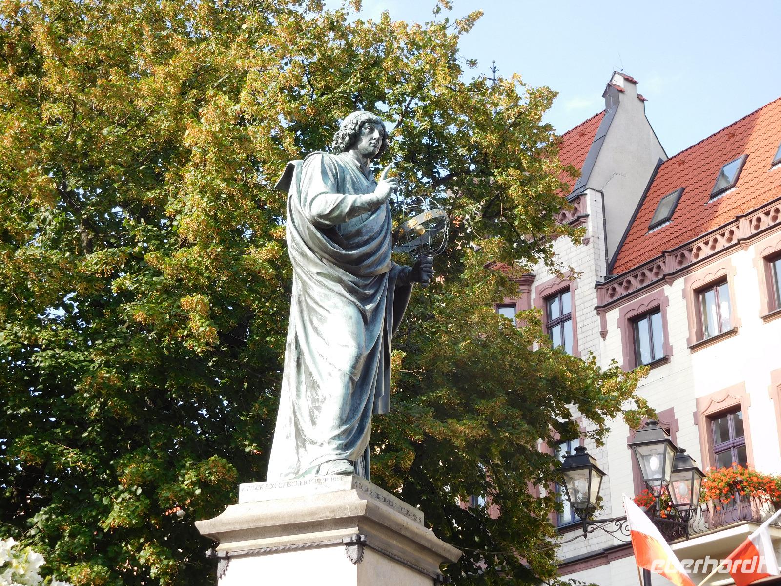 Um drei Uhr nachmittags bei schönstem Sonnenschein dann Ankunft beim Hotel in Thorn, das in gepflegten Parkanlagen unweit der Altstadt liegt. Wir konnten sofort die Zimmer beziehen und nachdem sich alle erfrischt hatten, zeigte uns Herr Christoph die Altstadt. Sein konzeptionelles Gerüst waren zehn Fragen zur Thorner Geschichte, von denen neun richtig beantwortet werden konnten. Die Führung begann mit einer Verkostung der berühmten Thorner Lebkuchen, die Katharinchen genannt werden. Dann ging es vorbei an einem Springbrunnen, der nachts zu Musik illuminiert wird, zur wahrhaft imposanten Mauer der vom Deutschen Orden gegründeten Stadt samt schiefem Wehrturm und dazu gehöriger Lovestory. Dazu die Stehprobe an der schiefsten Stelle, die niemand bestehen konnte. Vorbei an den gotischen Geburtshäusern des Astronomen Nikolaus Kopernikus besuchten wir die gotische Johanniskirche mit ihrem schönen Sterngewölbe. Hier wurde Kopernikus getauft und neben dem Taufbecken ist noch viel von der alten Ausstattung erhalten. Nicht weit war es bis zum Markt mit dem gotischen Rathaus aus dem 14. Jahrhundert. Neben einem Denkmal für den größten Astronomen der Stadt vom Berliner Bildhauer Friedrich Tieck gibt es einen hübschen Brunnen mit wasserspeienden Fröschen und einem Geige spielenden Jungen. Die Sage dazu ähnelt der des Rattenfängers von Hameln, geht aber deutlich freundlicher aus. Hier verabschiedete sich Christoph, nicht ohne noch Werbung für seine Ferienwohnungen und für den Winzer an der Nahe zu machen, bei dem er jeden Winter die Reben beschneidet. Nachdem alle noch ein wenig Freizeit hatten, traf man sich im Hotel zum Abendbuffet und anschließend schlenderten viele noch in den warmen Sommerabend zum musikalischen Springbrunnen, an dem reges Treiben herrschte und weiter in die studentisch belebte Altstadt. Nach Mitternacht holte uns dann die Regenfront ein, denn schließlich war mittlerweile mit dem September der meteorologische Herbst angebrochen.