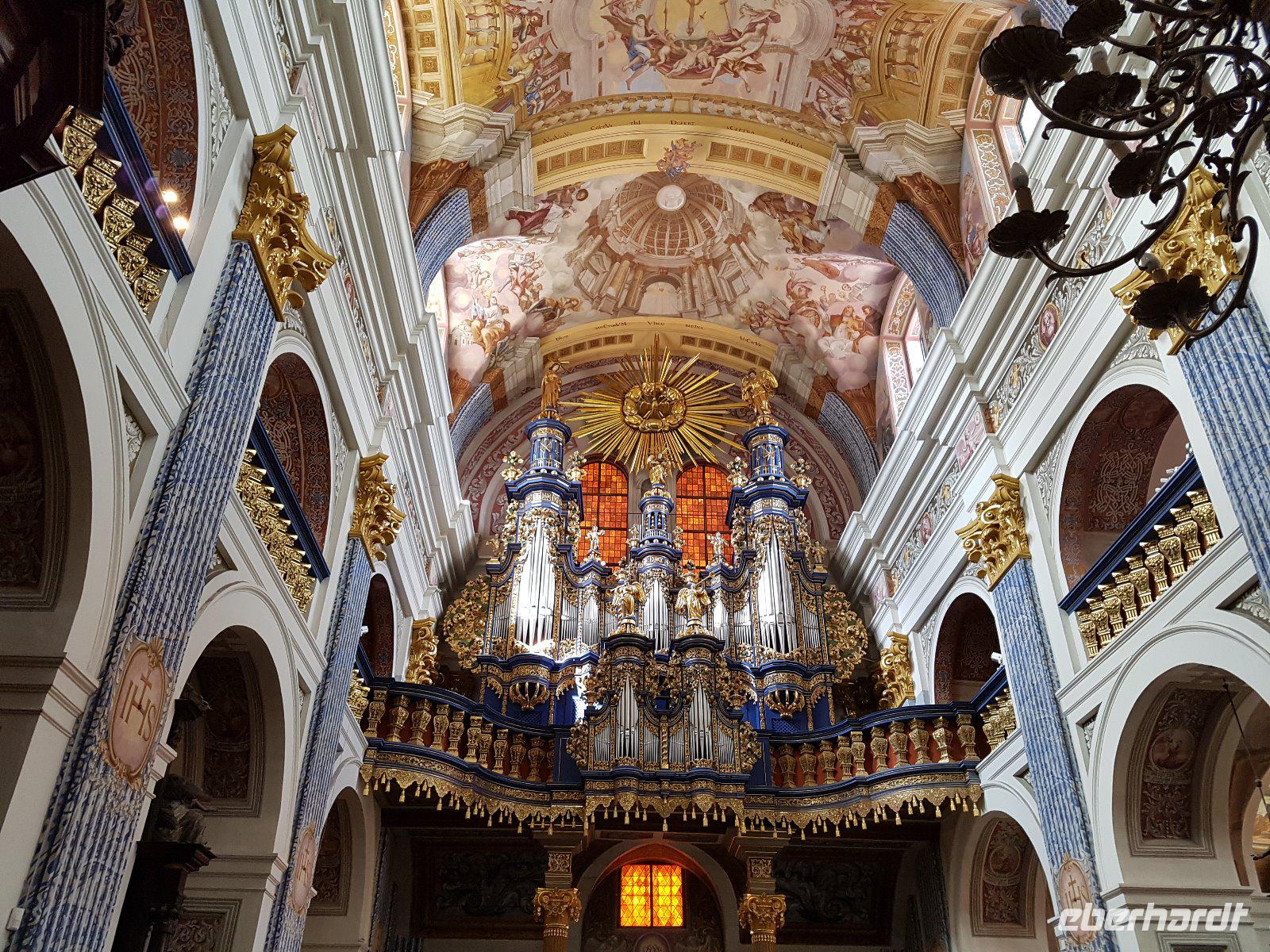 Heute erwartet uns eine örtliche Gästeführerin. In Heiligenlinde besichtigen wir die Barockirche. Das prächtige Innere dieser Wallfahrtskirche beeindruckt, Höhepunkt des Besuches ist allerdings die Orgelpräsentation. Nicht nur die akustische Kraft, sondern vor allem die beweglichen Figuren des riesigen Instrumentes lassen dies zu einem besonderen Ereignis werden.