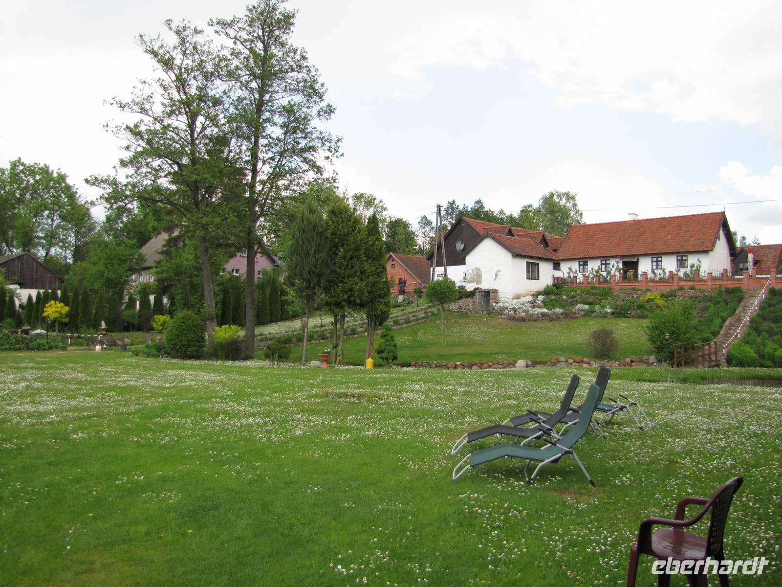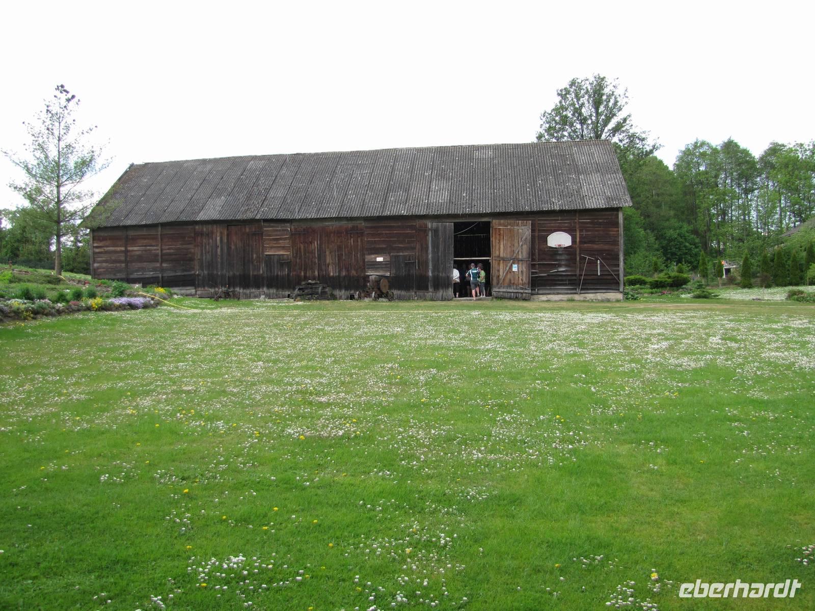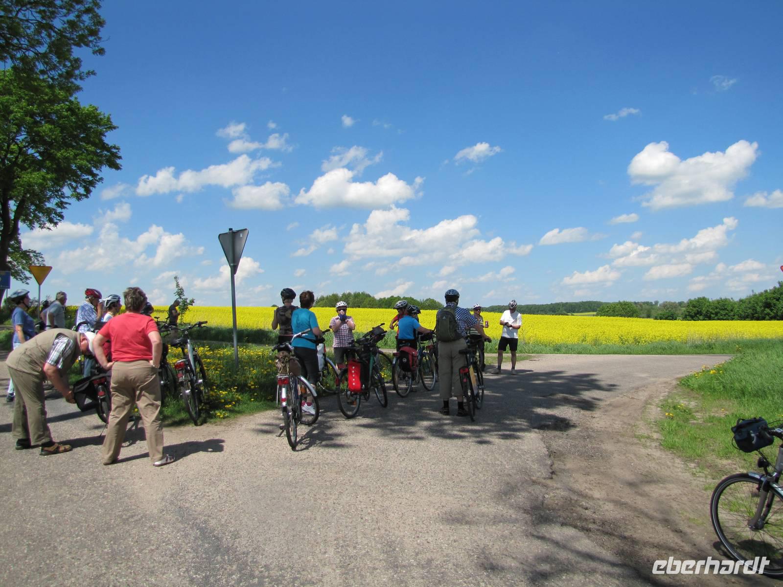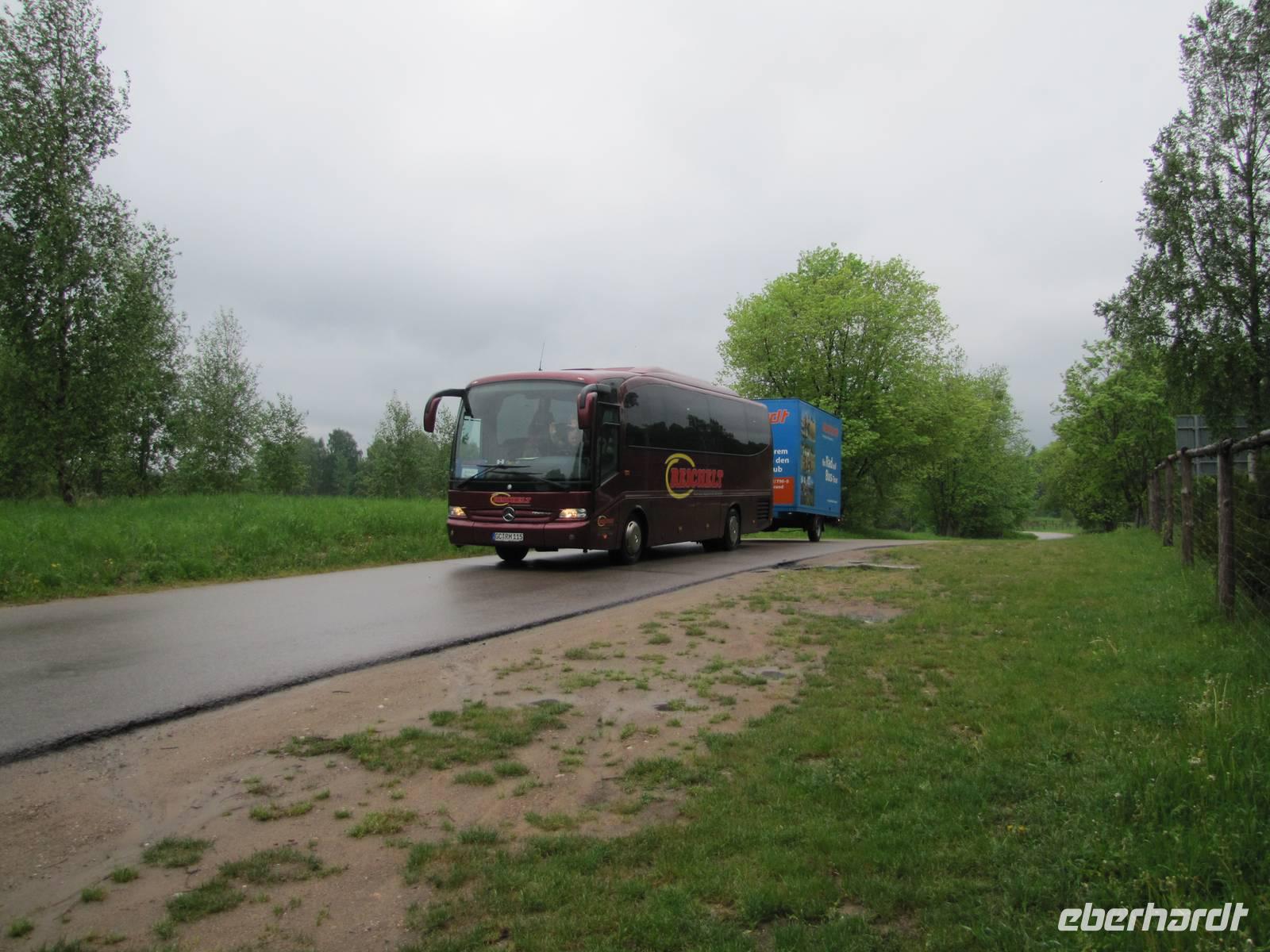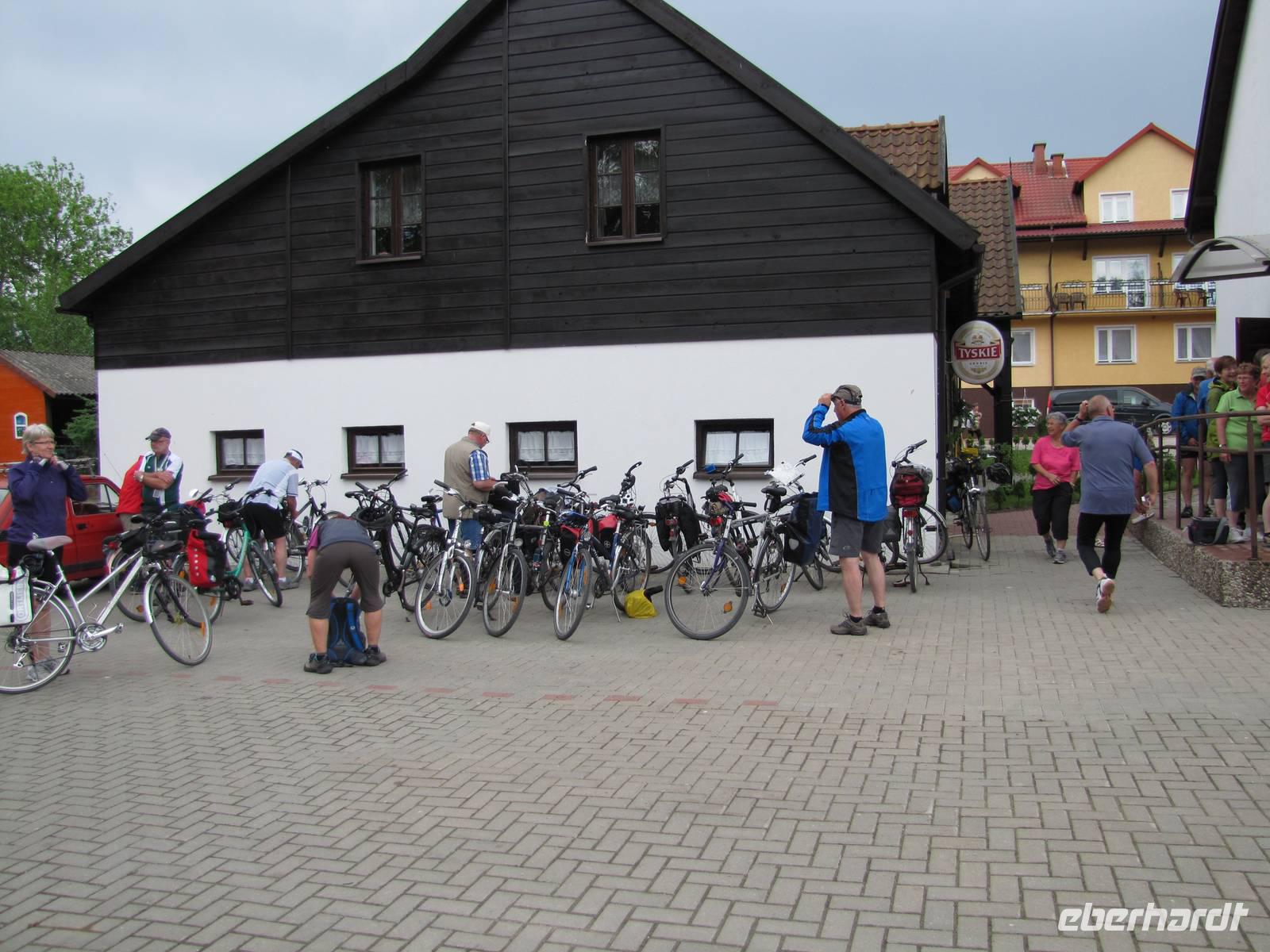 Heute hieß es Abschied nehmen von unserem schönen Hotel in Sensburg. Wir fuhren mit den Rädern vom Hotel aus, über Seehesten nach Zondern. Unterwegs meinte es das Wetter noch gut mit uns. Wieder ging es vorbei an blühenden Rapsfeldern und einsamen verträumten Ortschaften. In Zondern angekommen besichtigten wir ein Bauernmuseum und trafen eine waschechte Ostpreußin, auch Christel genannt. Sie erzählte alte Geschichten von früher auf Ihre eigene Art du Weiße. Es war ein großer Spaß! Als es dann nach dem Museumsrundgang auch noch ein Überraschungspicknick gab, sah man die Freude bei jedem im Gesicht geschrieben. Leckere Salate, Wurst, Käse, Obst wurde uns aufgetaffelt. Es war einfach klasse! Mit vollem Magen fuhren wir weiter in Richtung Nikolaiken. Kurz vor unserem Zielpunkt, dem Hotel Mazurski Dworek kam plötzlich ein heftiger Regenschauer. Zum Glück konnten wir uns auf einer Baustelle unterstellen und 3 Bauarbeitern etwas Gesellschaft leisten. Nach einer halben Stunde Dauerregen war wieder alles vorbei und wir konnten die letzten 2Kilometer zum Hotel weiter fahren. Im Hotel angekommen spritzten wir noch unsere Räder vom Dreck ab und freuten uns auf die heiße Dusche und das Abendessen. Unser Gepäck und Radanhänger wurde aufgrund der Buspanne mit einem Transporter transportiert.