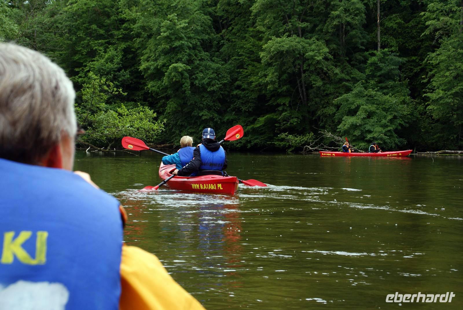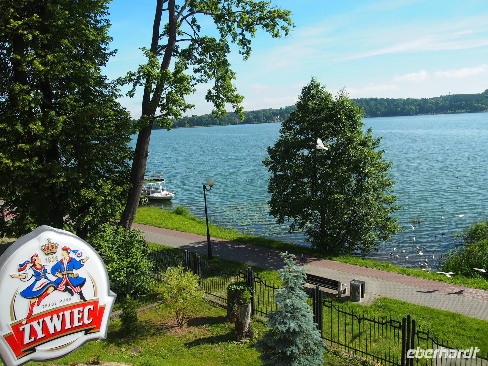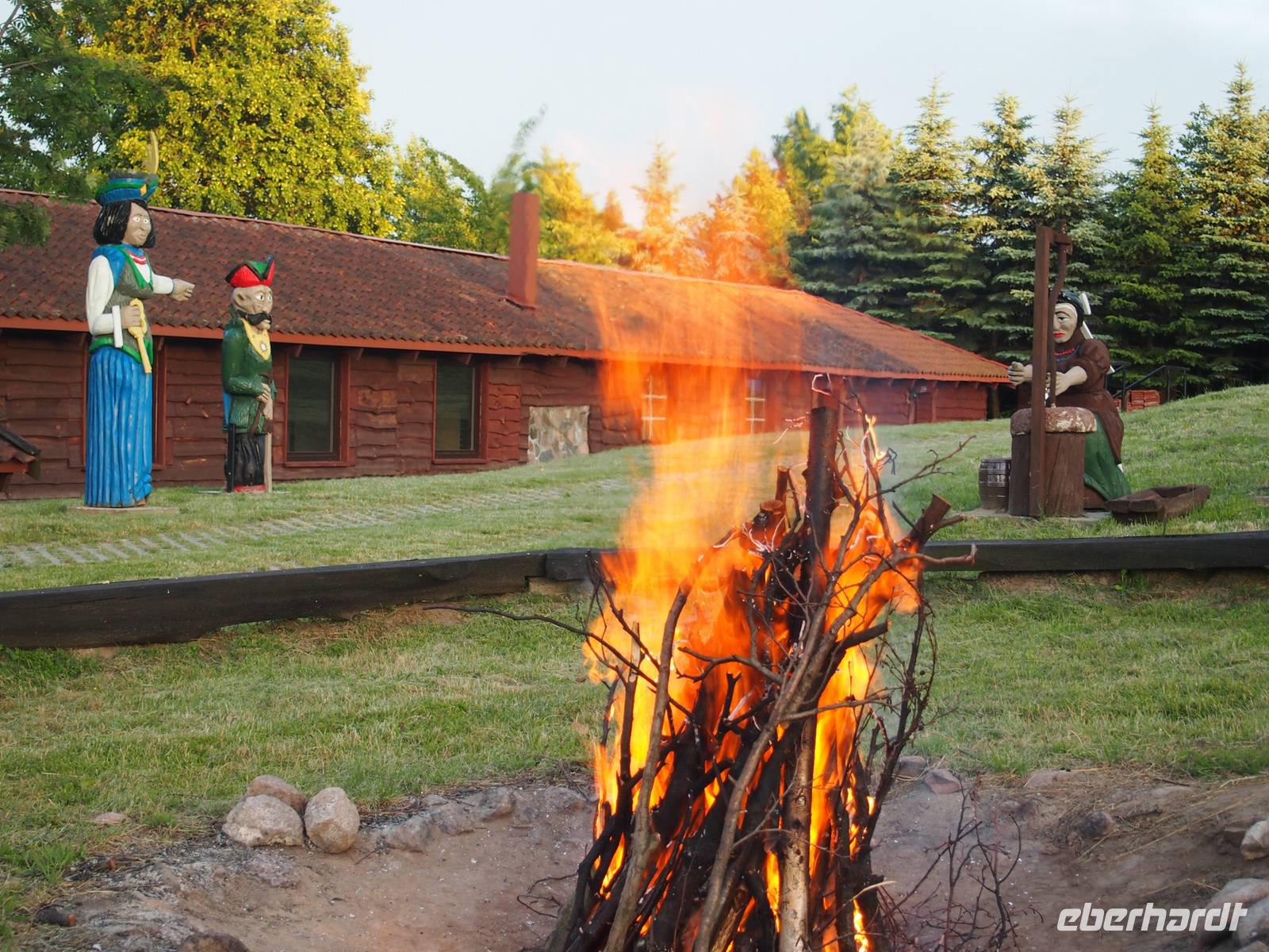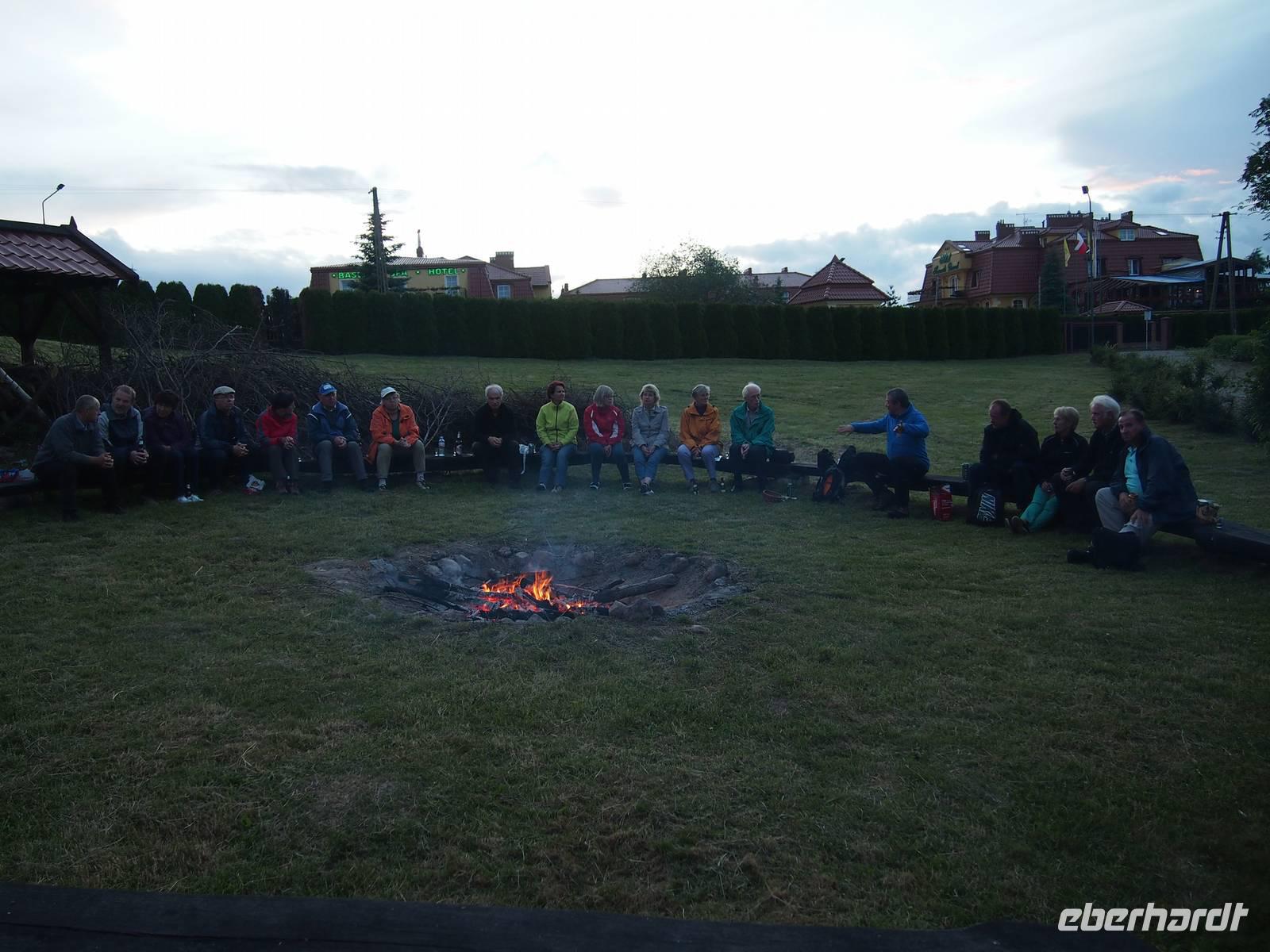Imposant waren vor allem die Ruhe und die Schönheit der Natur, die man hier mal aus einen anderen Blickwinkel genießen konnte. Wir sind vorbei an der einen oder anderen Schwanenfamilie und haben die Enten beobachtet, wie sie durch das Wasser schlitterten. Auf der Hälfte der Strecke mussten wir unser Boot umsetzen. Für die eine Bootsbesatzung war die Strecke wohl etwas zu kurz, übermotiviert fuhren sie weiter flussabwärts und wurden dann im nächsten Ort von uns gestoppt. Nach einem doch etwas länger als geplanten Ausflug ging es zurück zum Hotel, wo das Restaurant nach einer warmen Dusche schon mit dem Abendbrot auf uns wartete Den letzten Abend in den Masuren verbrachten wir gemütlich an einem Lagerfeuer am See. Wir kamen auch heute mal in den Genuss, den Bärenfänger „Krupnika" zu probieren. Der Abend am Lagerfeuer war nochmal ein schöner Abschluss von einer eindrucksvollen Radreise.