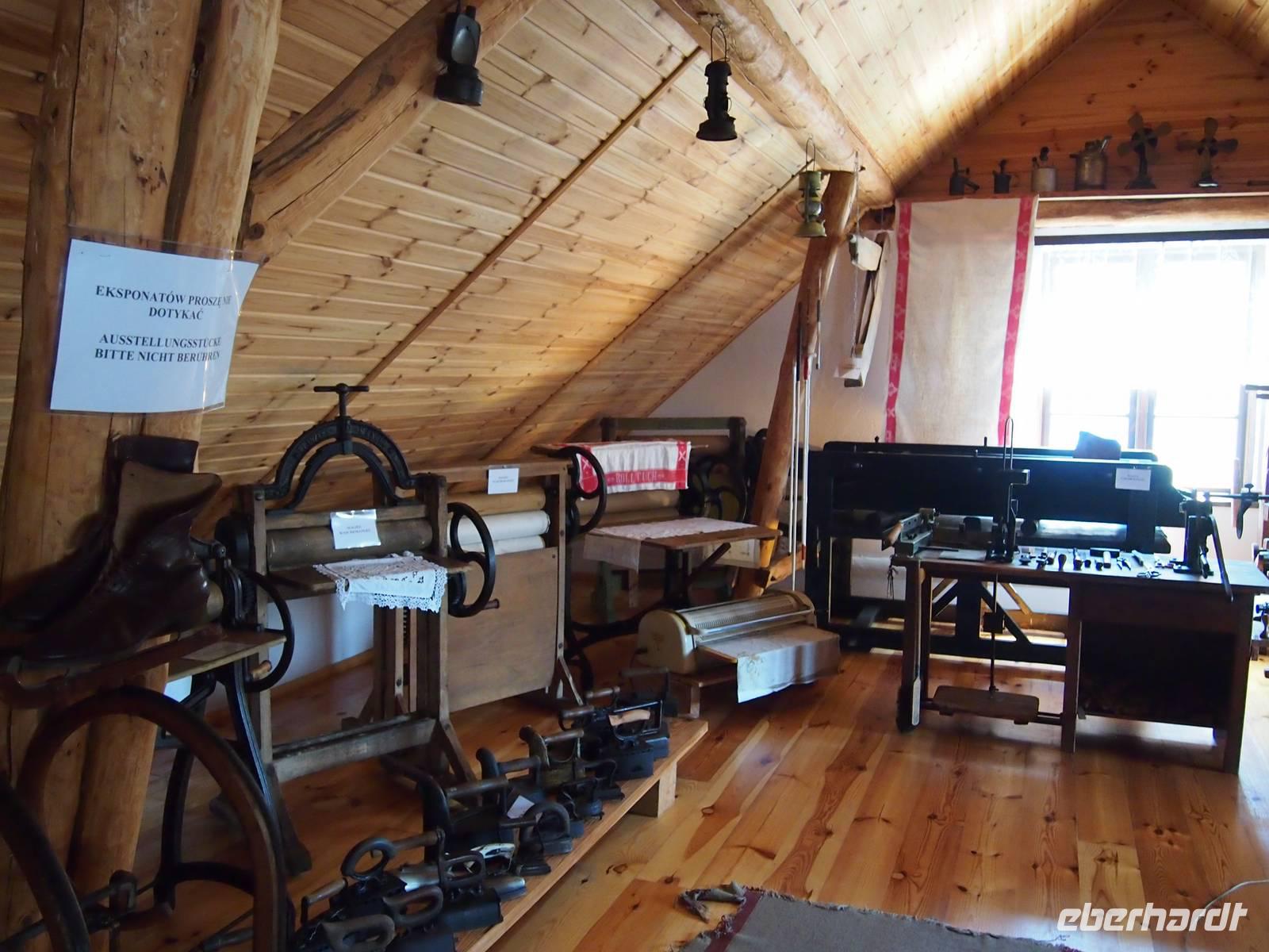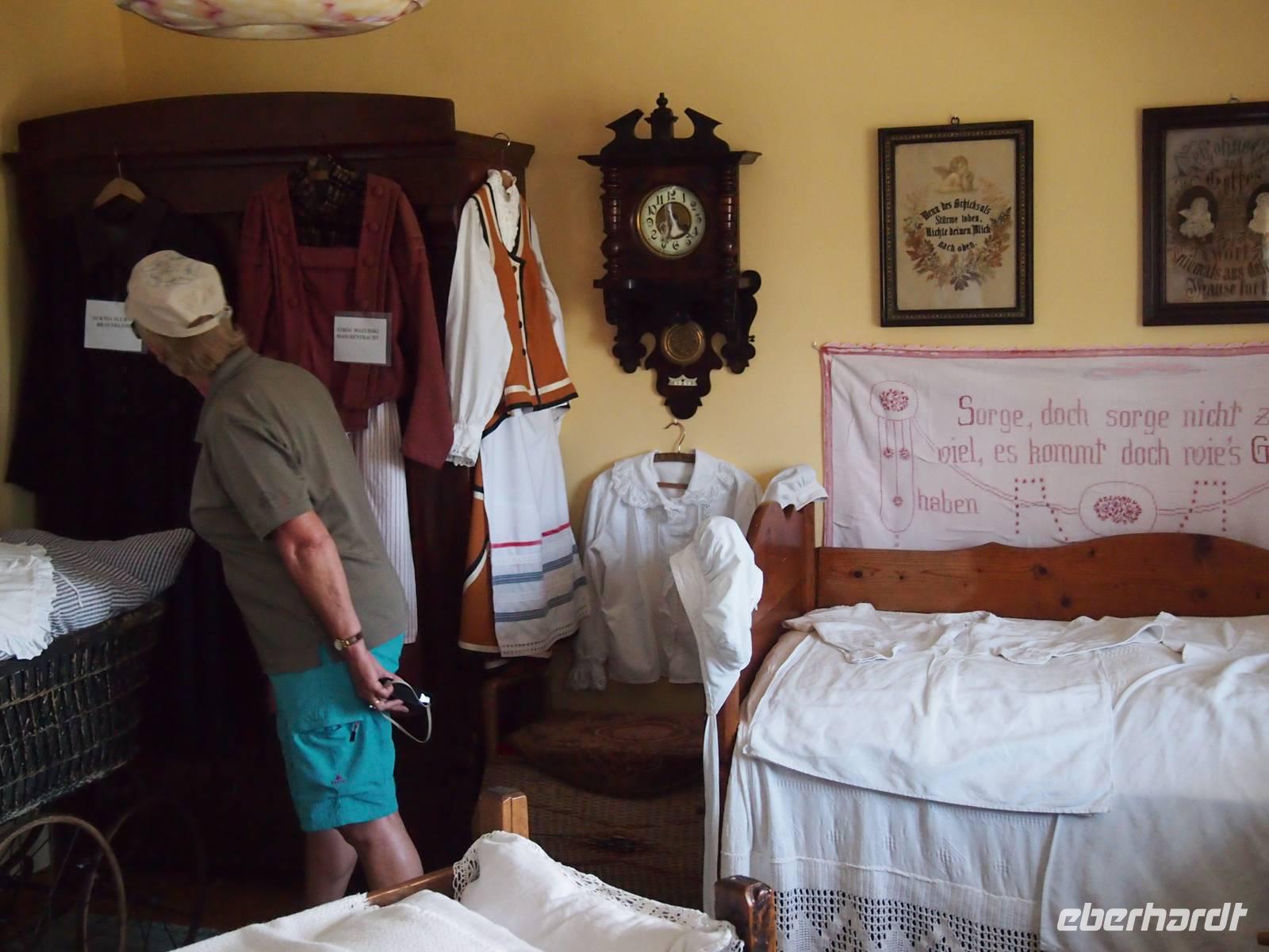 Erster Zwischenstopp war ein Bauernmuseum. Hier begrüßte uns die Hausherrin Christel, ein ostpreußisches Original. Sie erzählte uns viel über Ihre Familie und das Leben in ihrer Heimat. Anschließend besuchten wir das Museum. Viele Gäste fühlten sich dabei an ihre Kindheit und Jugend erinnert und entdeckten das ein oder andere davon in dem Museum. Jeder Raum wurde mit viel Liebe zum Detail gestaltet. Zum Mittag wurde für uns als Überraschung ein kleines Picknick vorbereitet, welches bei der Bäuerin im Garten stattfand. Wir saßen alle gemütlich beisammen und genossen das Zusammensein bei landestypischen Speisen. Christel gab uns noch zwei Witze mit auf den Weg, bevor es zum heutigen Etappenziel, unserem Hotel kurz vor Nikolaiken, ging. Dort angekommen teilte sich die Reisegruppe auf. Ein paar wenige wollten schon heute die 5 km entfernte Stadt Nikolaiken erkunden, andere brauchten erst einmal eine Abkühlung in dem gegenüberliegenden See.