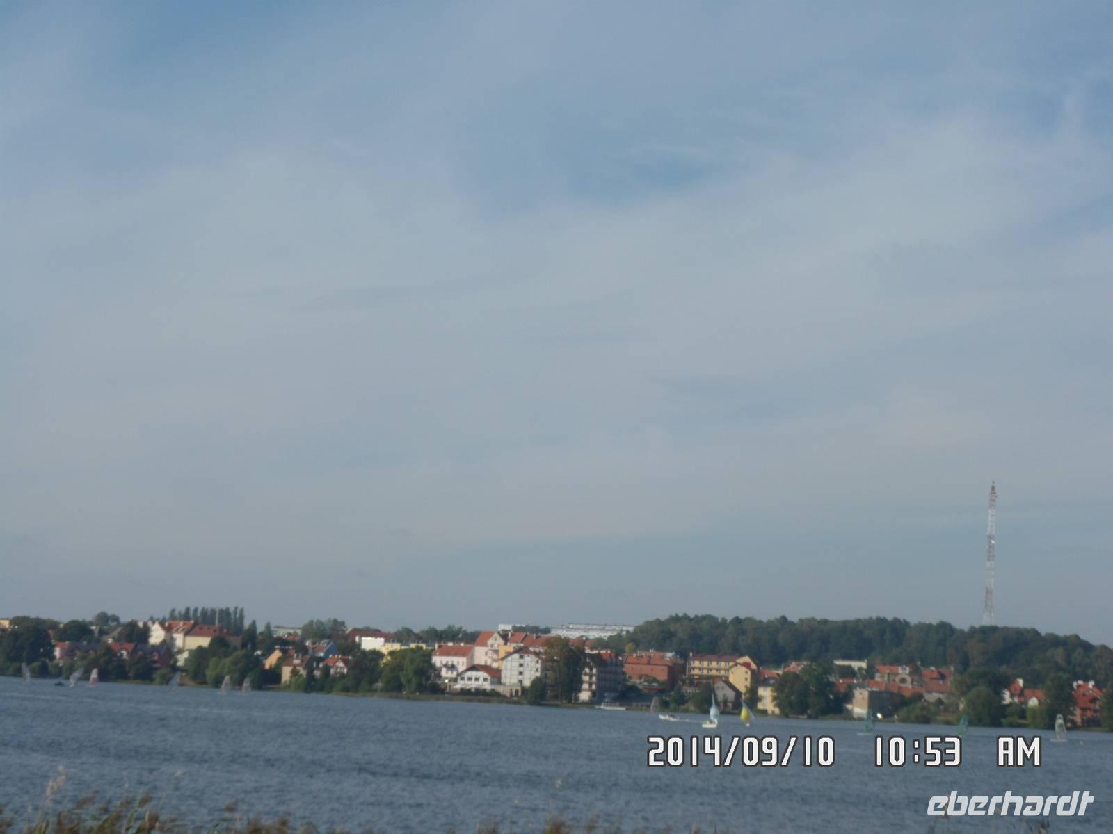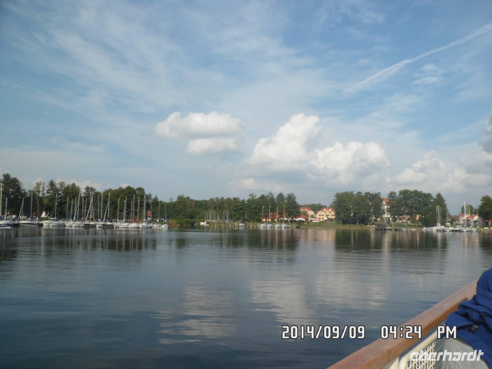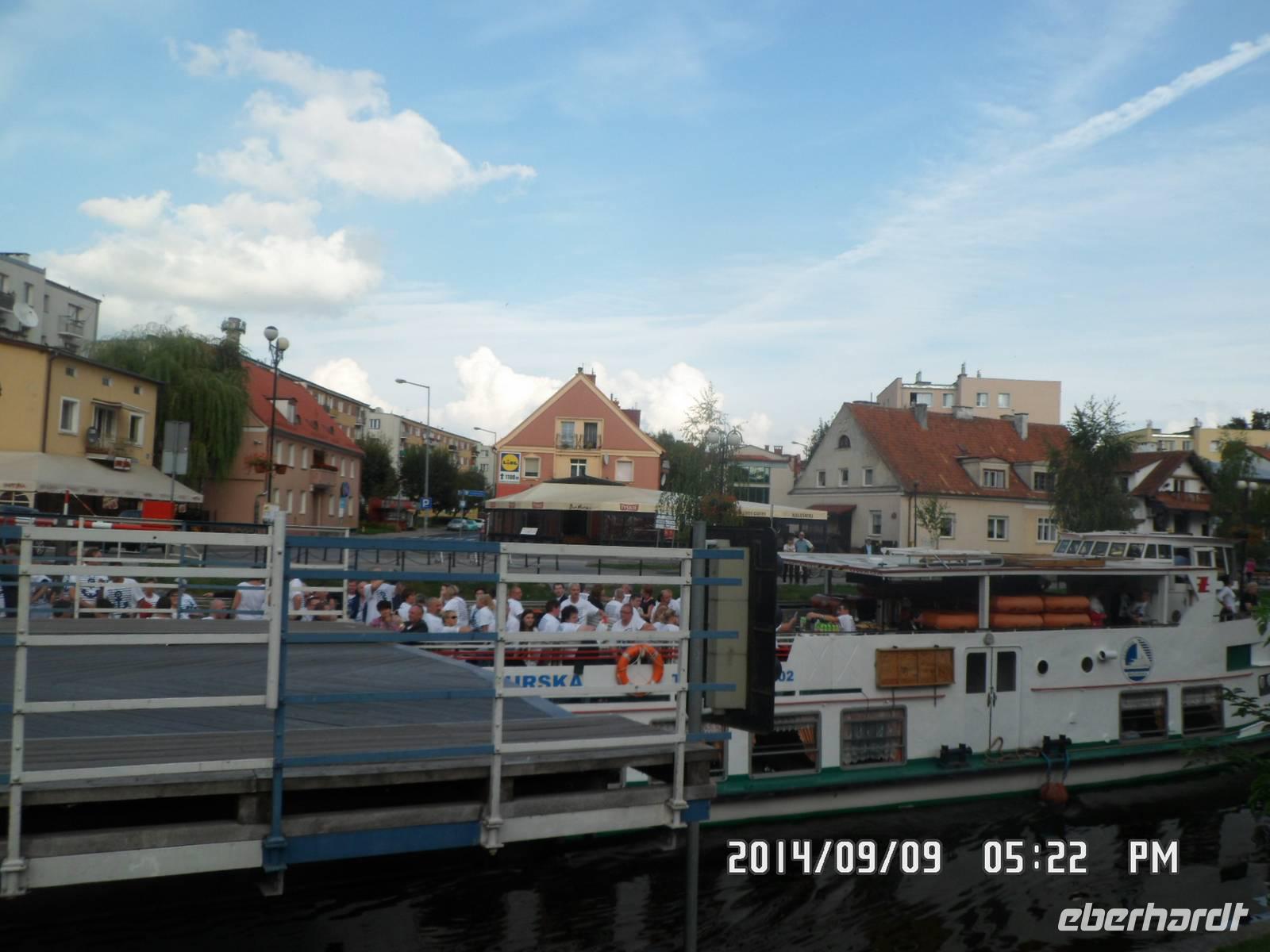 Nun verluden wir die Räder und bestiegen am schönen Hafen unser Schiff das uns nach Lötzen, der "Hauptstadt" der Masuren brachte. Bei Sonnenschein und sehr gutem Fischmittagessen , vorbei an der kahlen Komoraninsel glitten wir gemächlich über den glitzernden See wo auch Segelboote mit weißen Seegeln das Auge erfreute. In Lötzen wanderten wir bis zur Drehbrücke und schauten 16.00 Uhr dem Prozedere zu. Dann ließen wir uns noch ein Eis schmecken bevor es auf die Heimreise nach Mragono ging. Ein traumhafter Tag.
