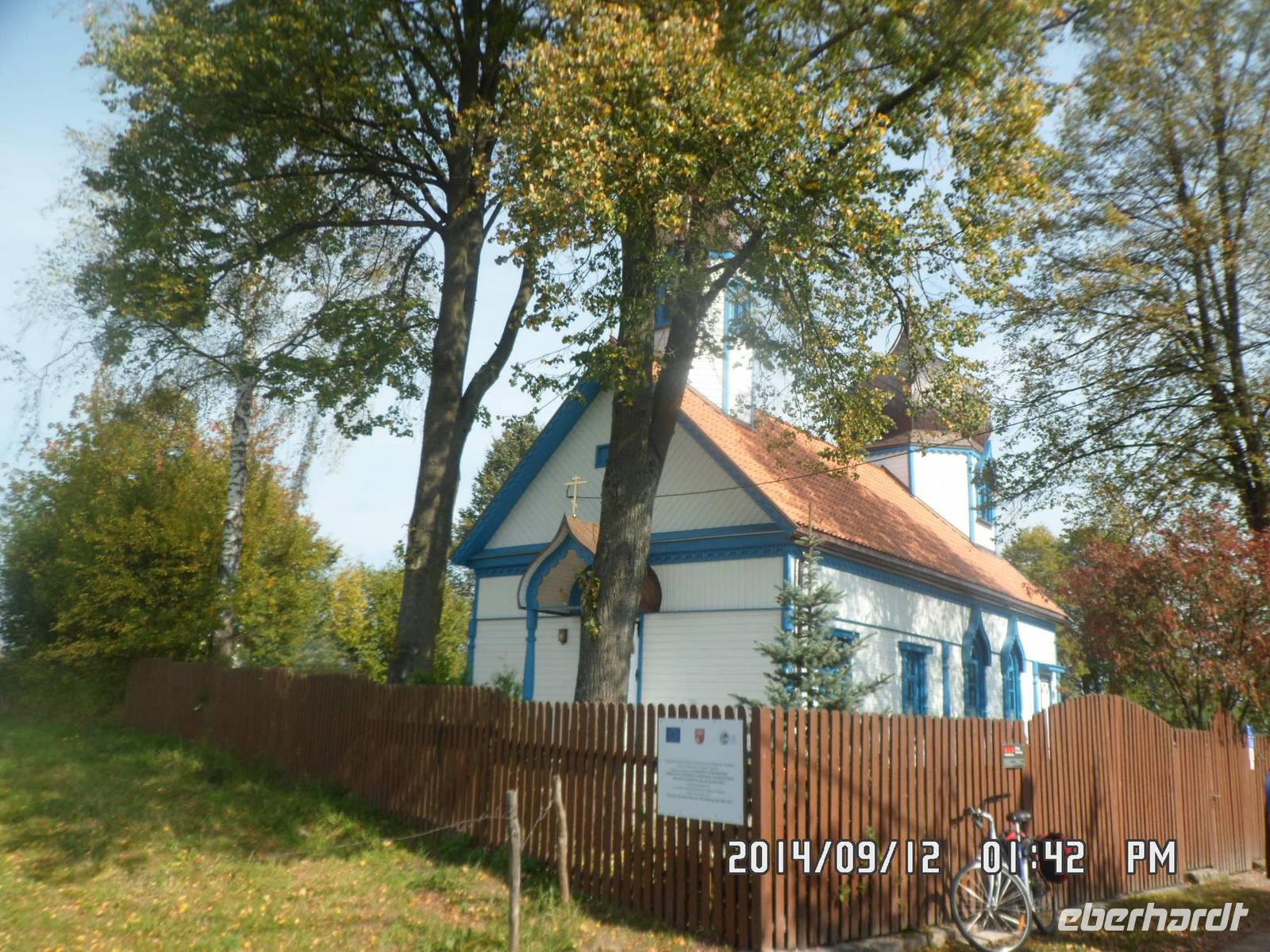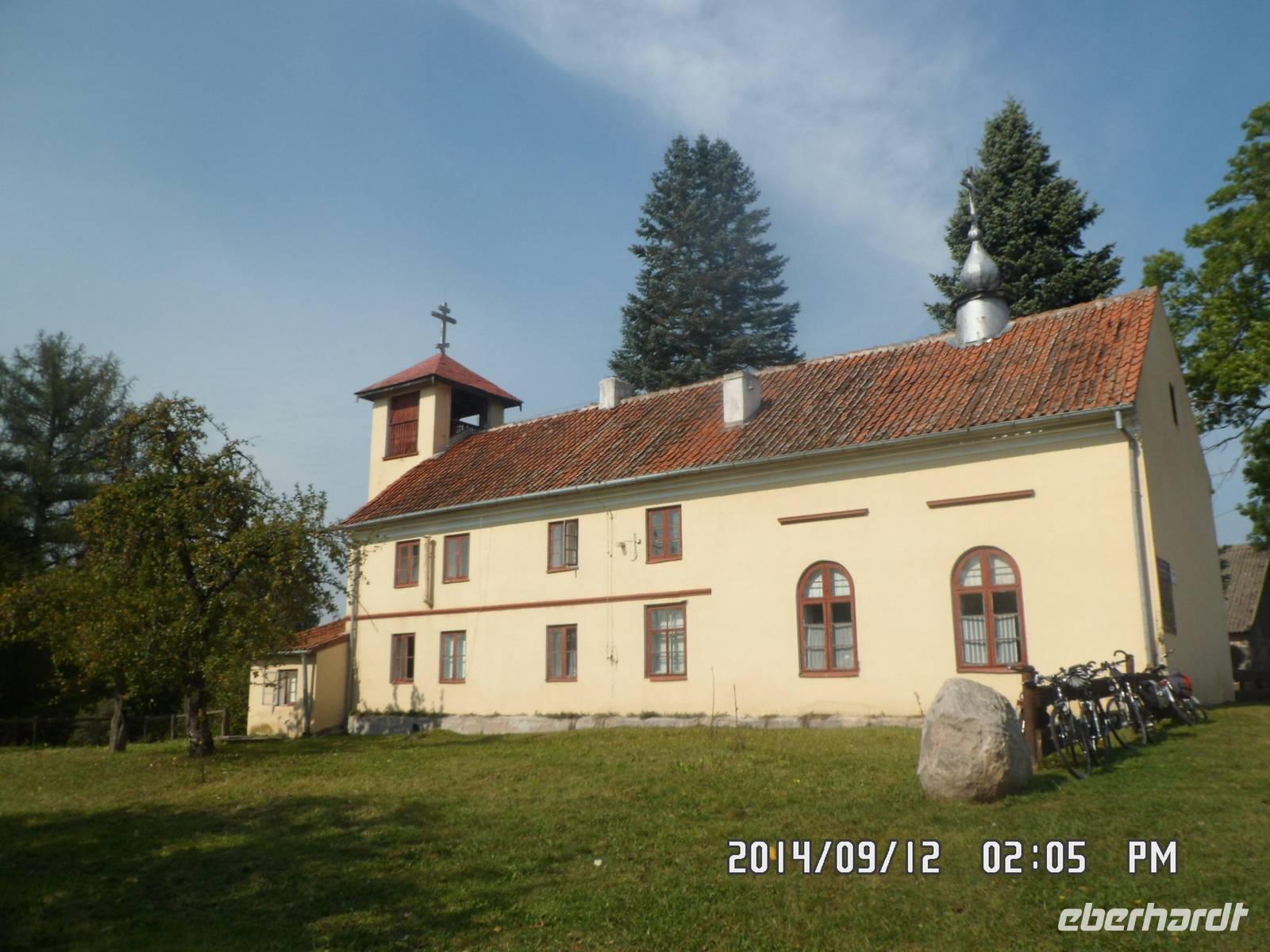 09.00 Uhr starten wir mit unseren Rädern ab Hotel . Wieder durch die herrliche Landschaft die uns den Herbst ankündigt, mit bunten Blättern an den Bäumen die im Licht golden leuchten. Wir fahren auf Feldwegen und kleinen Straßen durch die Dörfer über Ukta, wo wir eine russische Kirche von außen anschauen bis zum ehemaligen Philipponen-Kloster. Jetzt leben keine Nonnen mehr hier aber man kann es besichtigen und hören von Waldemar Geschichten aus diesem Leben.