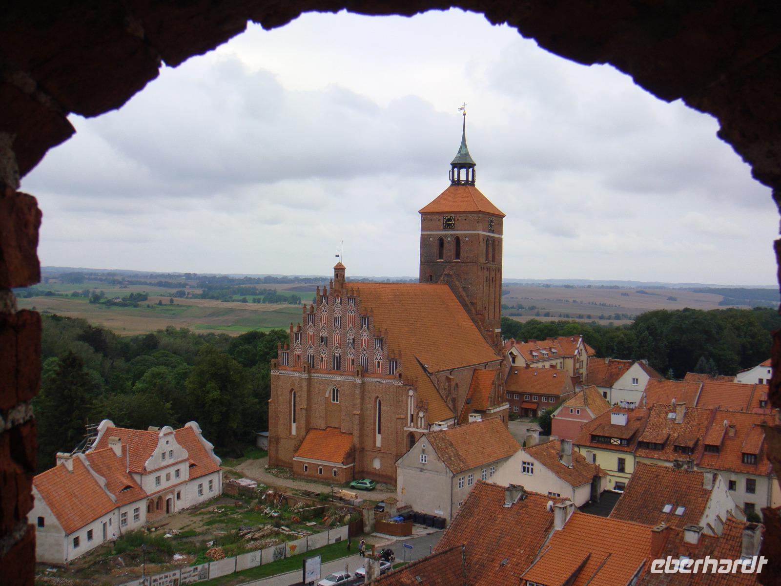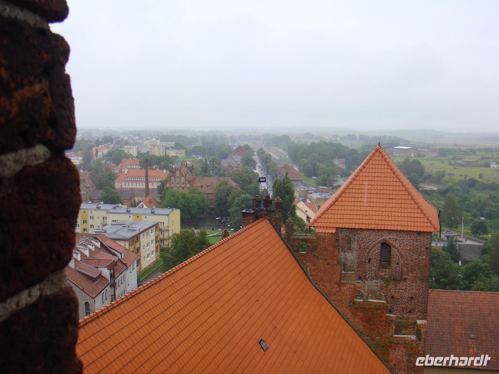 Unser Programm führt uns weiter nach Rössel, wo wir gleich die Chance ergreifen und die Räder ausladen. Wir radeln bis zur Bischofsburg. Da diese zur heutigen Zeit ein Hotel beherbergt, beschränkt sich unsere Besichtigung auf den Innenhof mit Brunnen und die Turmbesteigung. Von oben genießen wir einen schönen Blick auf den Ort Rössel.