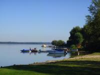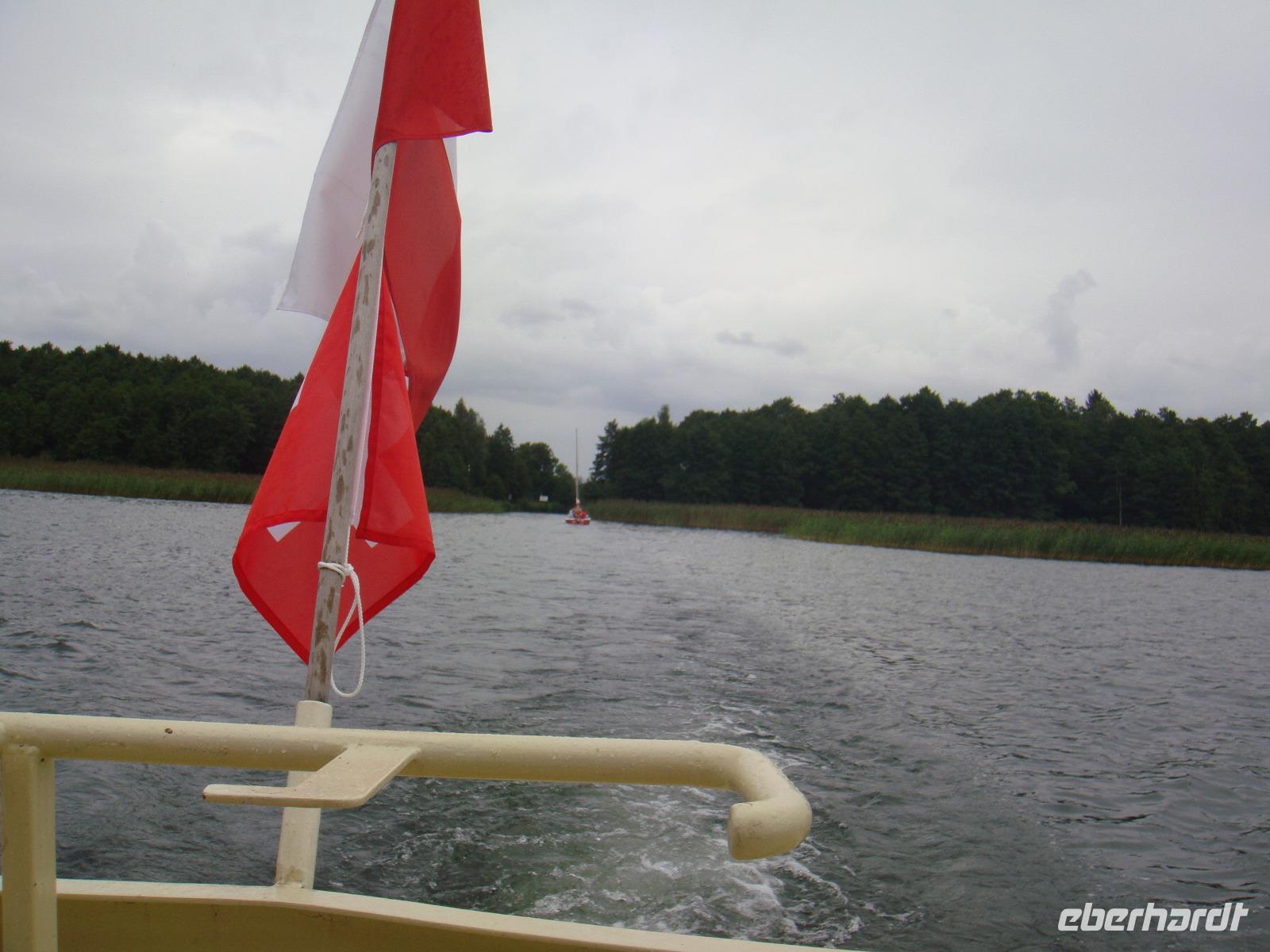 Während die Gruppe vieles über das Attentat auf Hitler durch Graf von Stauffenberg erfährt, laden Frank und ich die Räder aus. Und schon geht es über Rosengarten und entlang des Doben-Sees nach Steinort. Und wieder haben wir Glück gehabt. Wir kommen vor dem Regen an. Rasch nehmen wir die Räder wieder in den Anhänger und begeben uns an Bord unseres kleinen Ausflugsschiffes. Während der 2 stündigen Schifffahrt verwöhnen wir unsere Gaumen mit köstlichem Fisch und Fleisch. Inzwischen ist auch der Regen wieder vorbei und wir gehen alle an Deck. Die ausgeflogenen Kormorane begießen wir mit einem wohlschmeckenden „Krupnik".